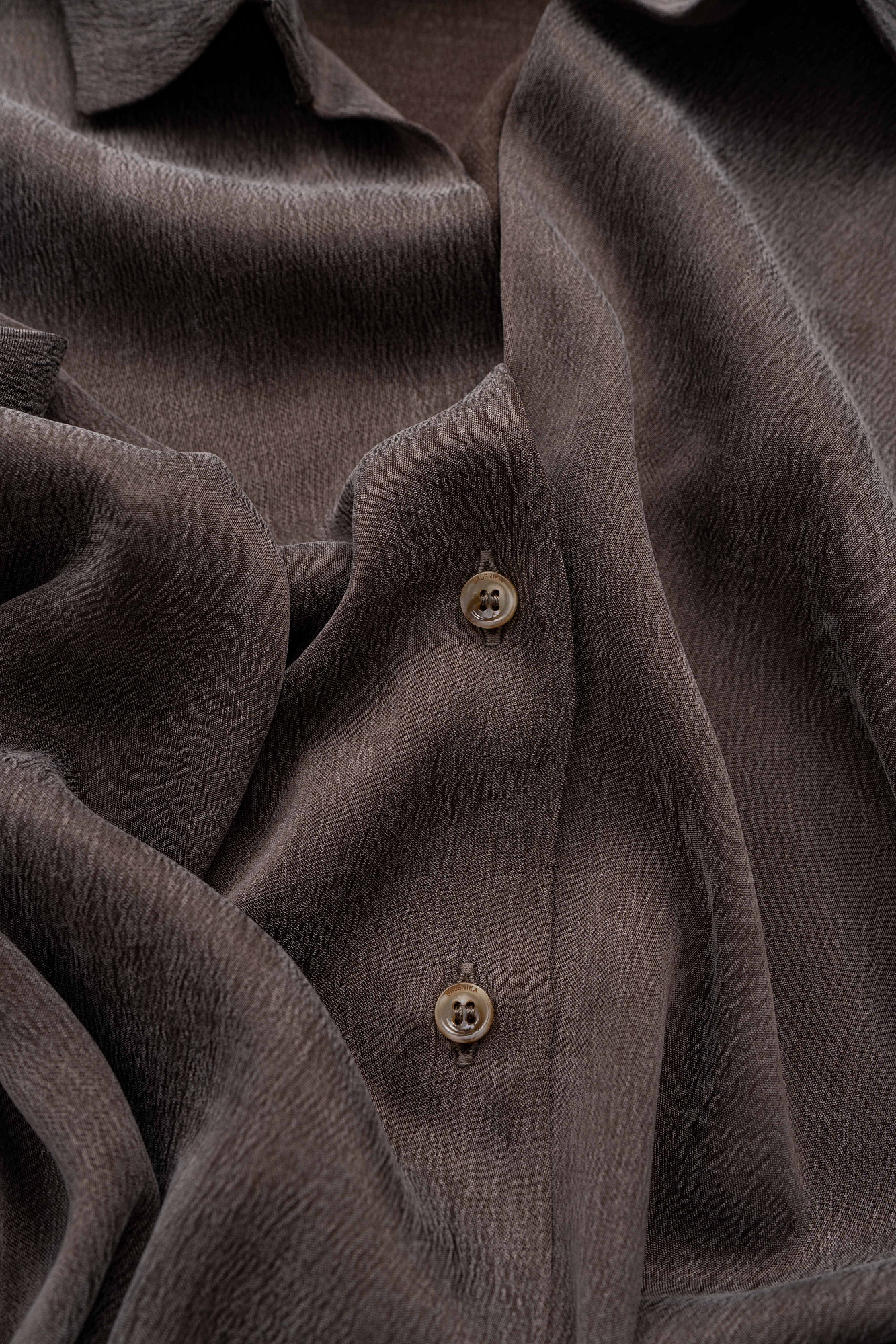 Рубашка из купры. Модель свободного кроя, с отложным воротником, V-образным вырезом, длинными рукавами с манжетами на пуговицах.
