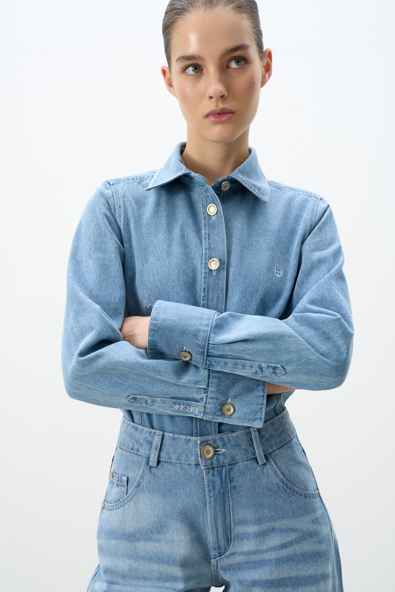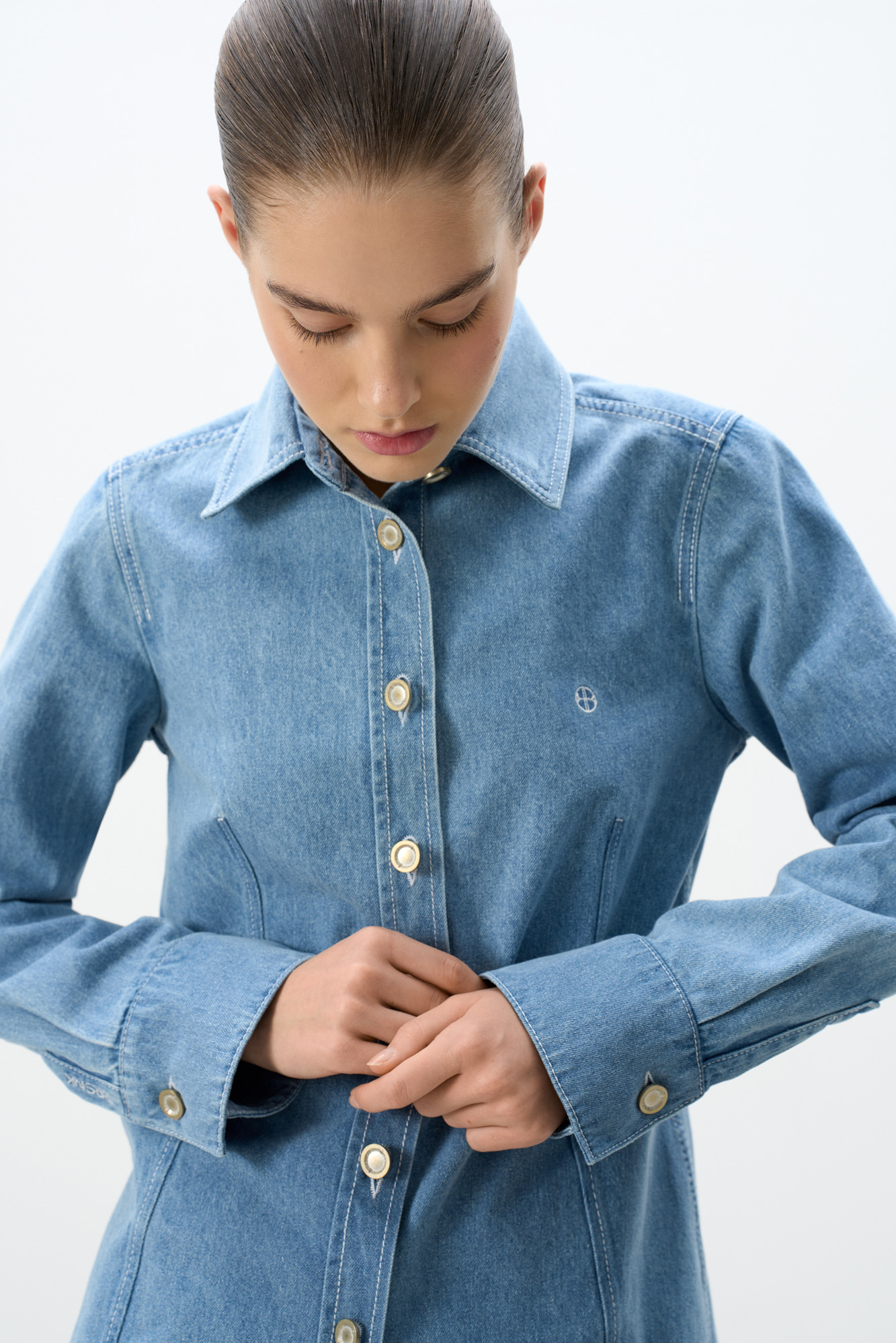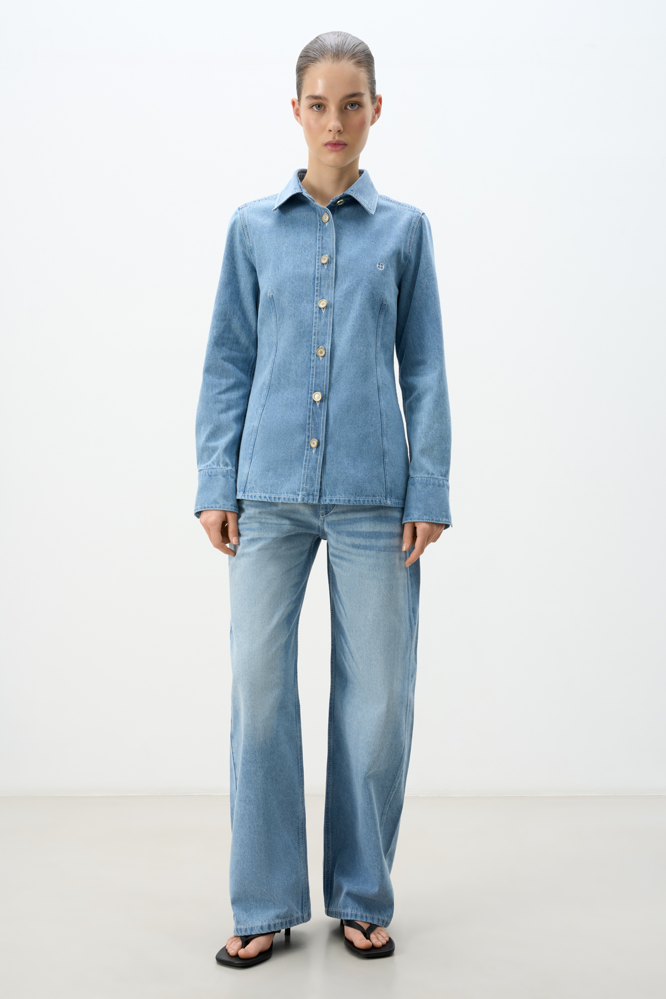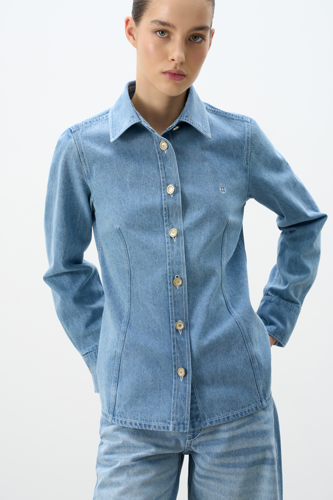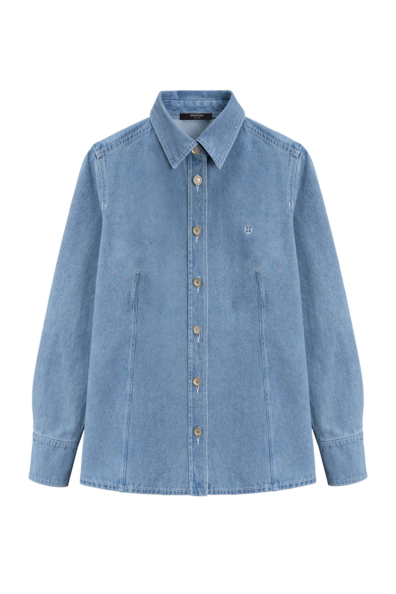 Джинсовая рубашка из 100% хлопка. Модель приталенного силуэта с классическим отложным воротником и длинными рукавами с манжетами на пуговицах. Застежка на пуговицы. Изделие декорировано вышитым логотипом бренда на груди.