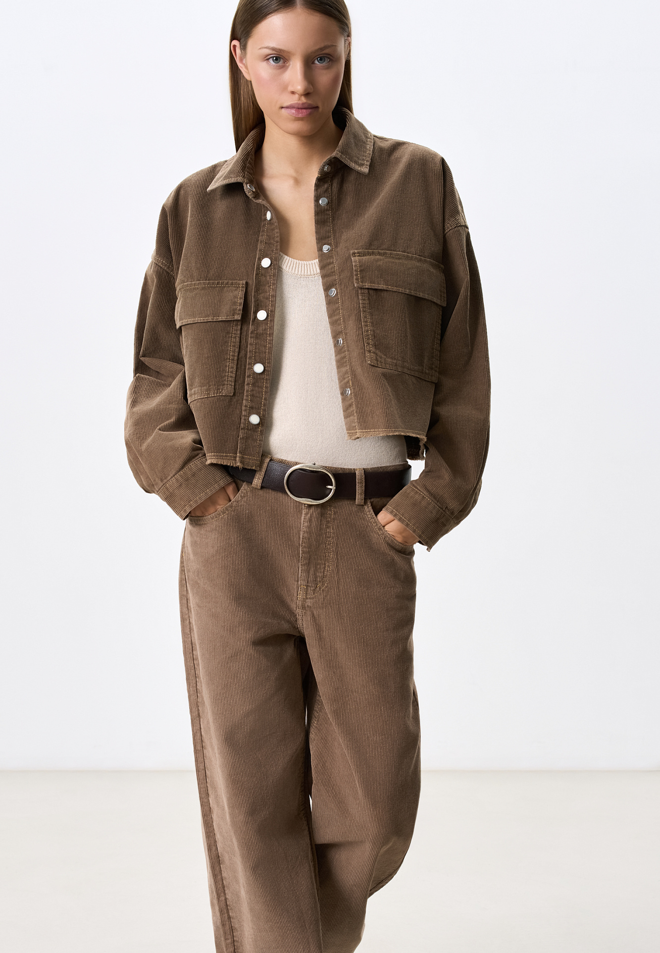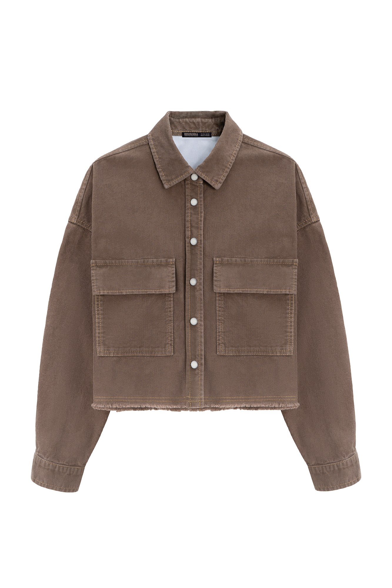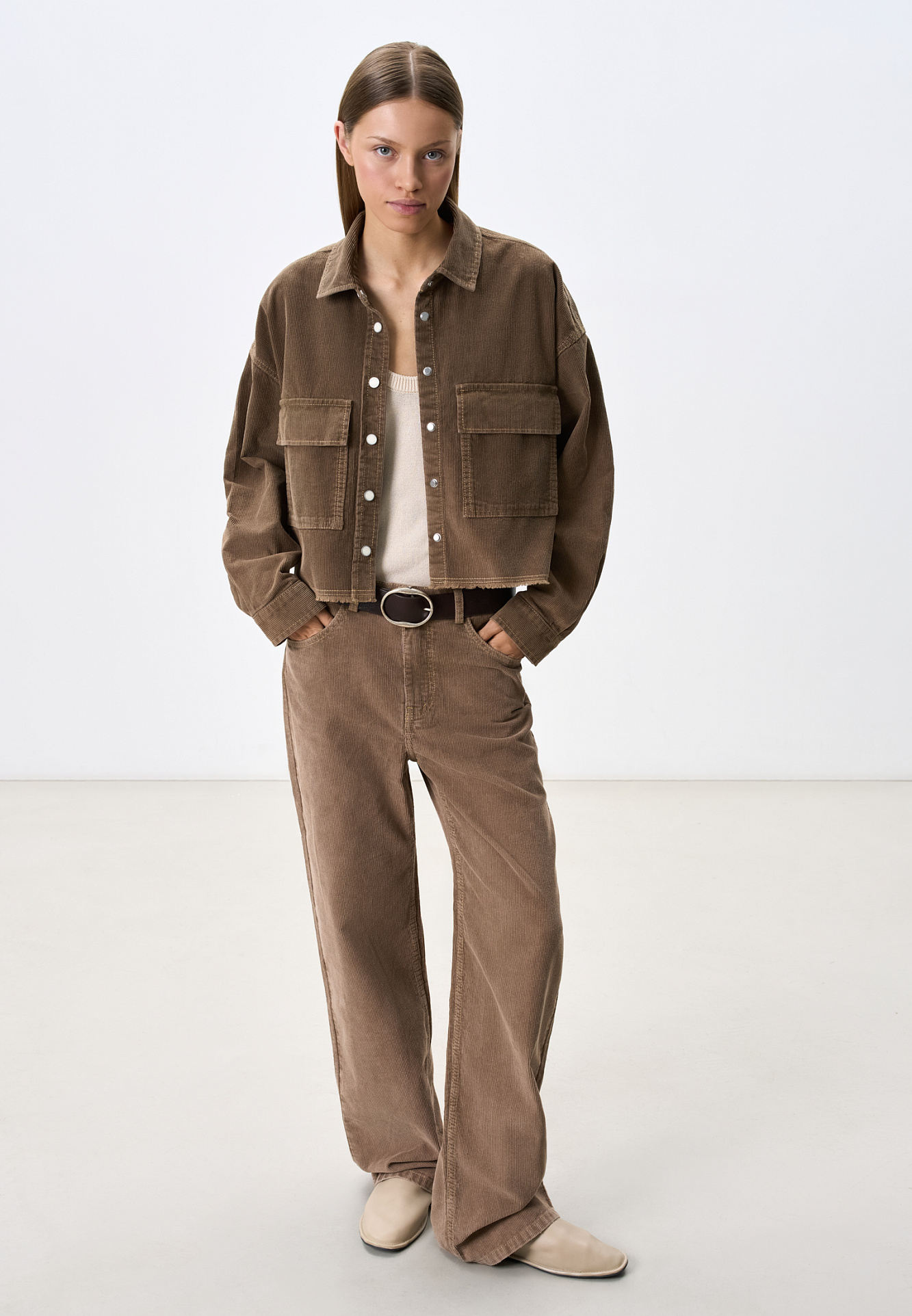 Укороченная вельветовая рубашка из 100% хлопка. Модель свободного кроя со спущенной линией плеч, классическим отложным воротником и двумя накладными карманами с клапанами. Низ изделия выполнен с имитацией необработанного края. Застежка на кнопки. Без подкладки.