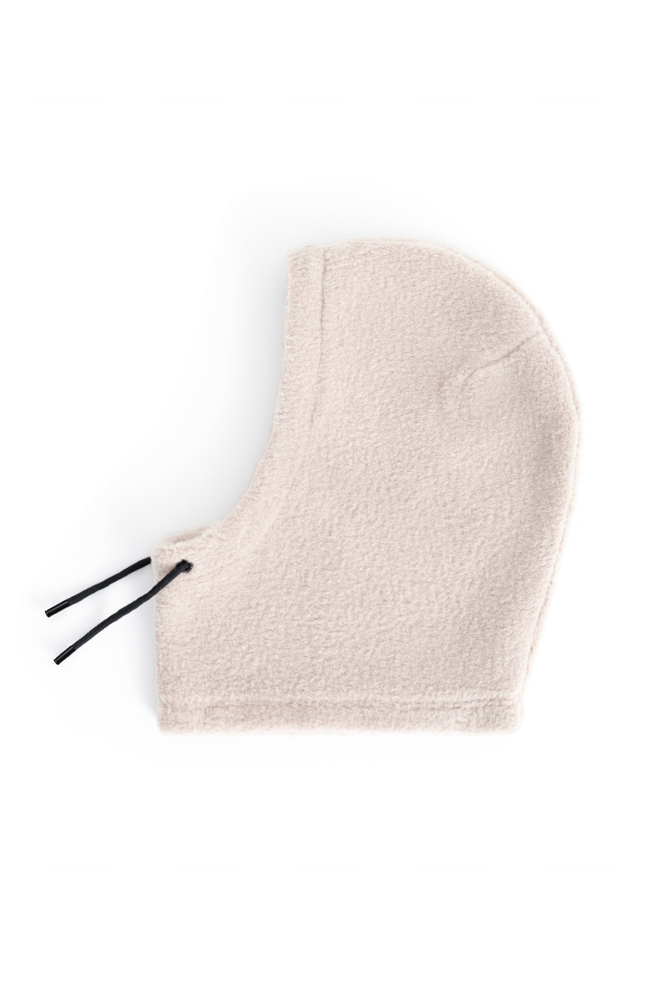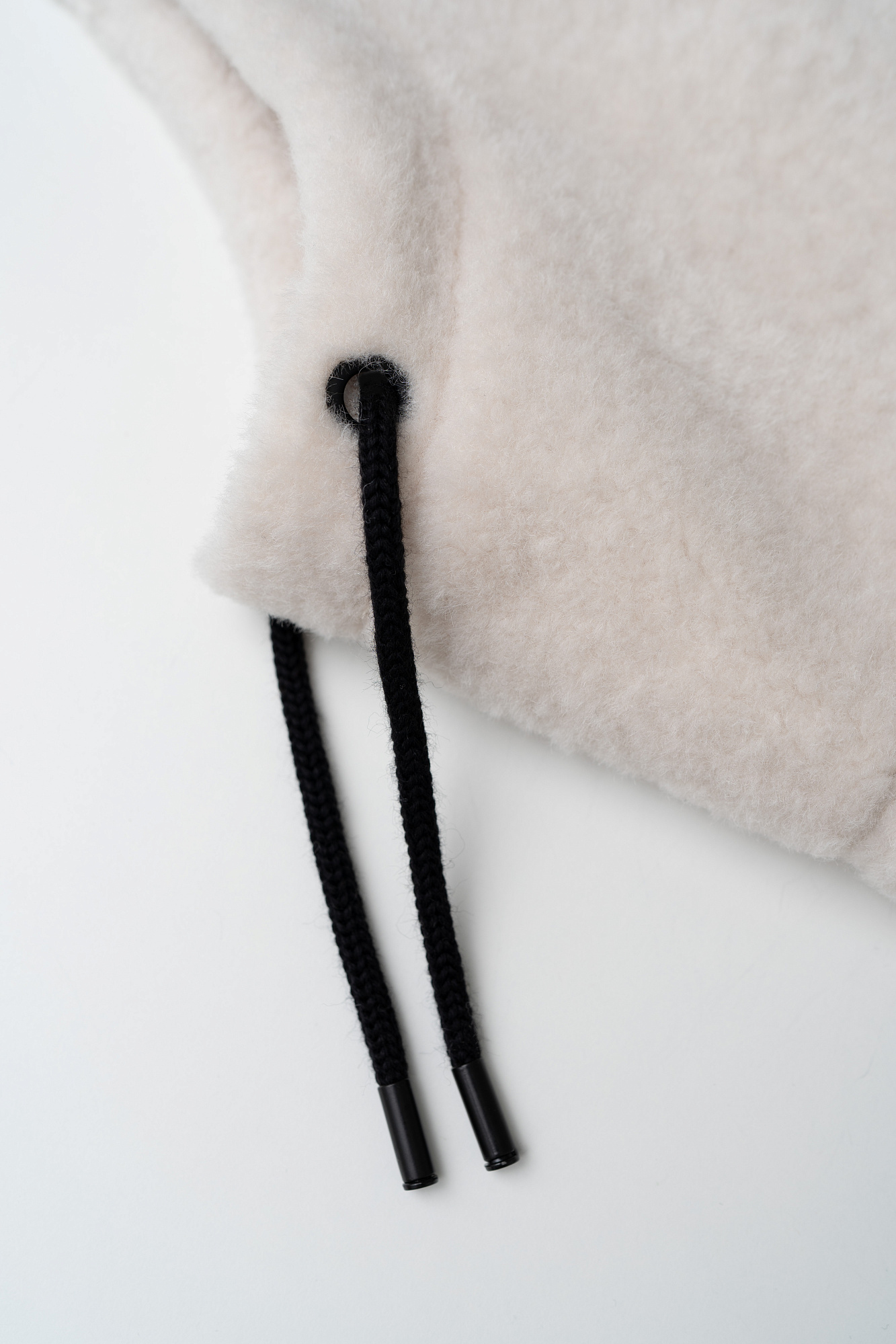 Капюшон из экомеха на кулиске с подкладкой. Дополнить образ можно варежками в таком же стиле.