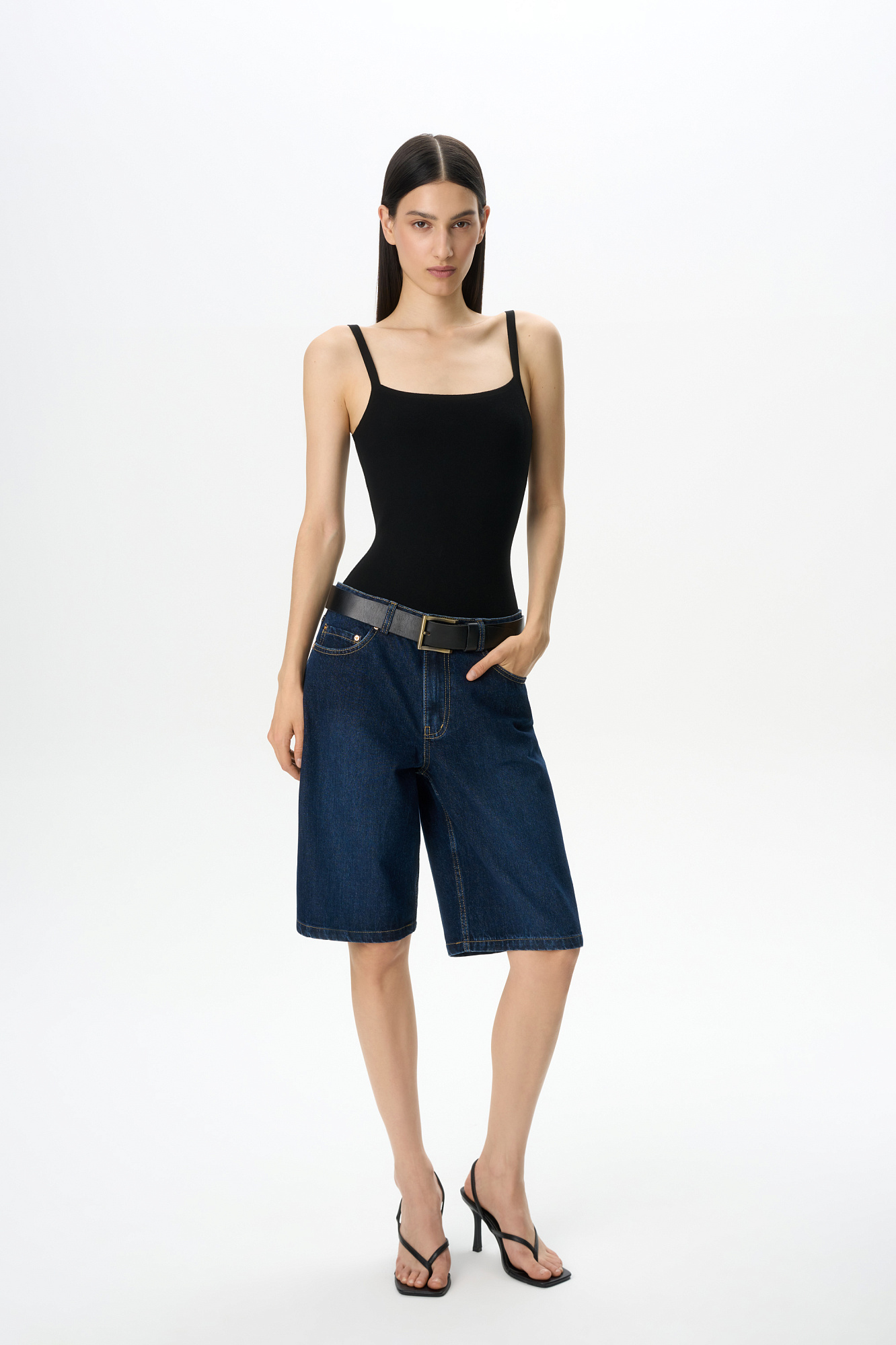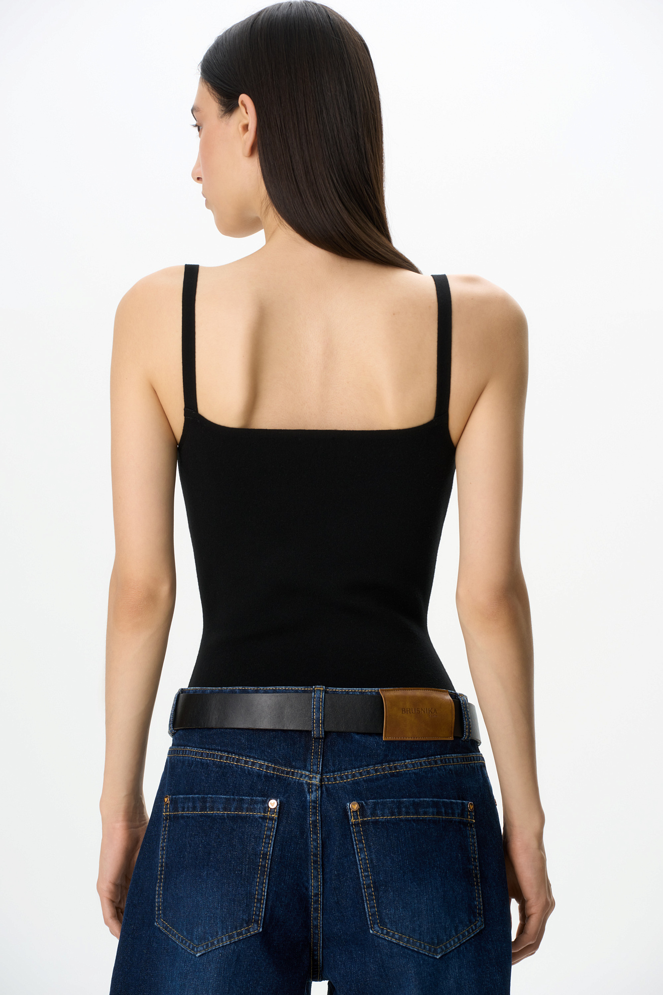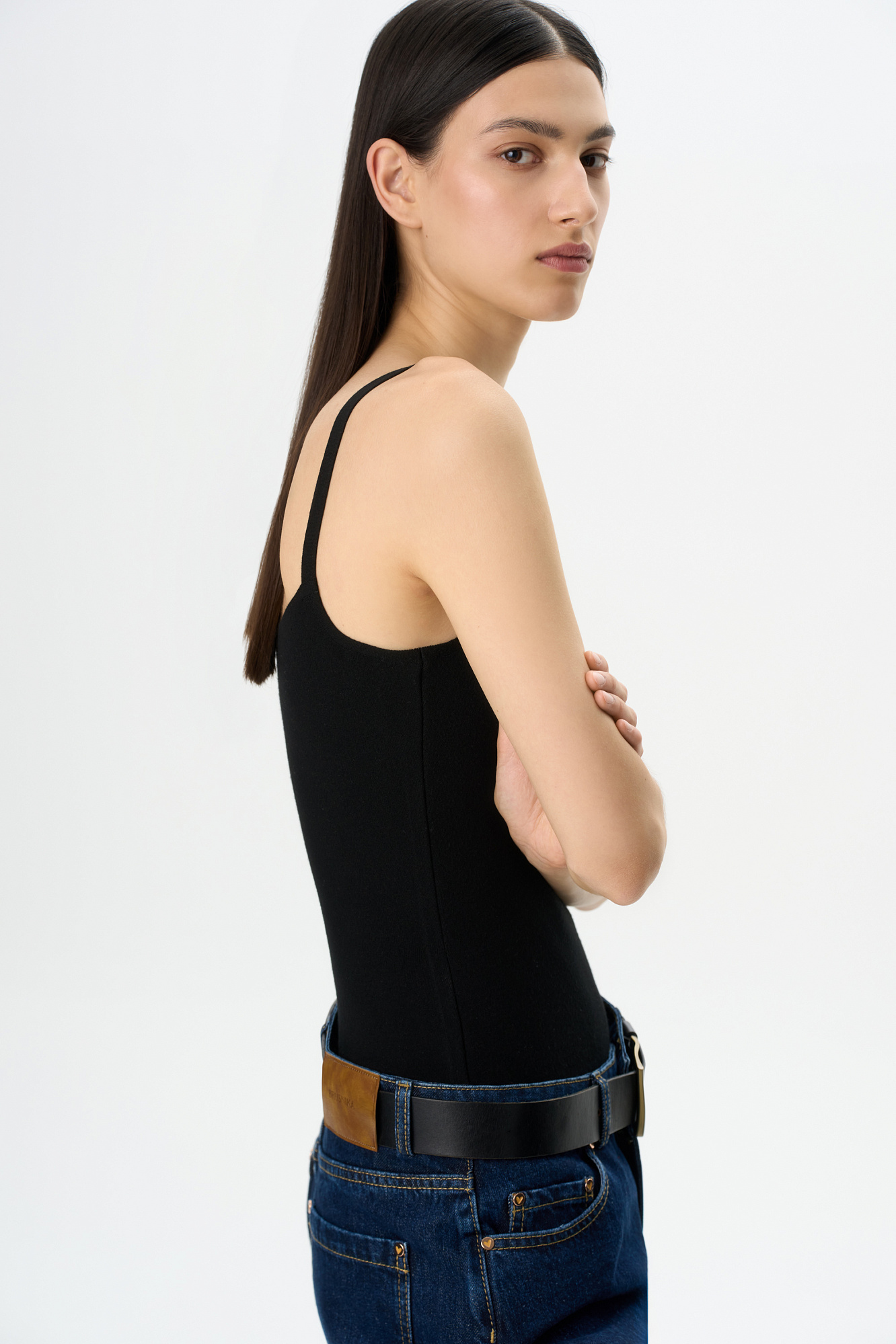 Трикотажное боди из вискозы. Модель приталенного силуэта на тонких бретелях и глубоким вырезом. Изделие застегивается на крючки.