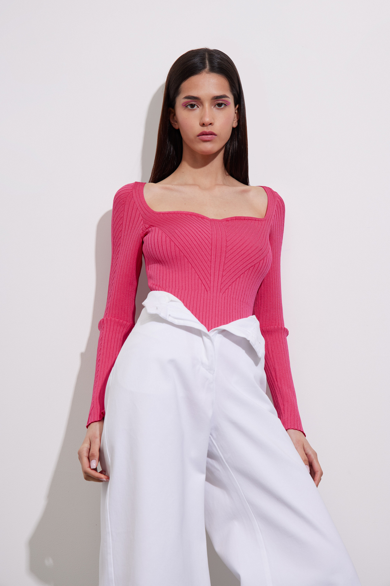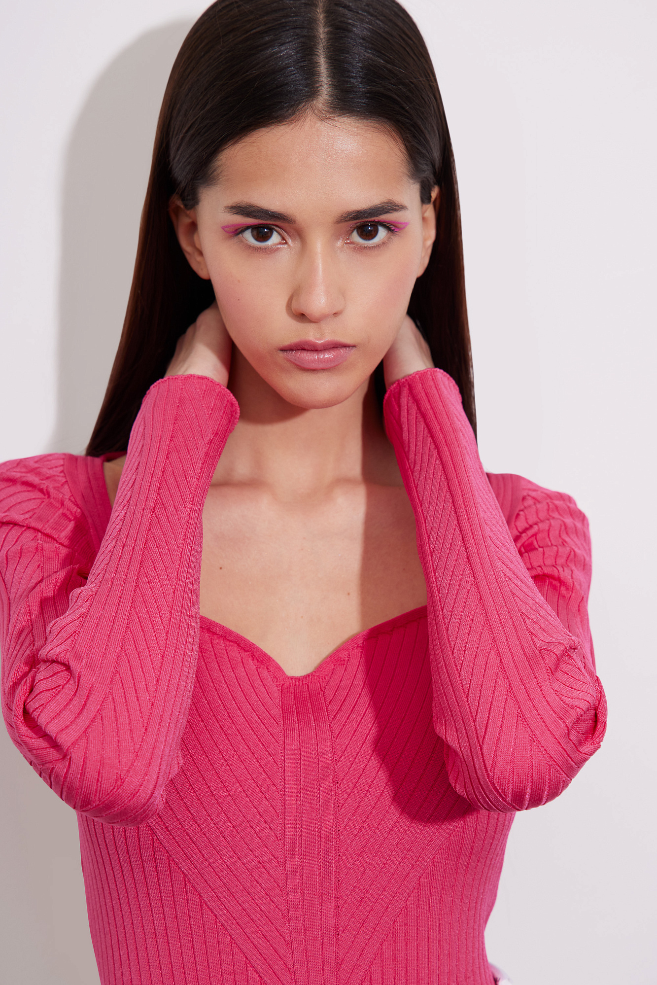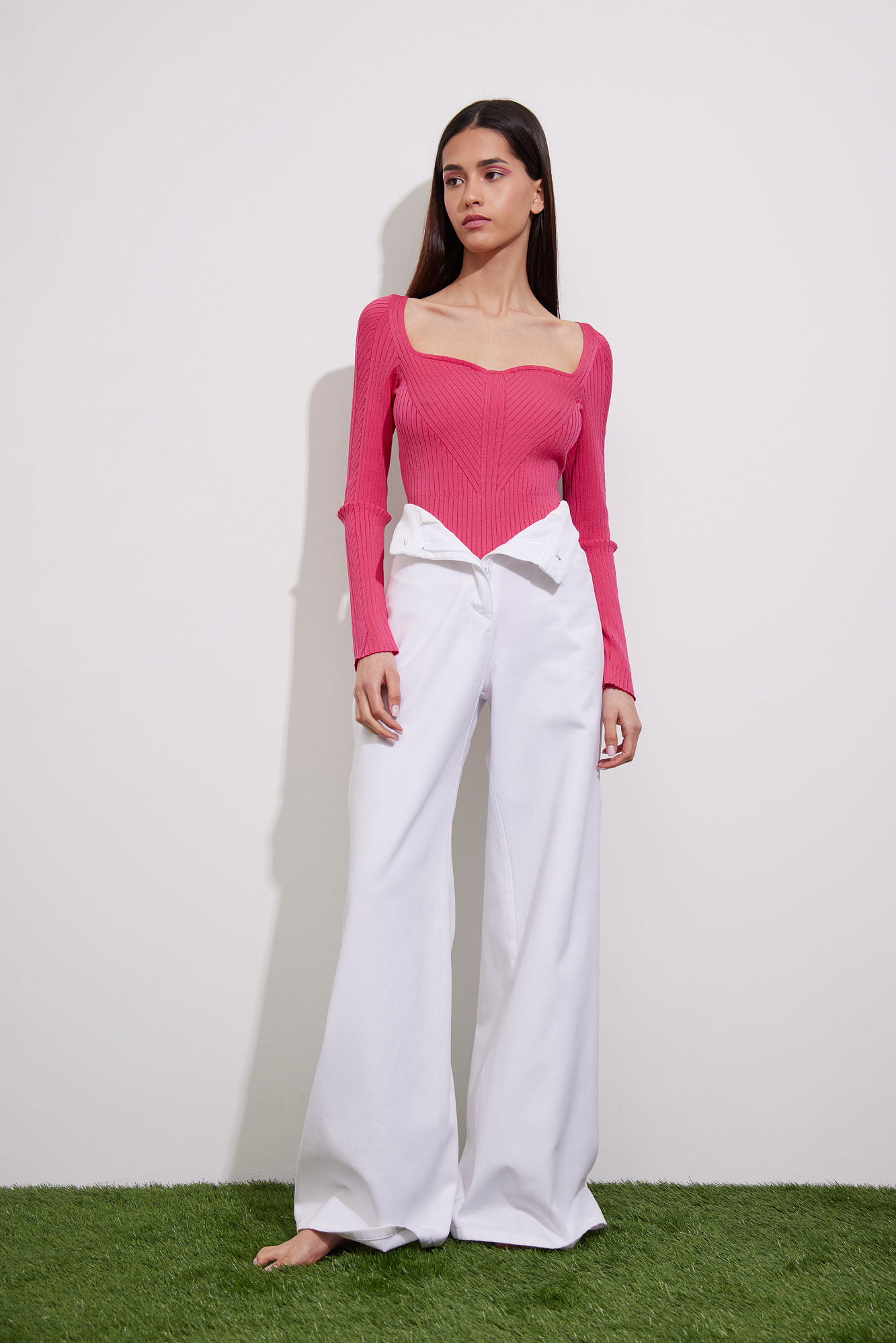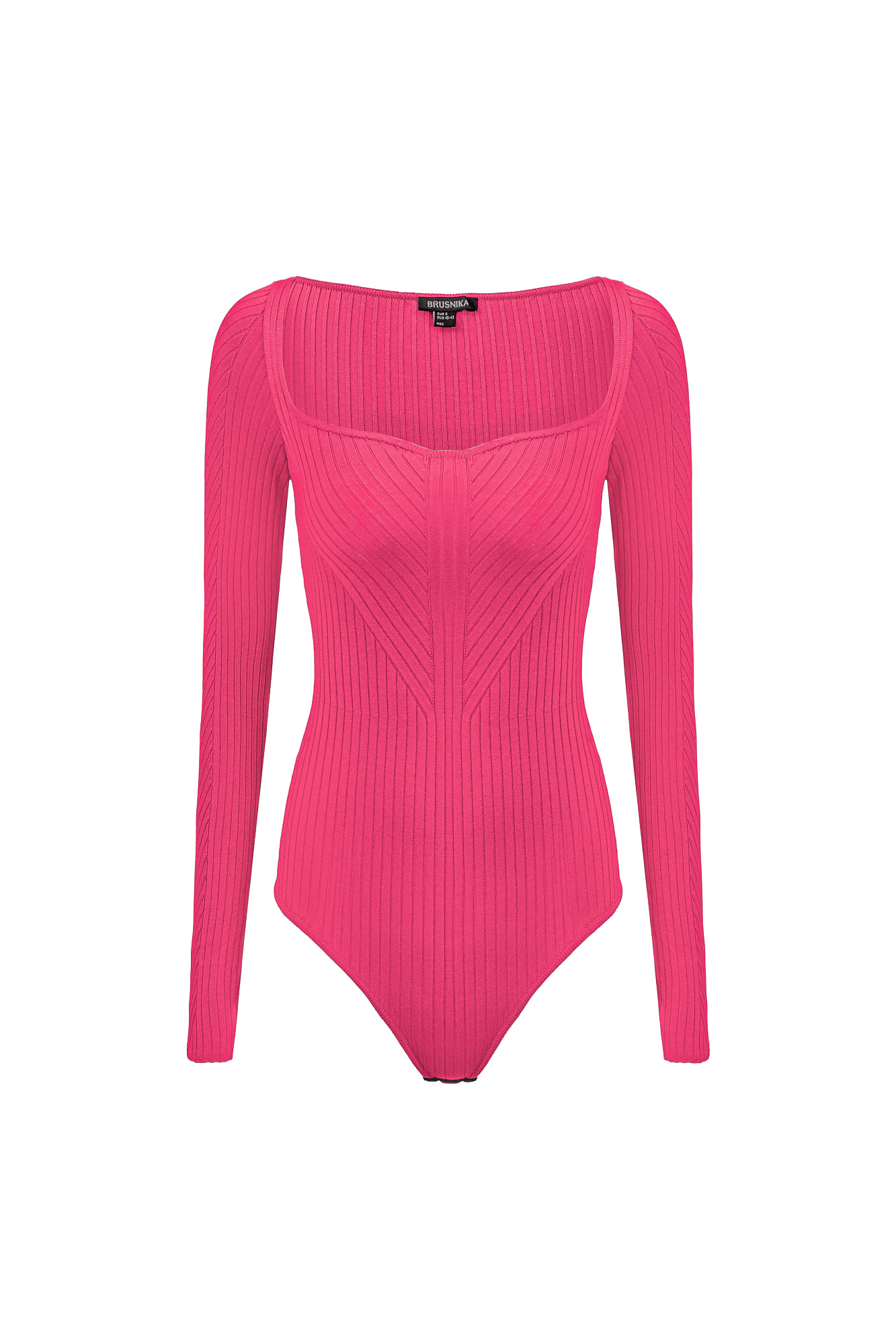 Трикотажное боди из вискозы. Модель с длинным рукавом и фигурным вырезом горловины. Изделие выполнено в широкий диагональный рубчик.
