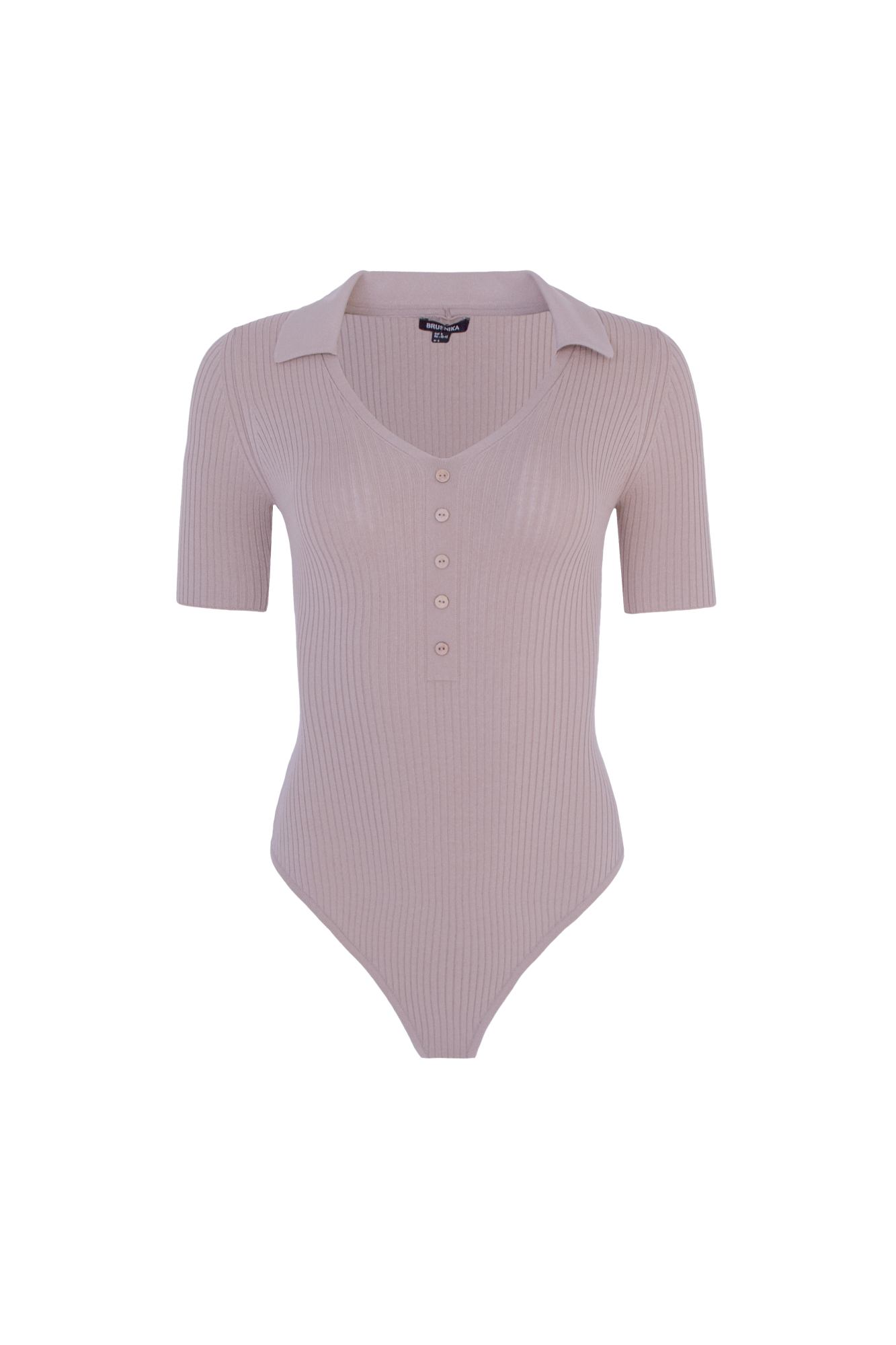 Трикотажное боди из вискозы в рубчик. Модель V-образный вырезом горловины, отложным воротником и коротким рукавом. Изделие декорировано небольшими пуговицами. Застежка на бельевые крючки.