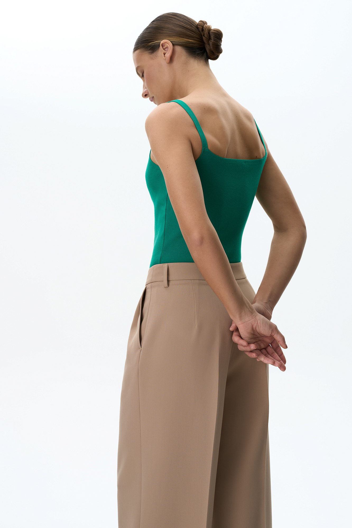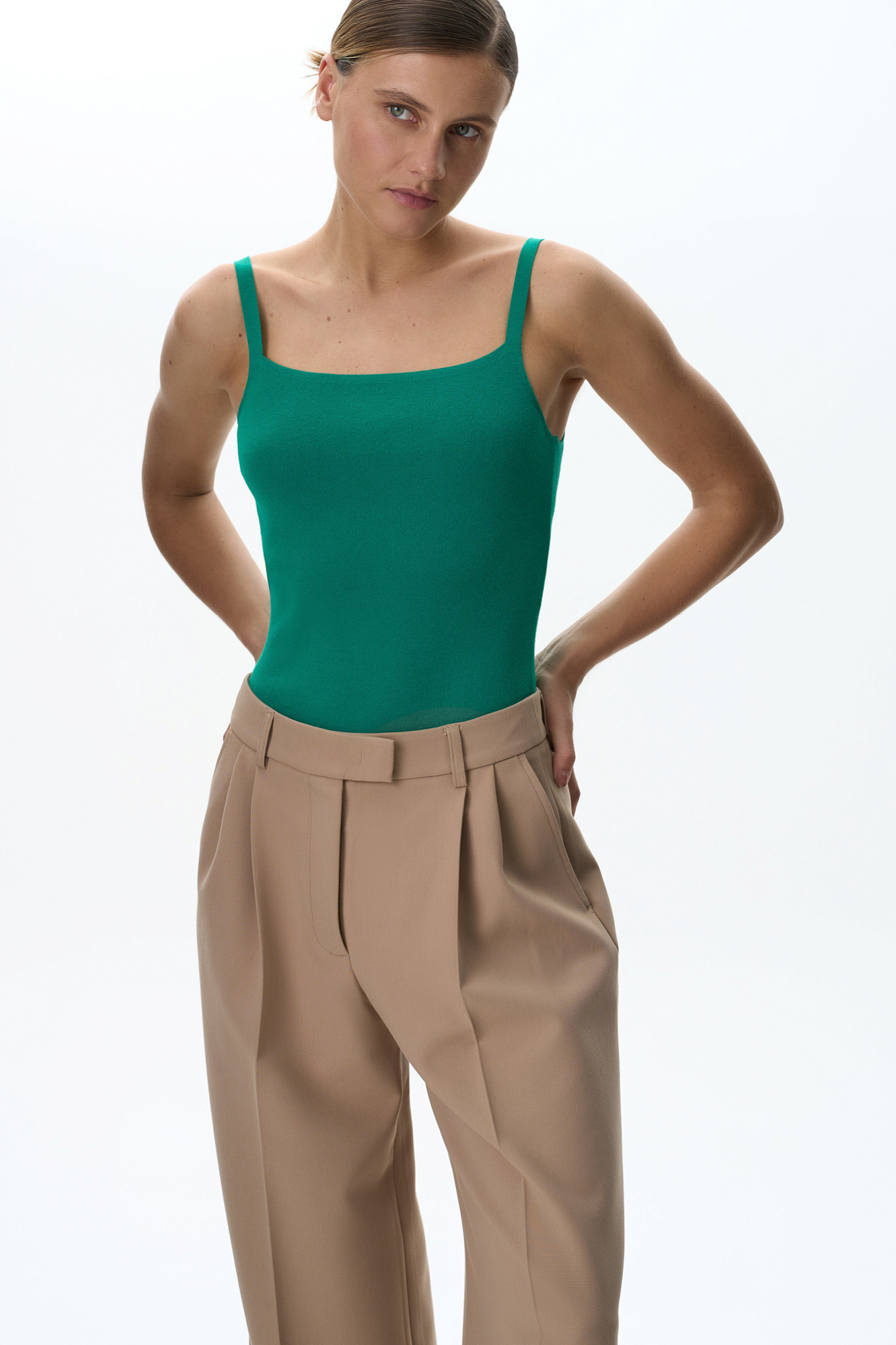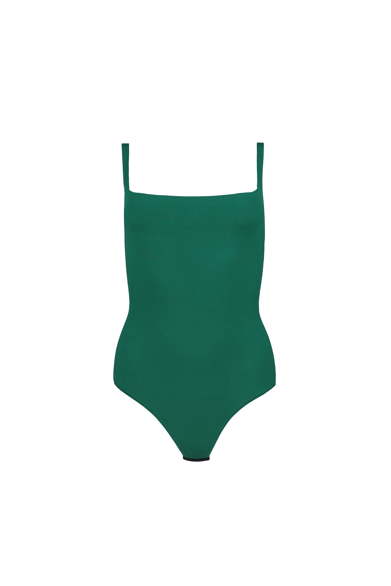 Трикотажное боди из вискозы. Модель приталенного силуэта на тонких бретелях и глубоким вырезом. Изделие застегивается на крючки.