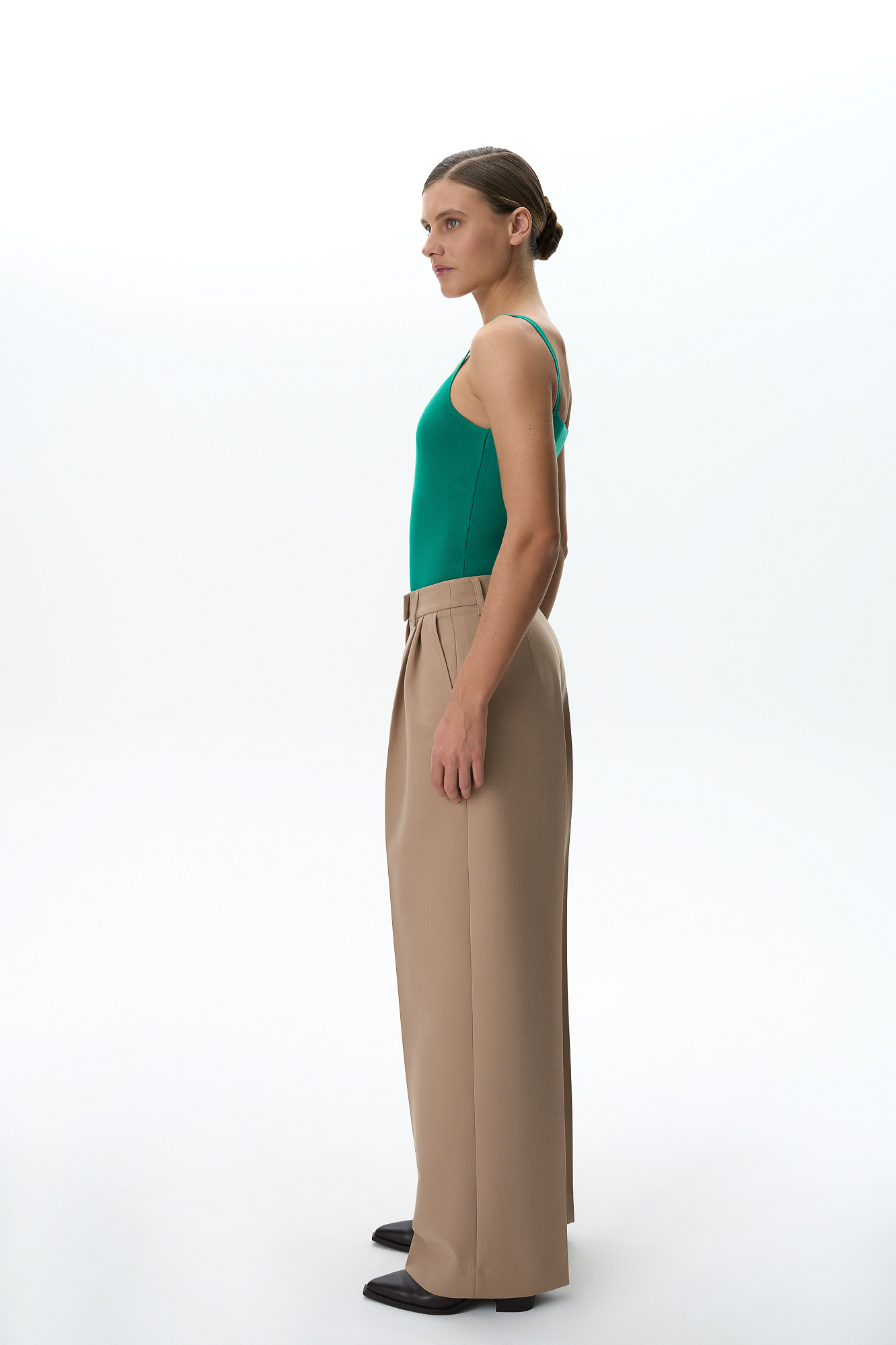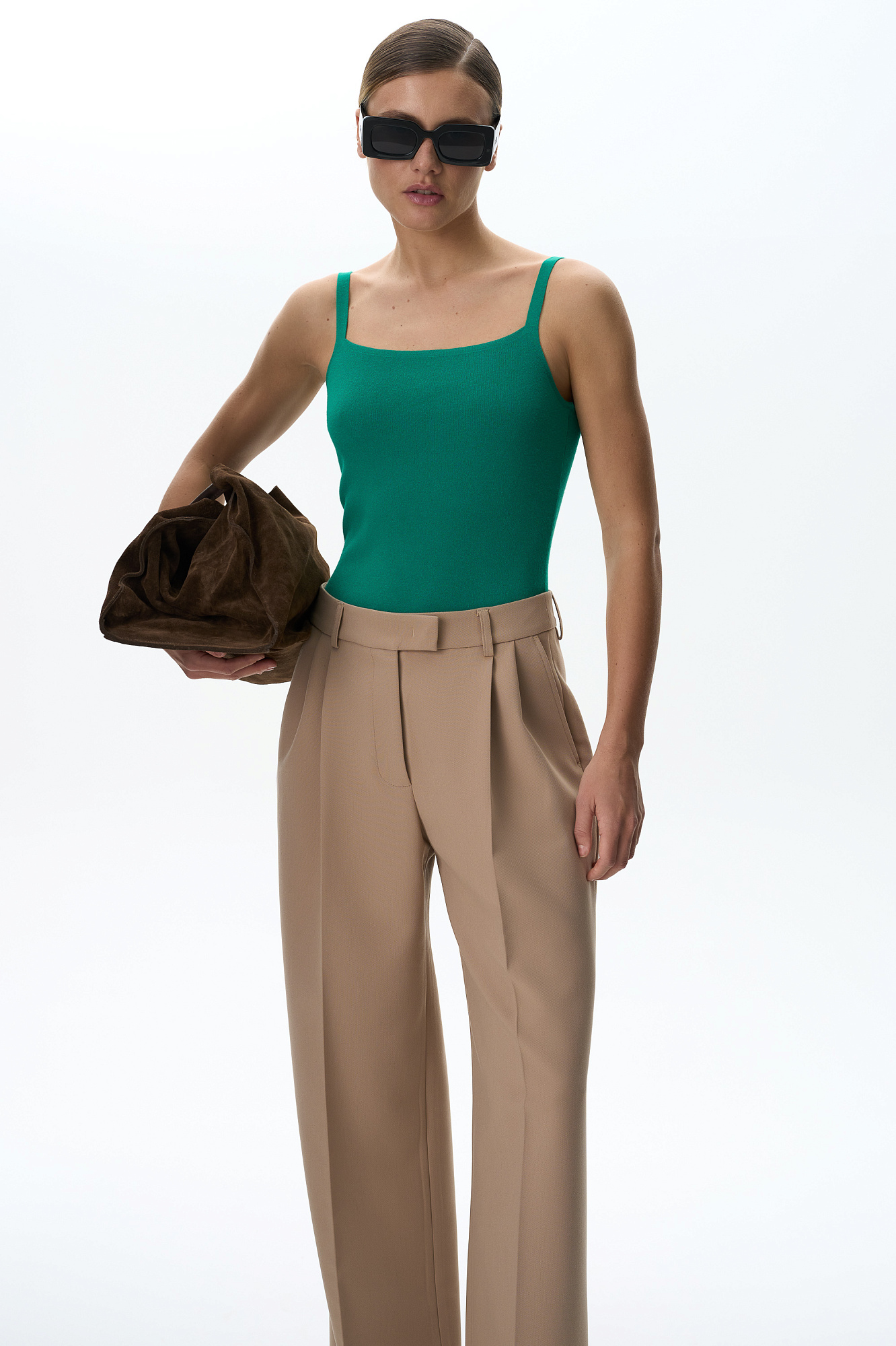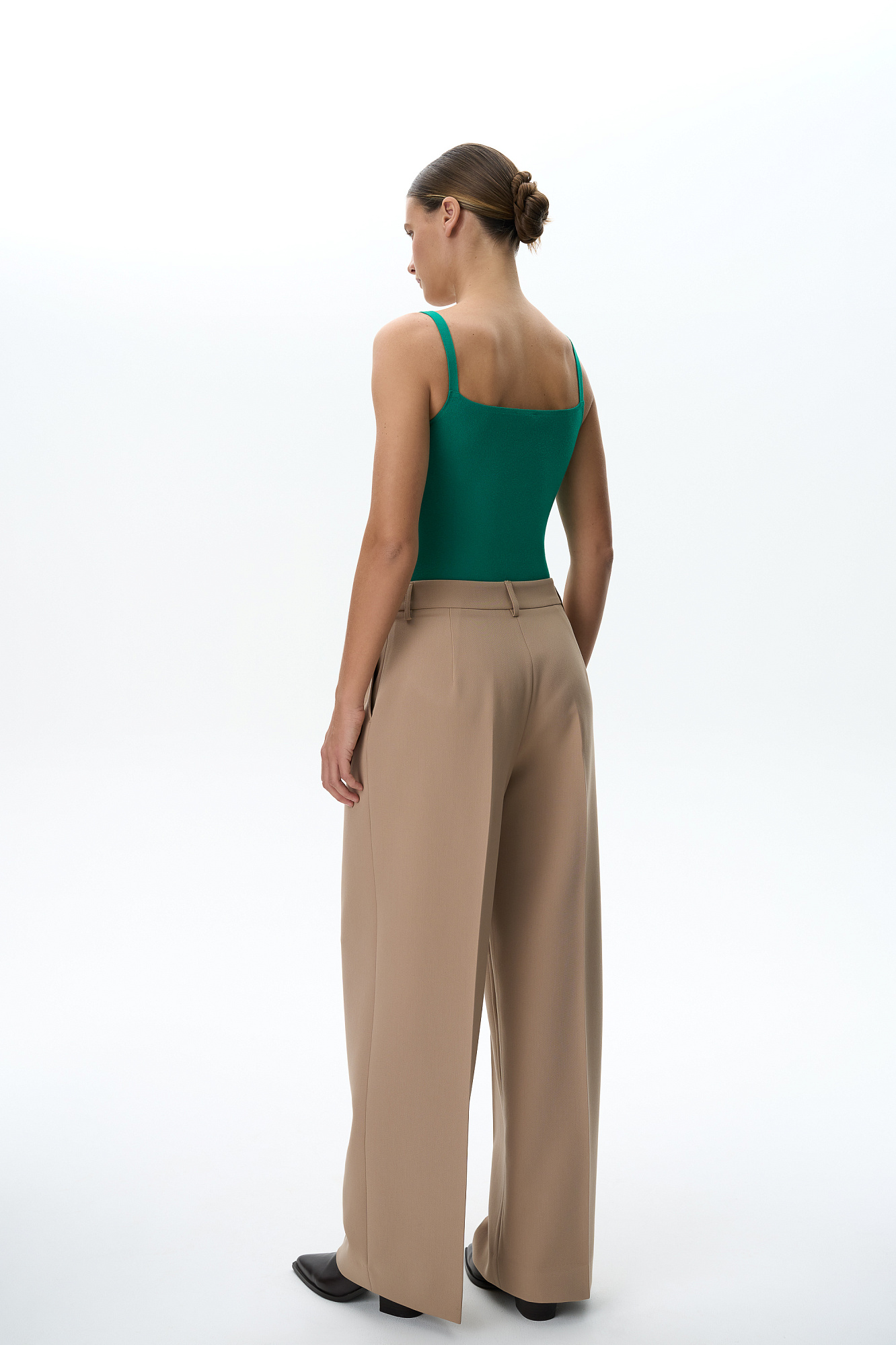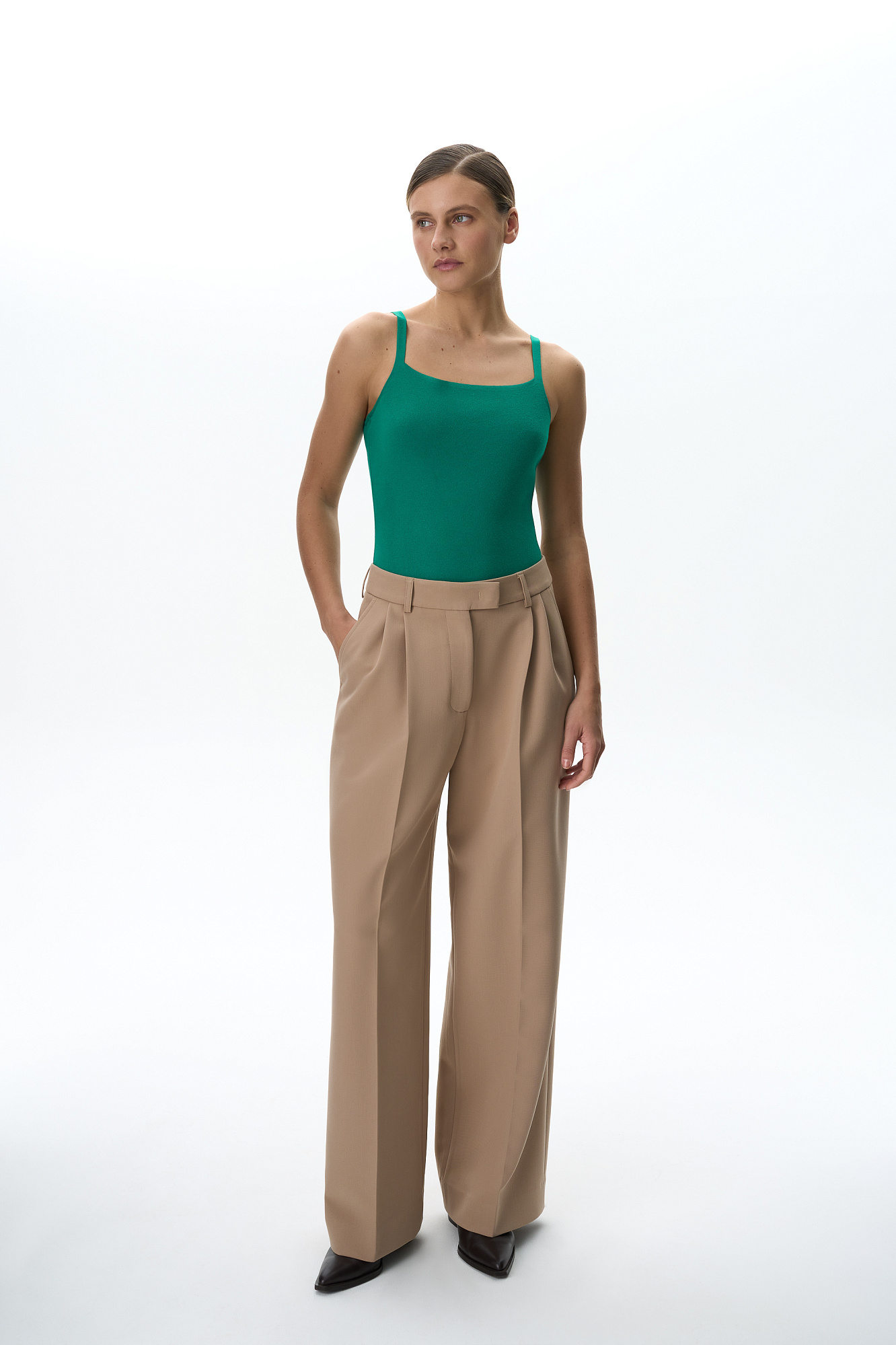 Трикотажное боди из вискозы. Модель приталенного силуэта на тонких бретелях и глубоким вырезом. Изделие застегивается на крючки.