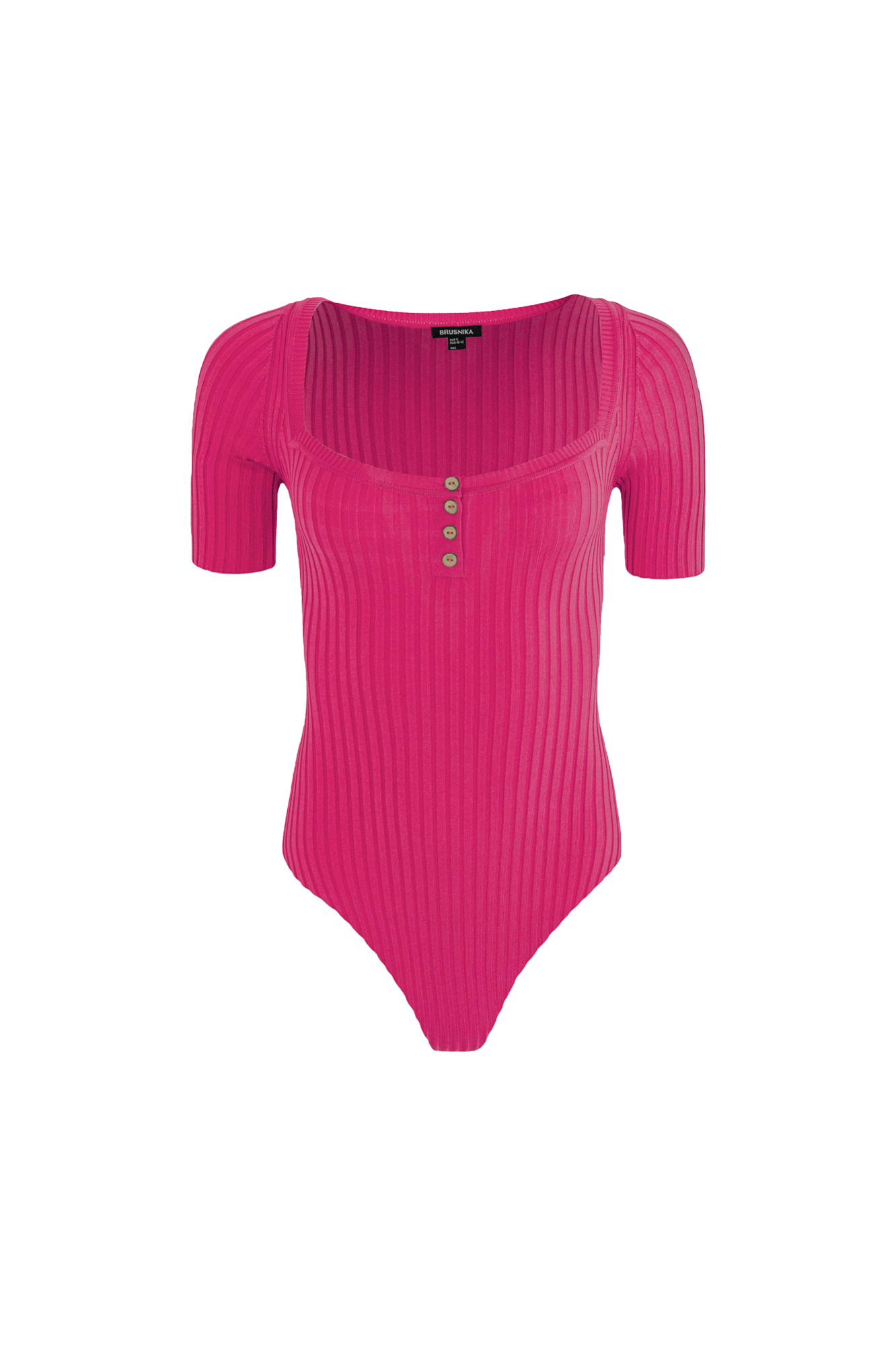 Трикотажное боди из вискозы в широкий рубчик. Модель с квадратным вырезом головины, коротким рукавом и застежкой на бельевые крючки. Изделие декорировано небольшими пуговицами.