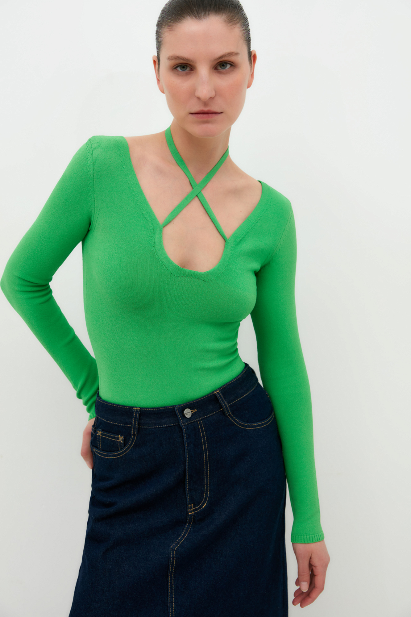 Трикотажное боди из вискозы с акцентным вырезом и лентой-завязкой на шее.