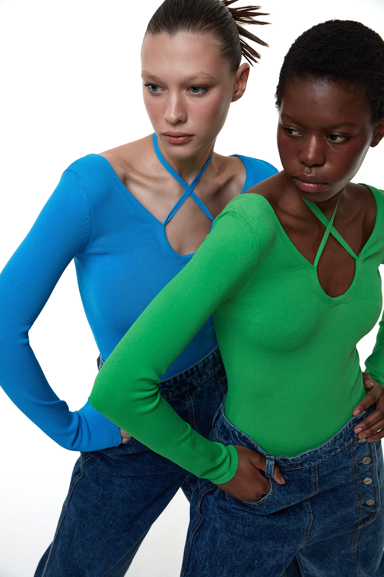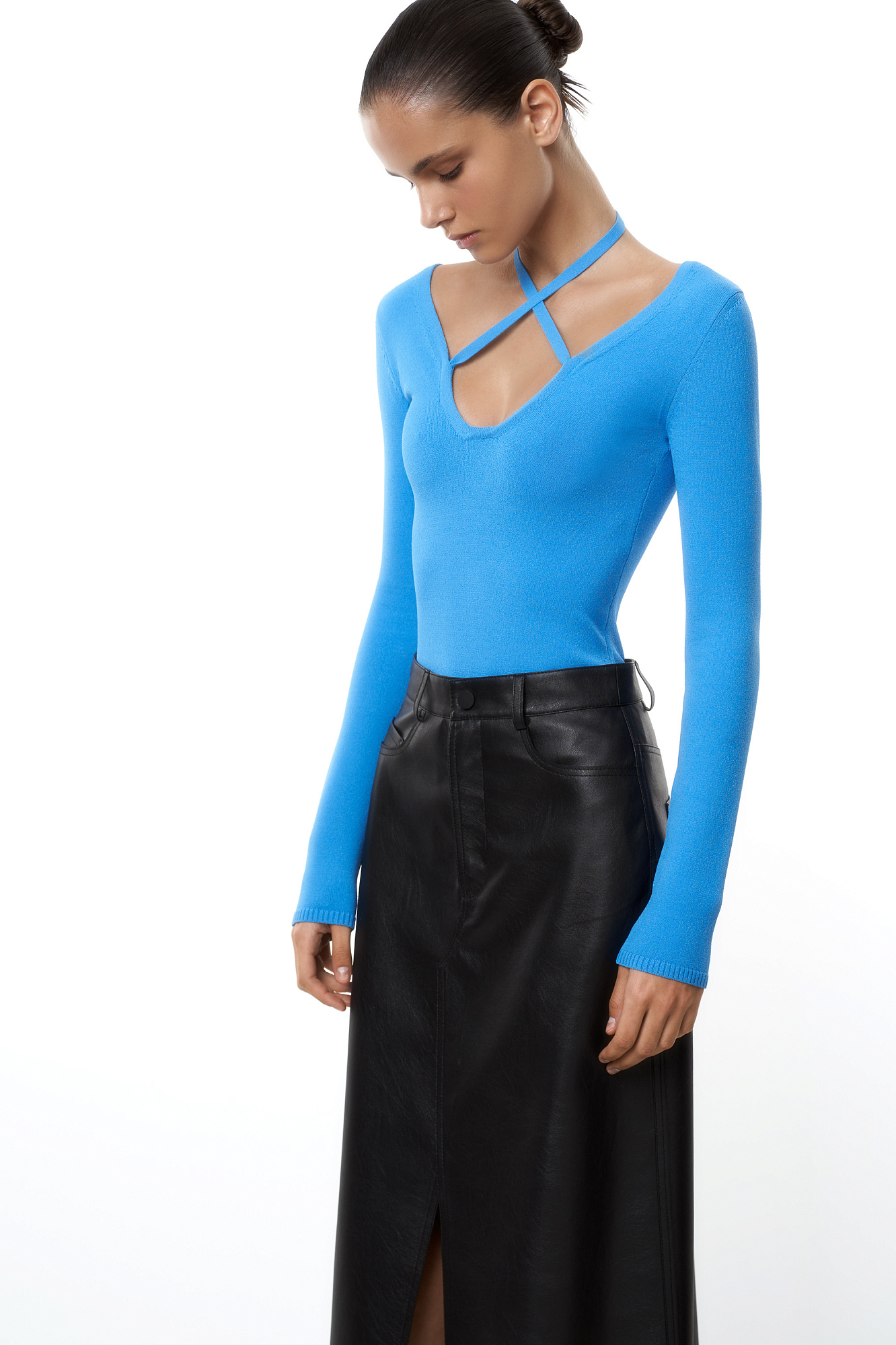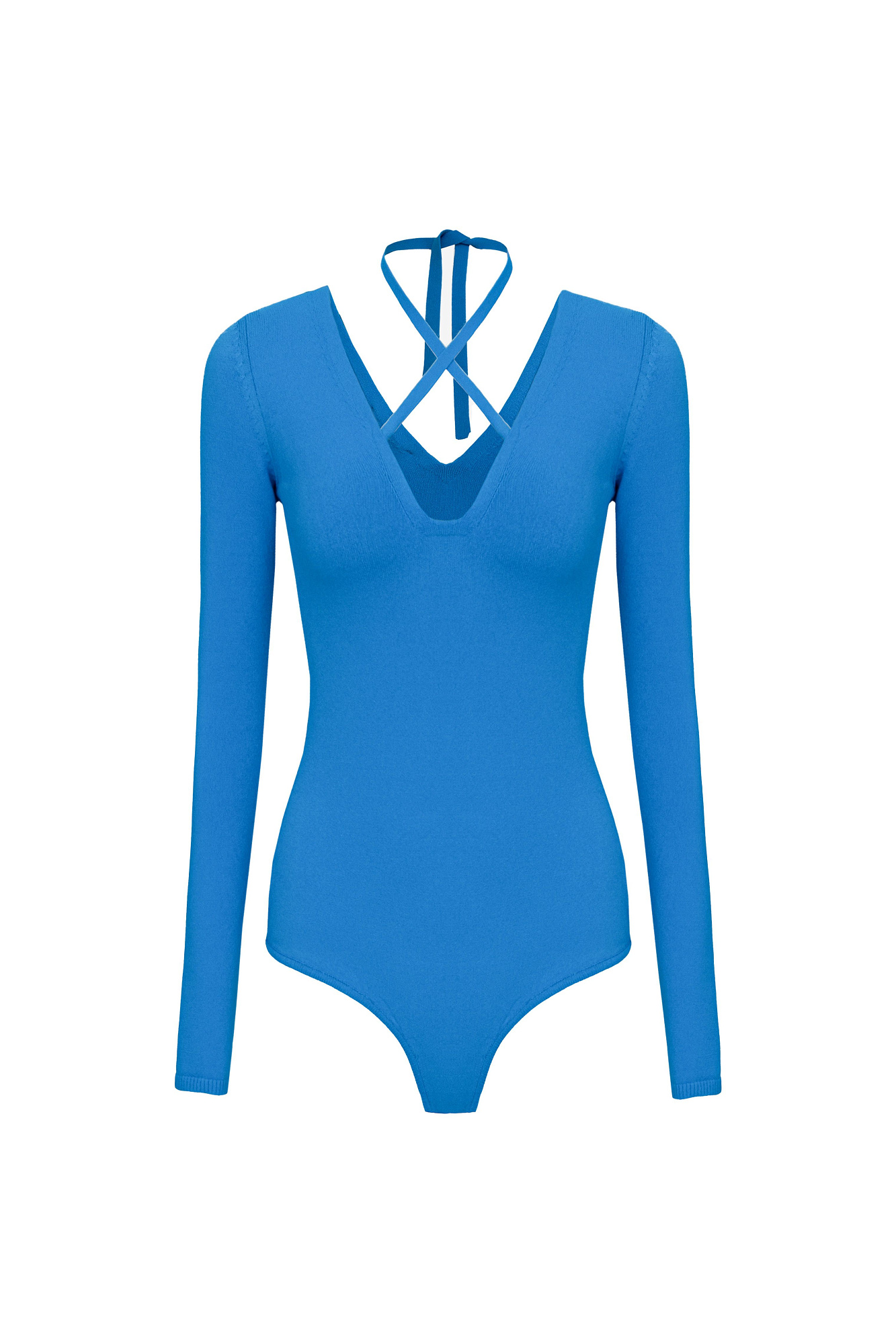 Трикотажное боди из вискозы с акцентным вырезом и лентой-завязкой на шее.