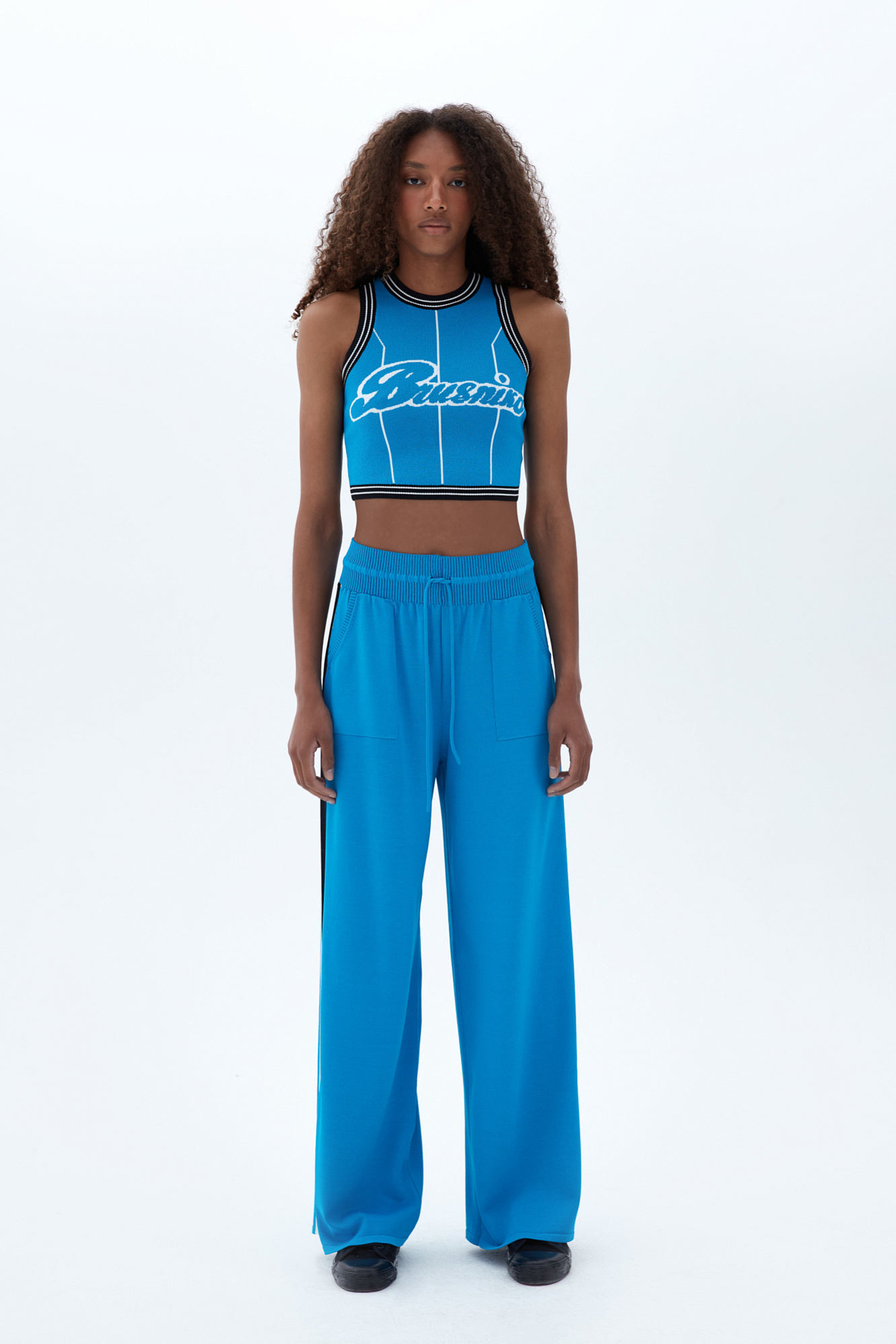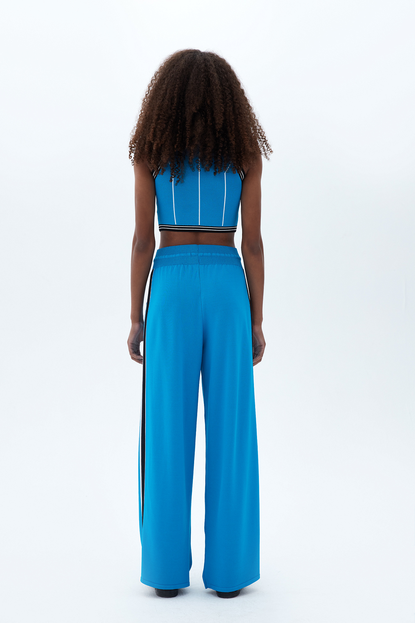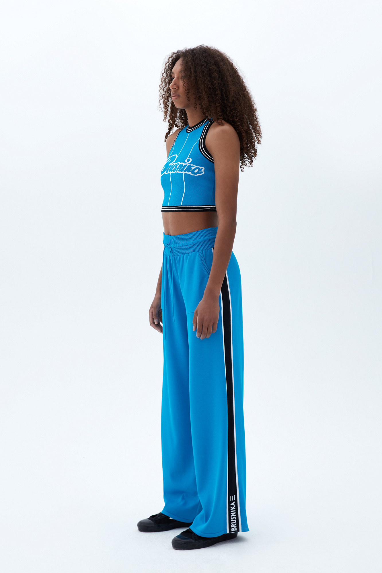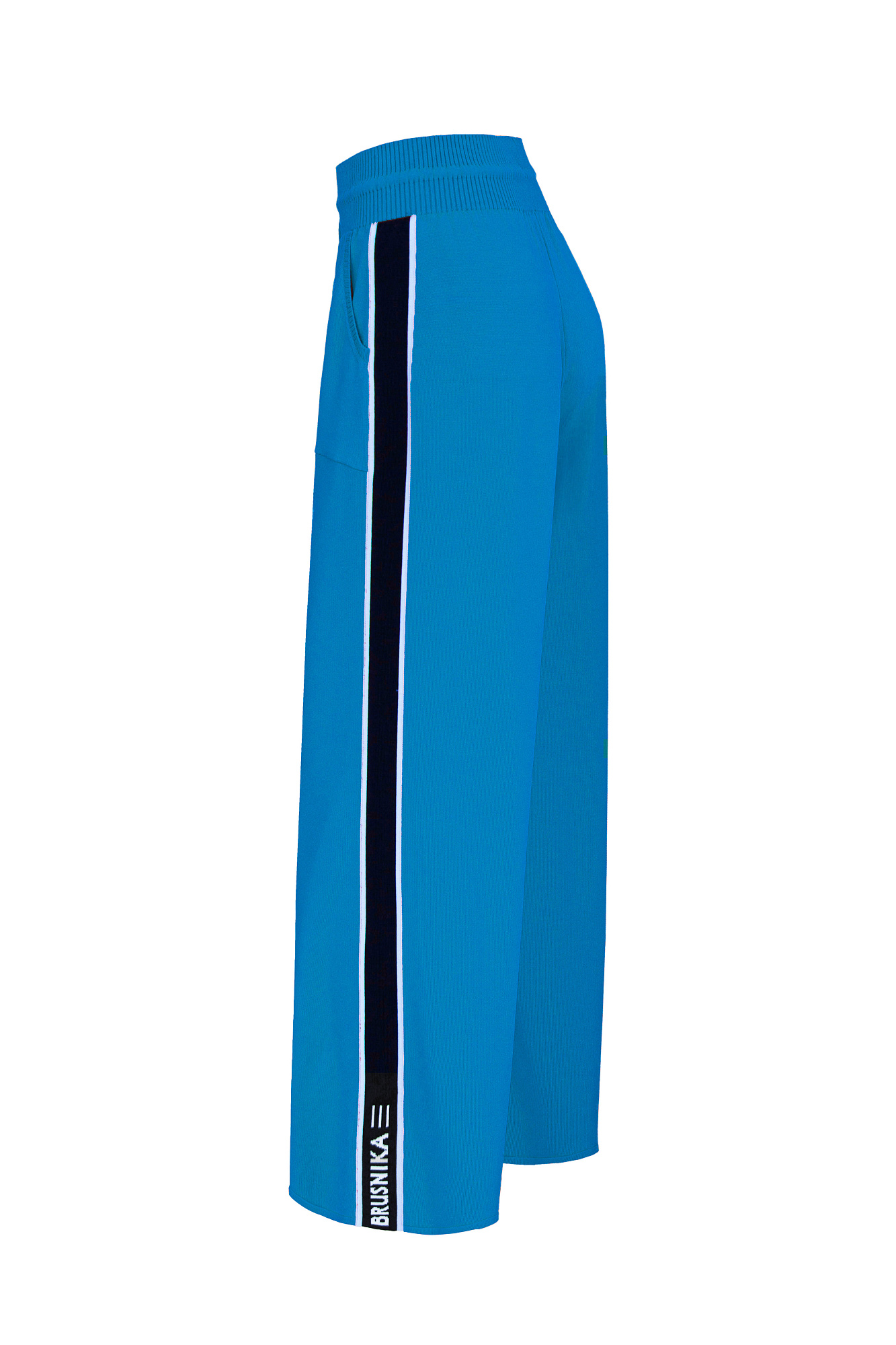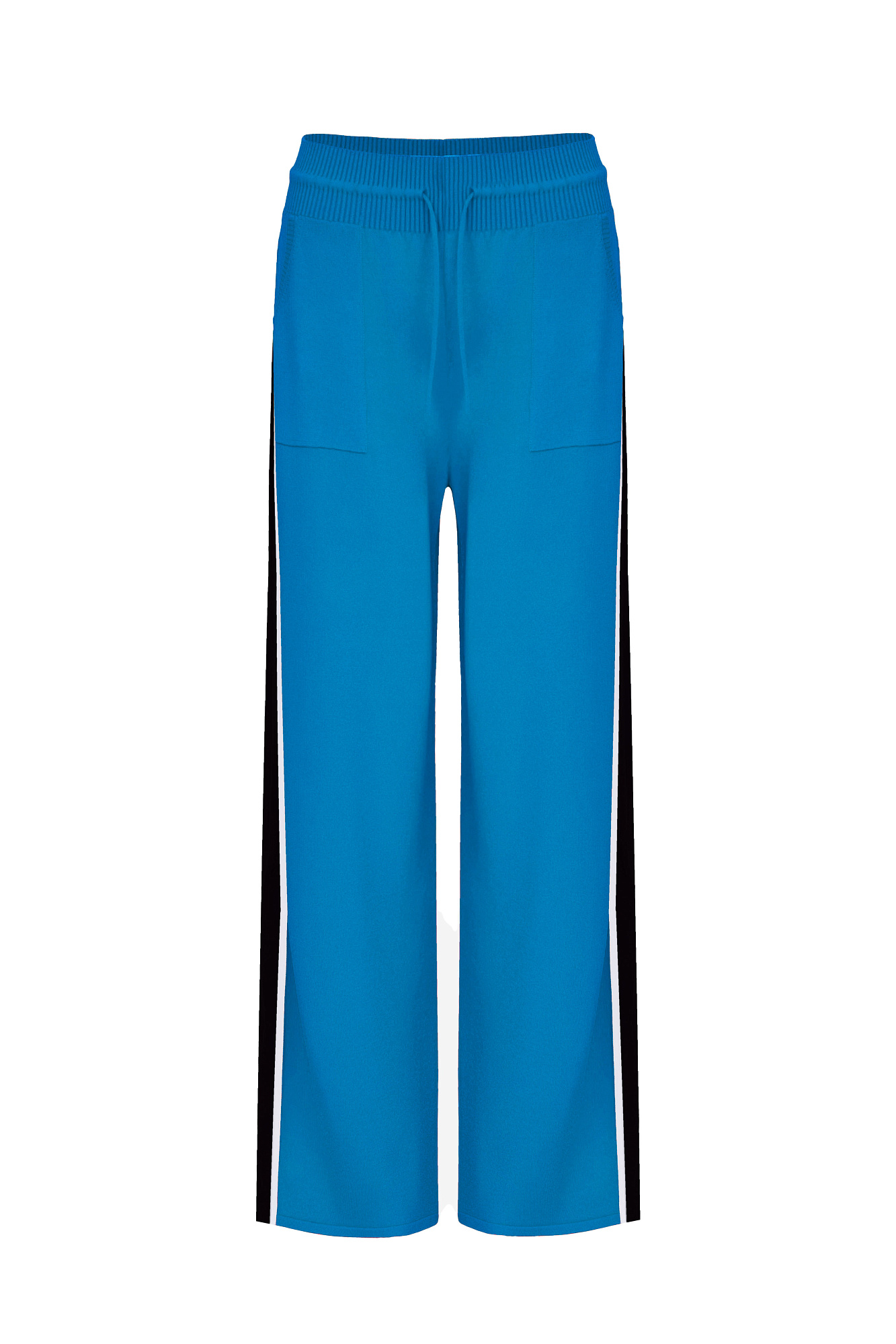 Широкие брюки из вискозы с двухцветным лампасом и надписью внизу. Пояс на эластичной ленте с кулиской и боковые карманы.