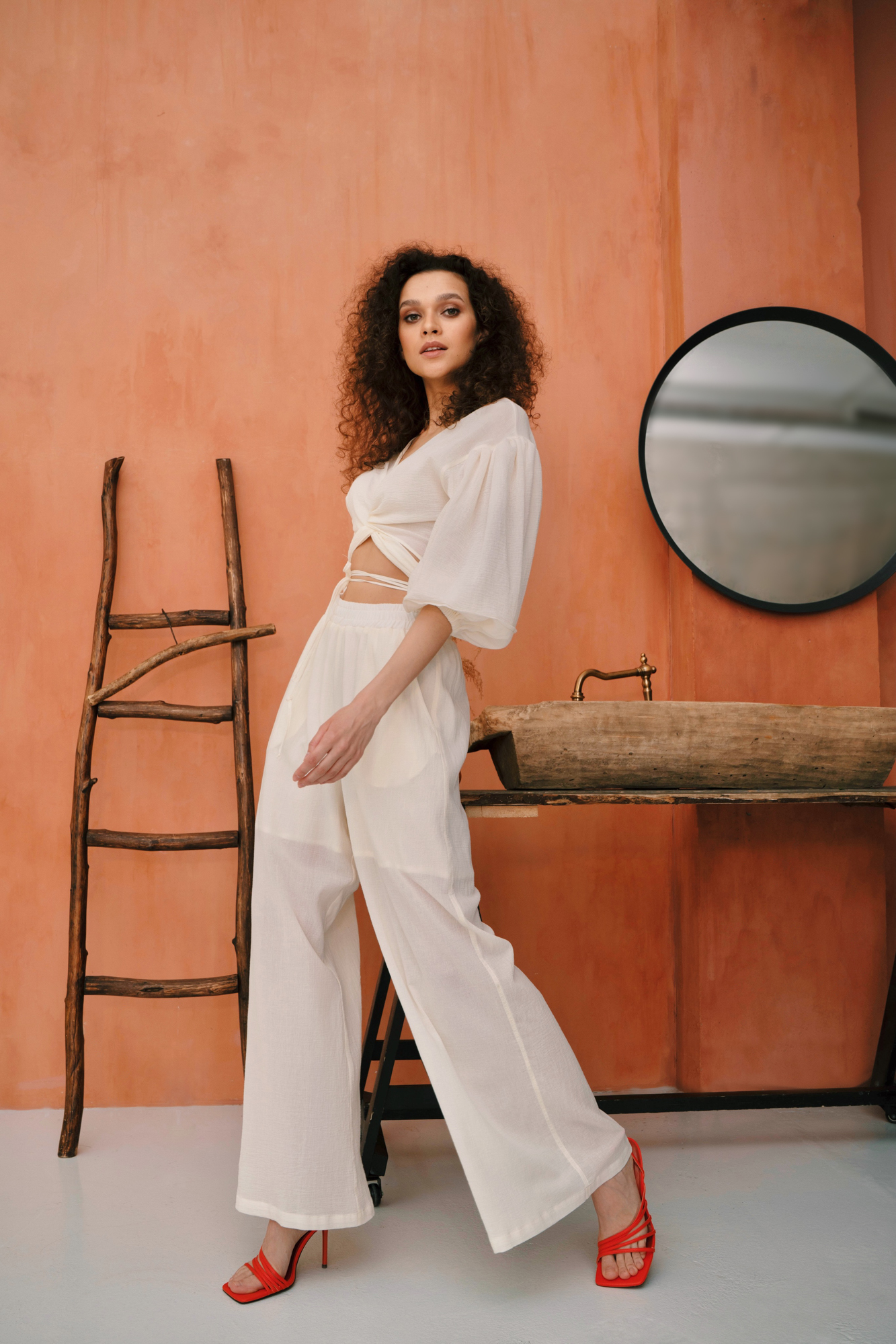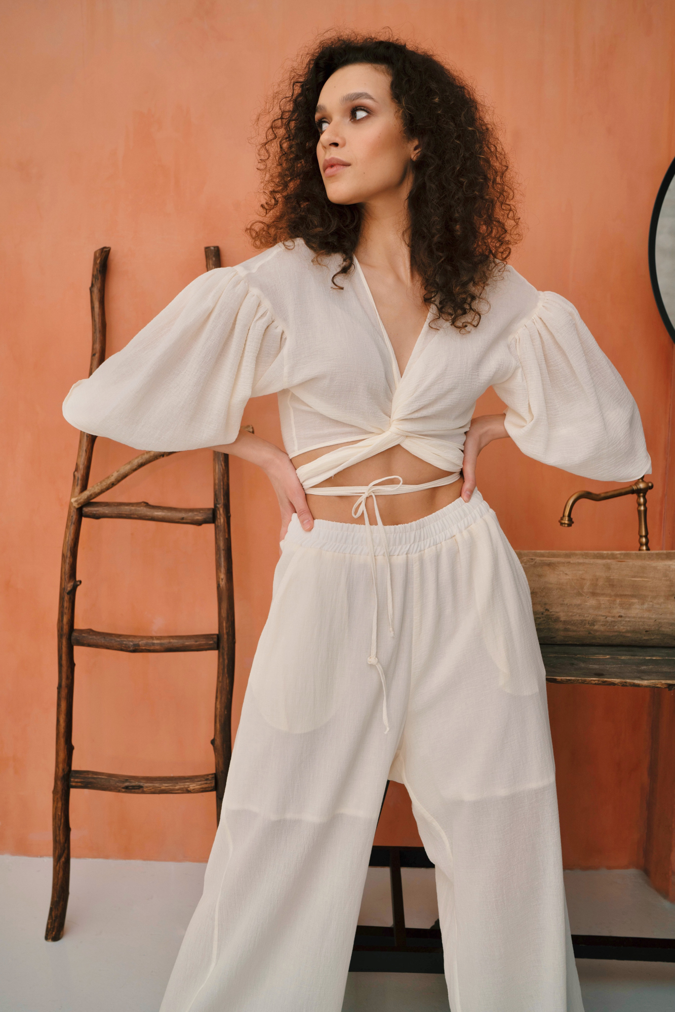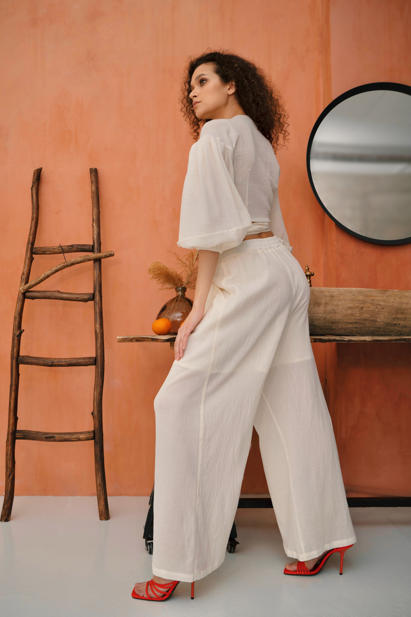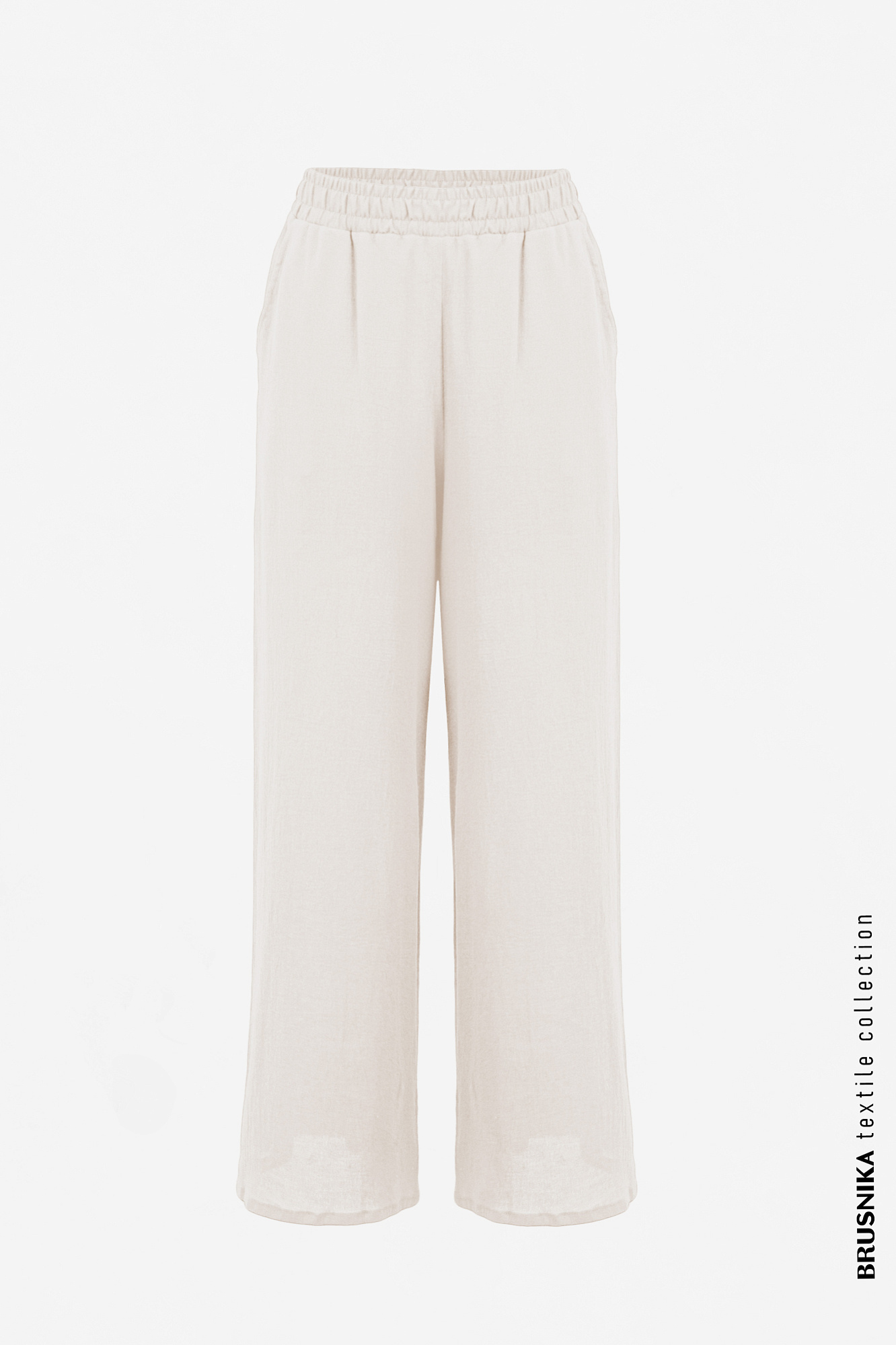 Прямые брюки из 100% хлопка, на поясе резинка, с высокой посадкой и карманами.