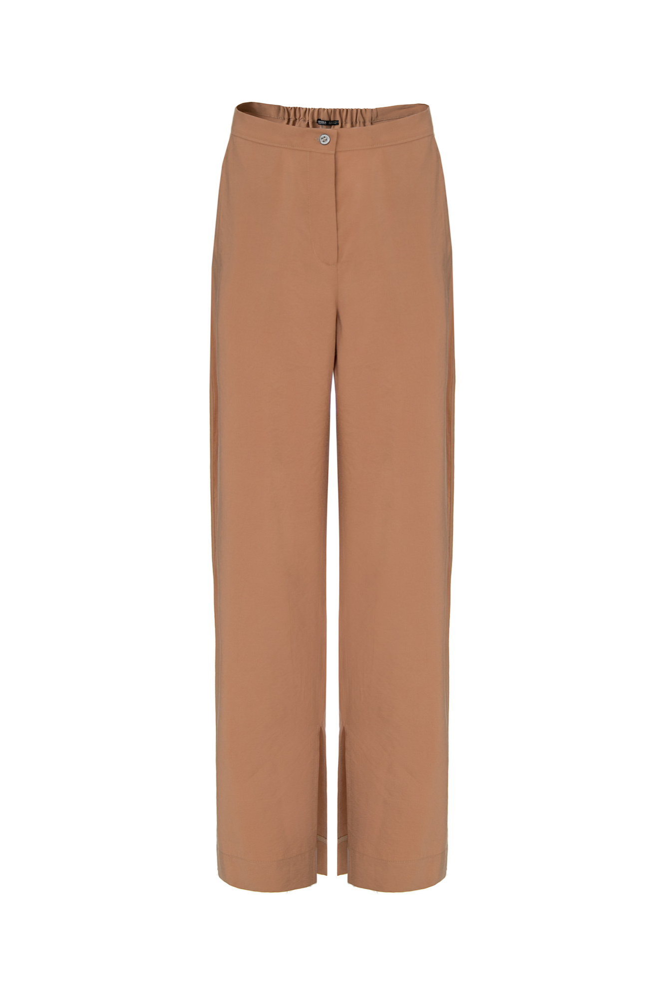 Брюки из купры с разрезами по бокам. Модель свободного силуэта с застежкой на молнию и пуговицу.