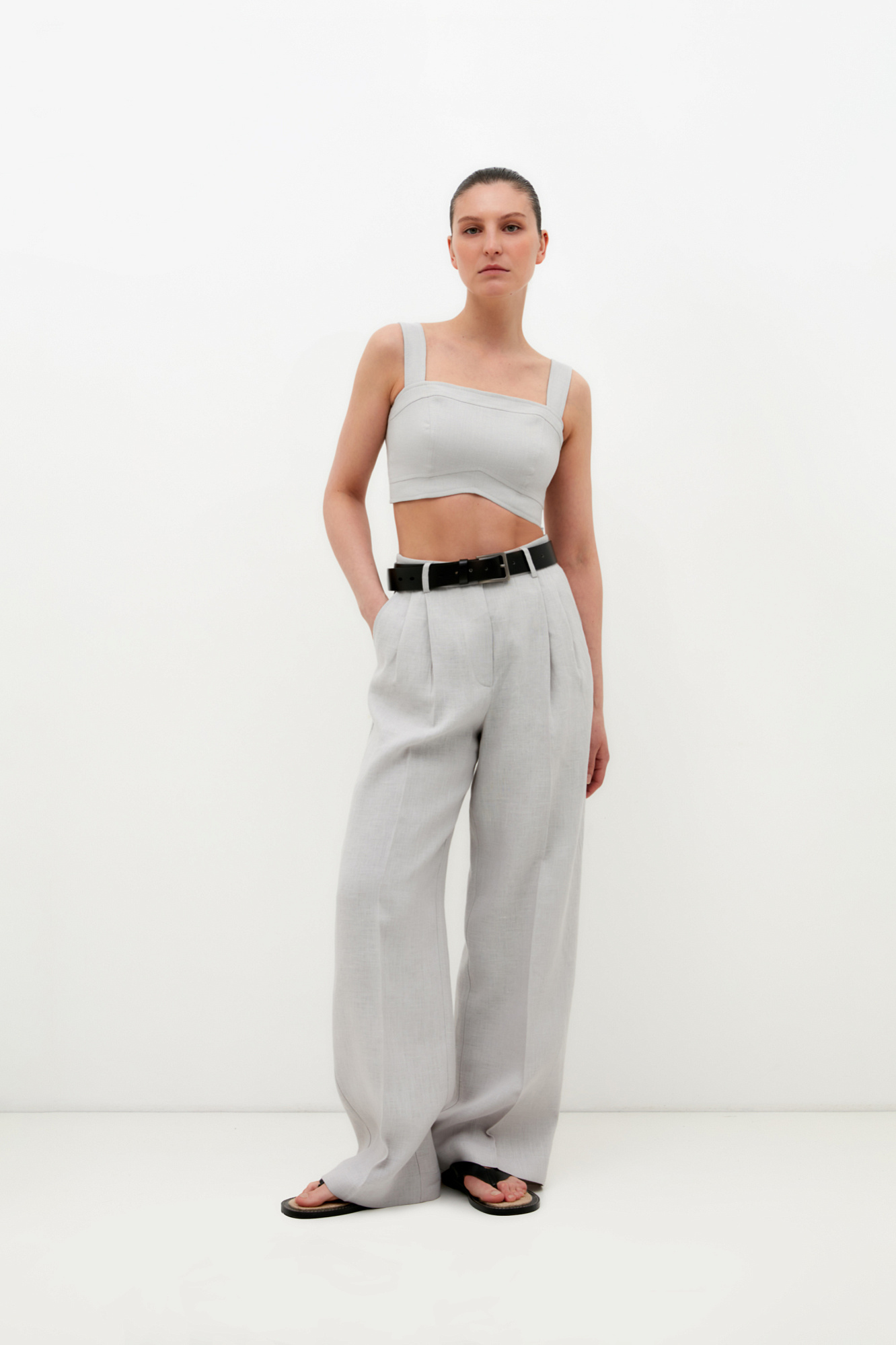 Широкие брюки палаццо из 100% льна. Боковые карманы и потайная застежка на молнию и пуговицу. Дополнить образ можно топом и жакетом.