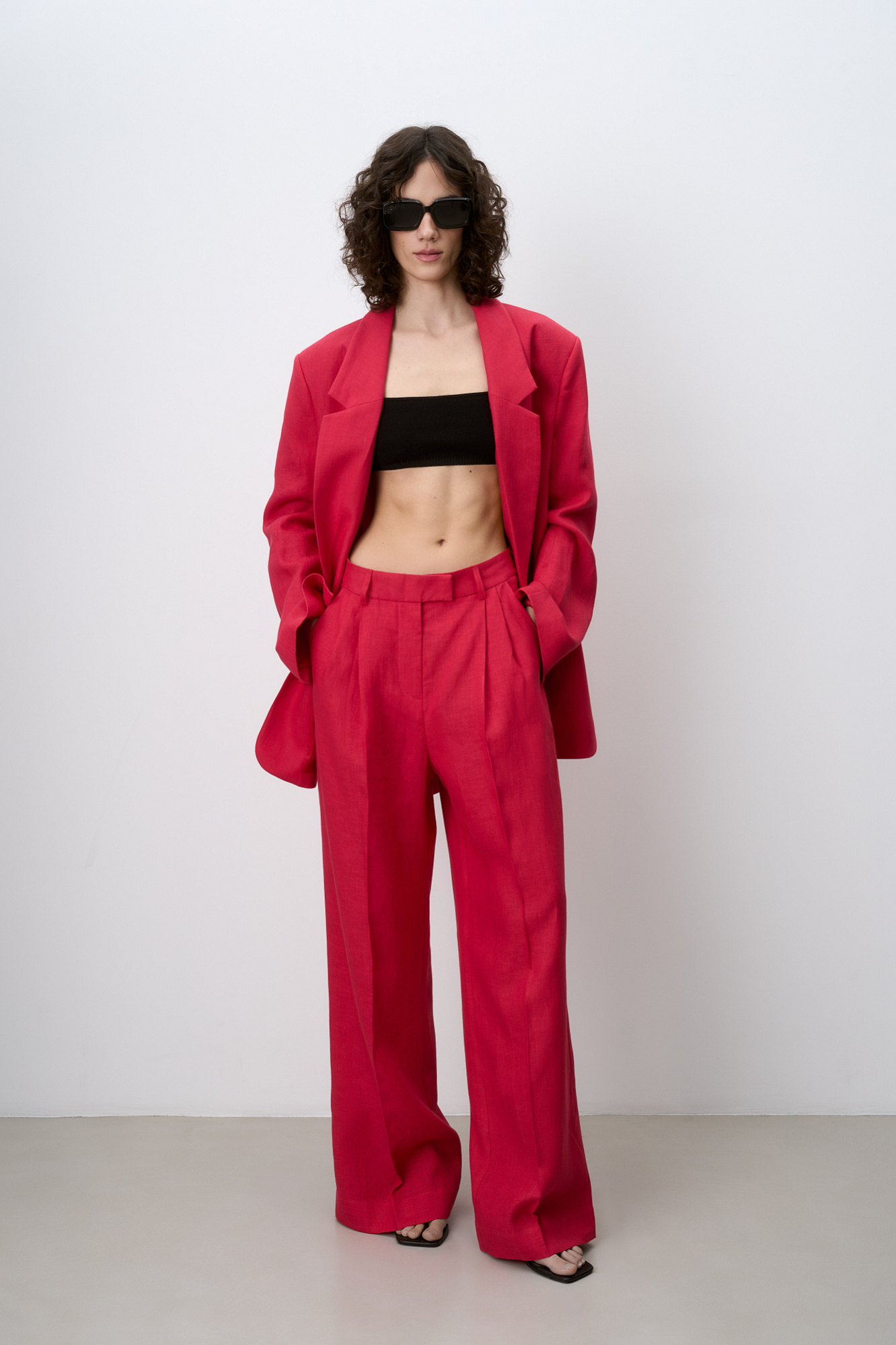 Широкие брюки палаццо из 100% льна. Боковые карманы и потайная застежка на молнию и пуговицу. Дополнить образ можно топом и жакетом.