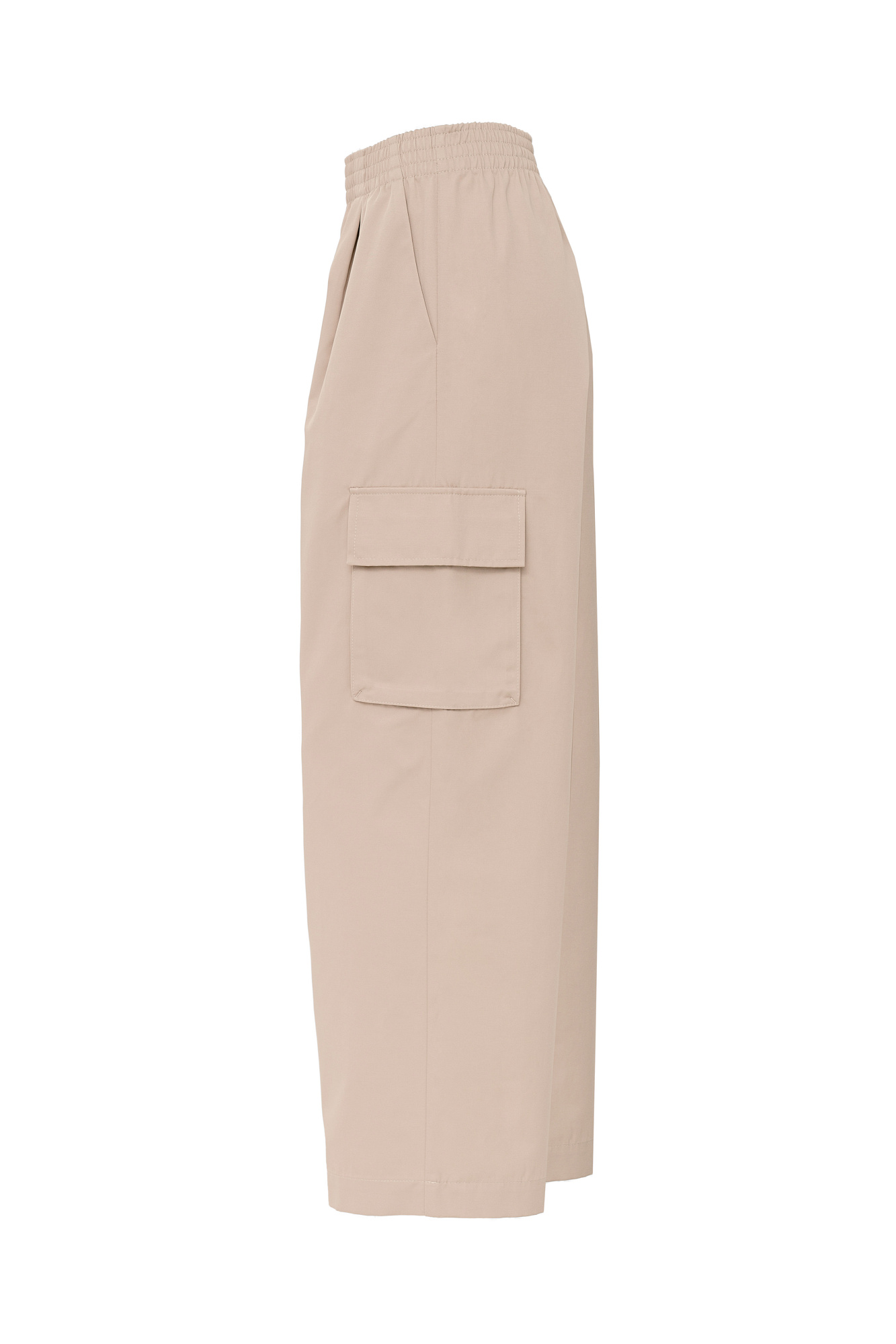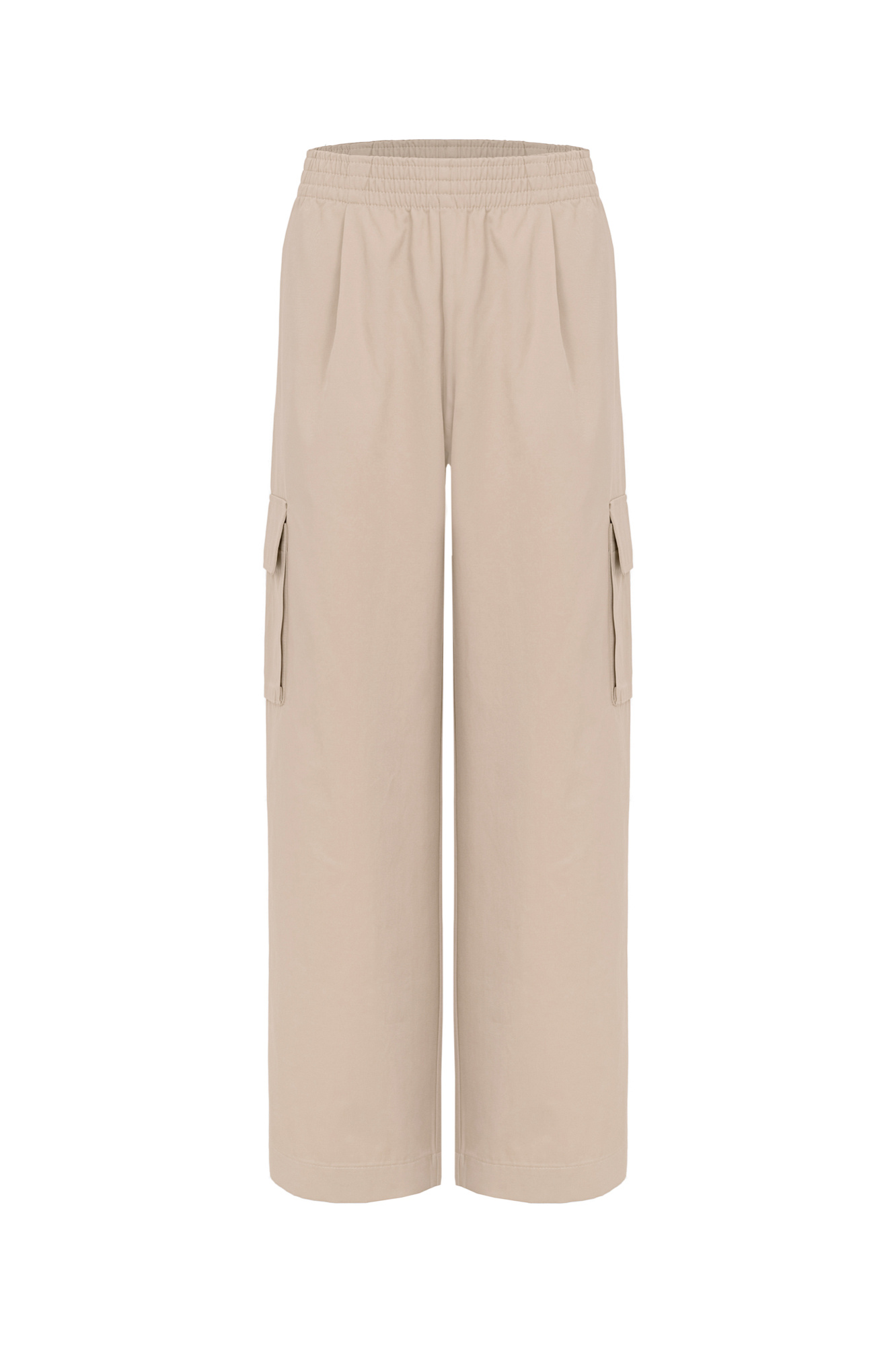 Широкие брюки-карго с защипами на талии. Функциональные накладные карманы и классические боковые карманы. Эластичный пояс на резинке. Модель со средней посадкой.