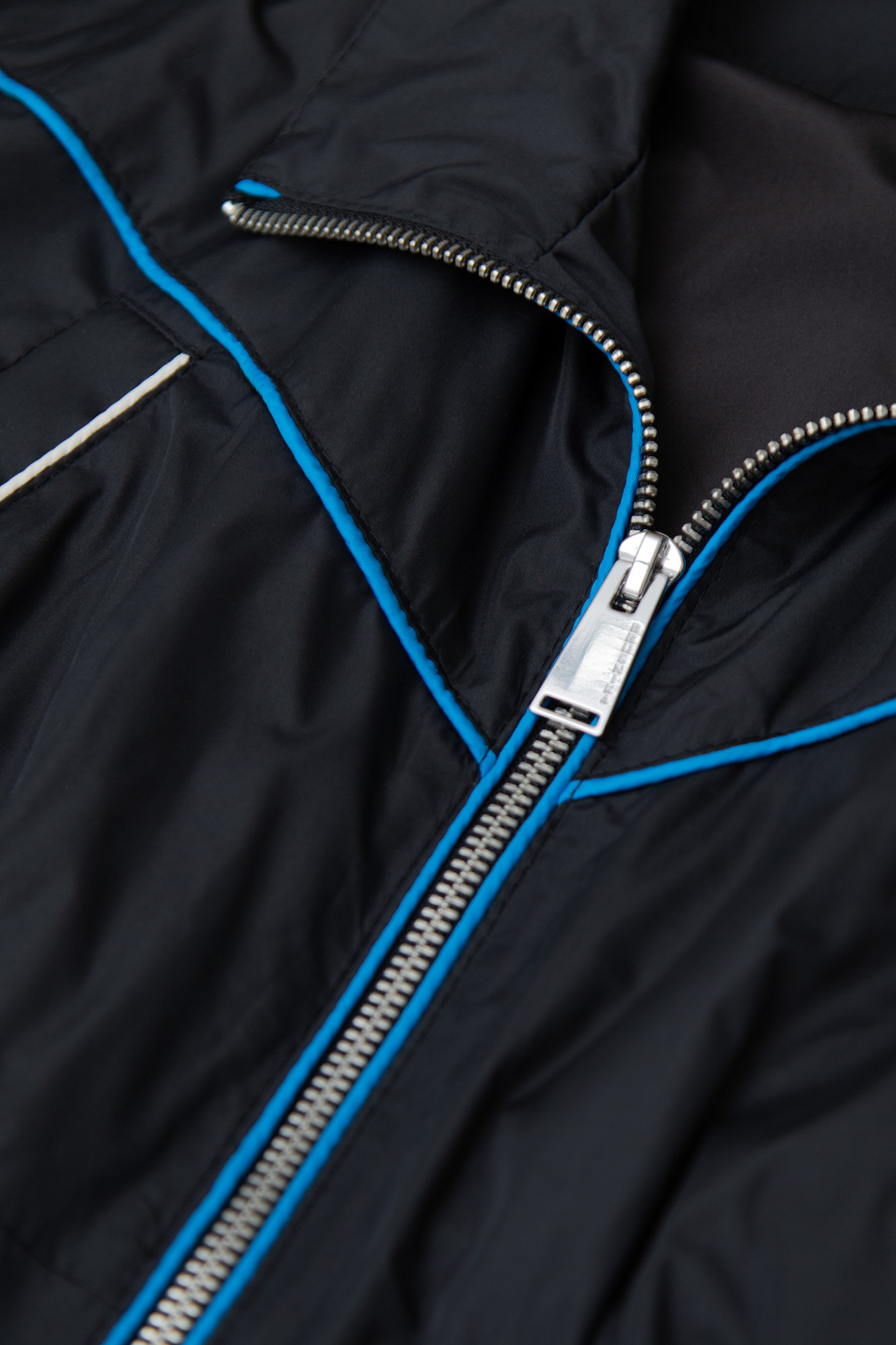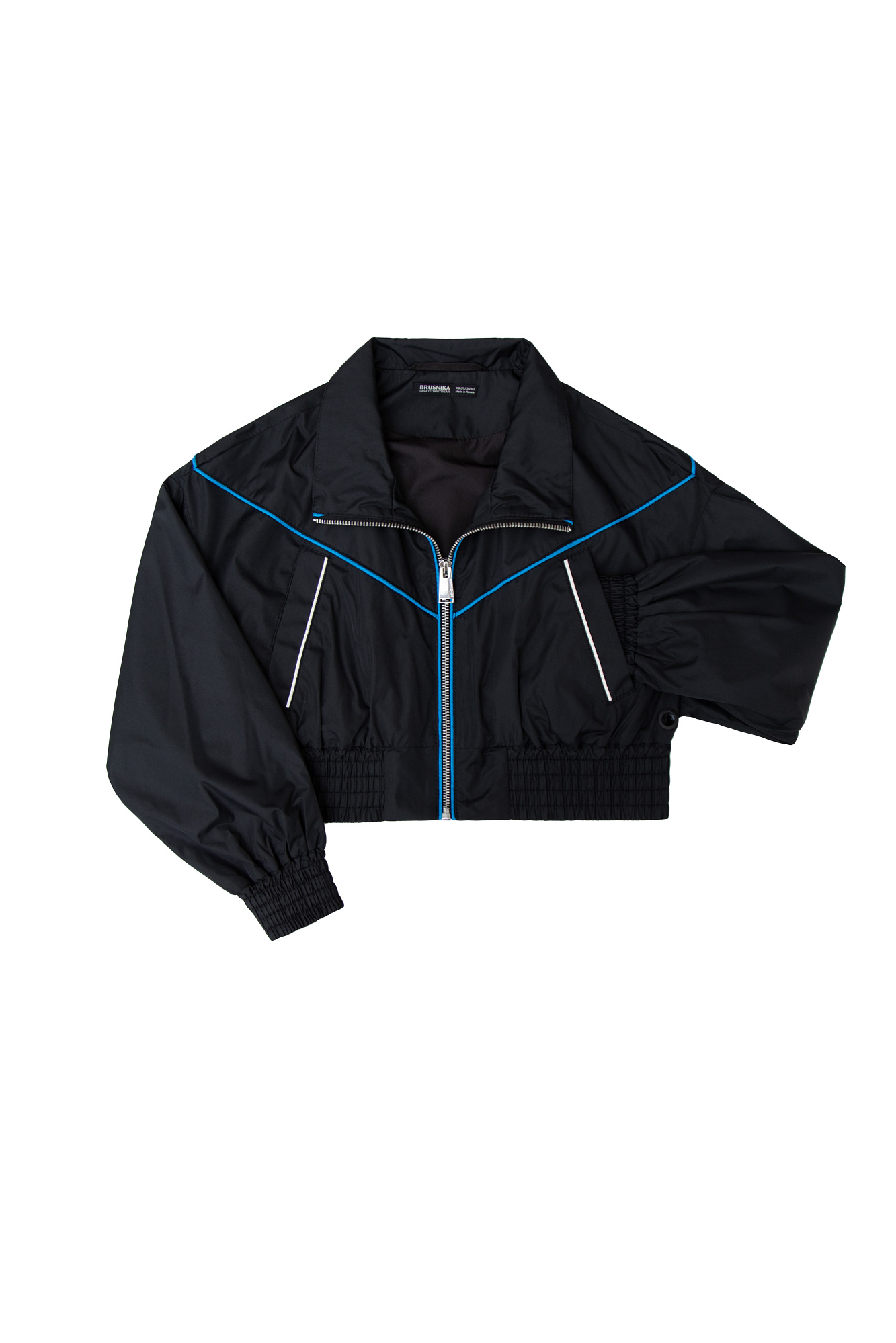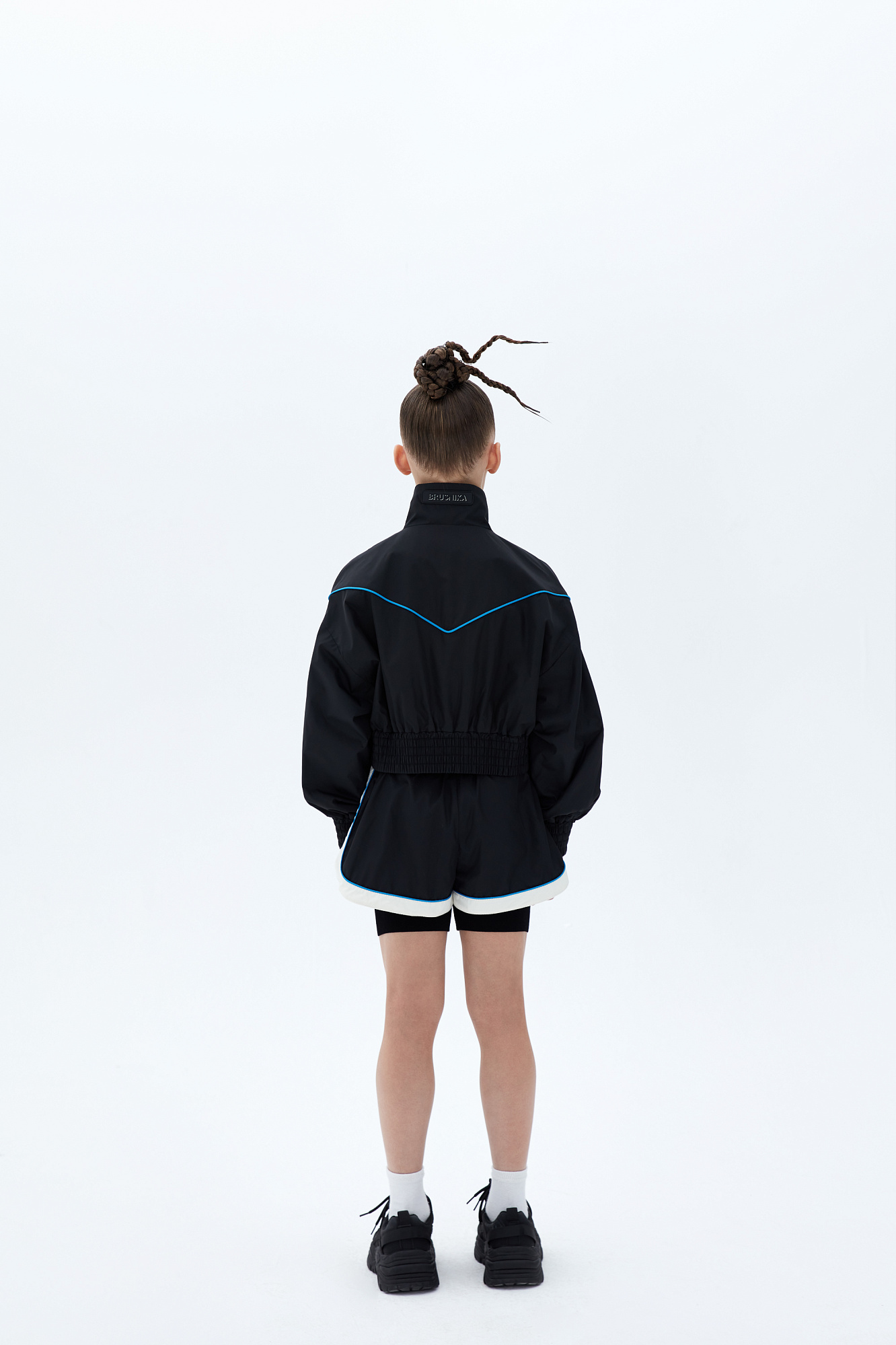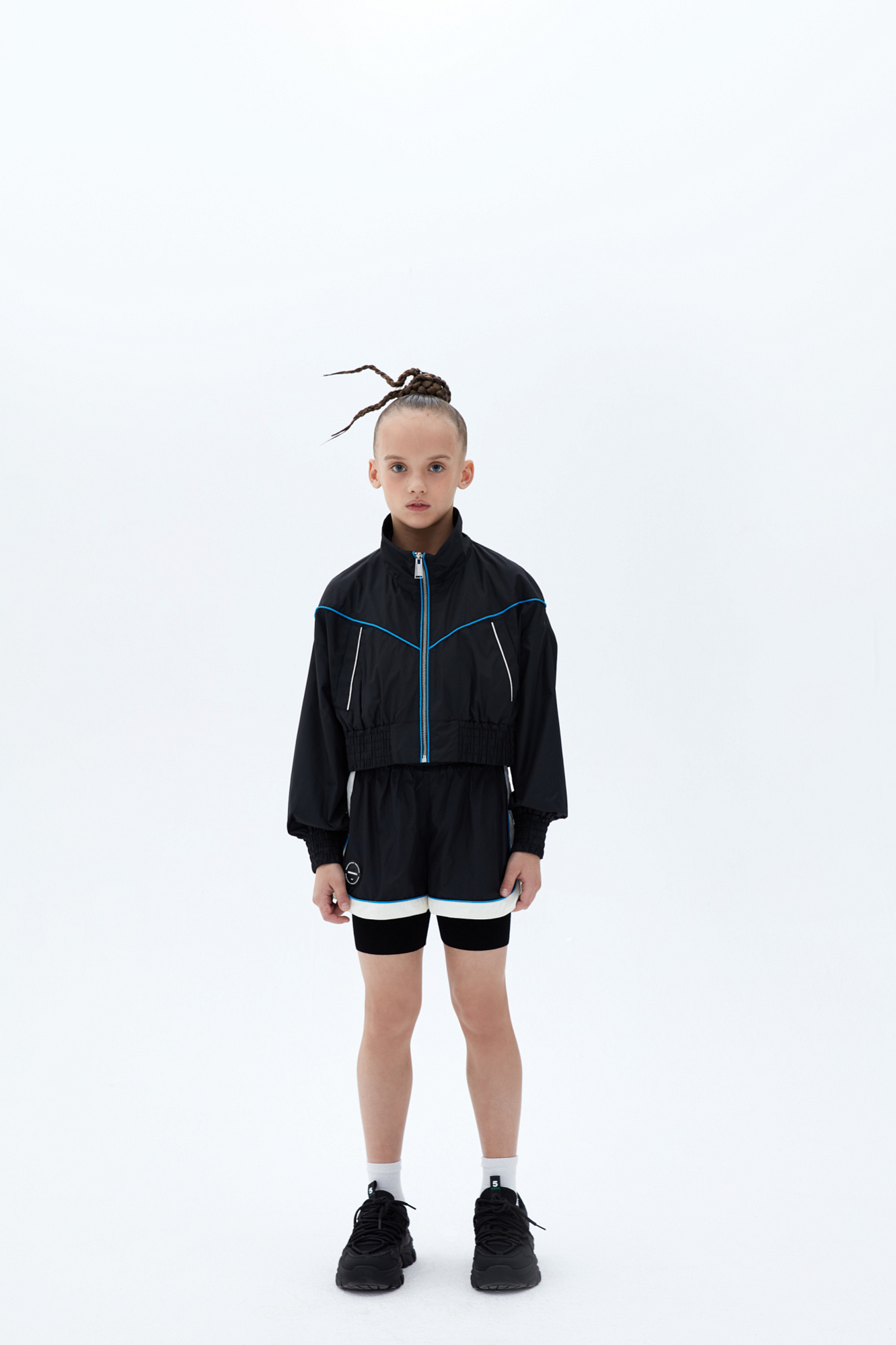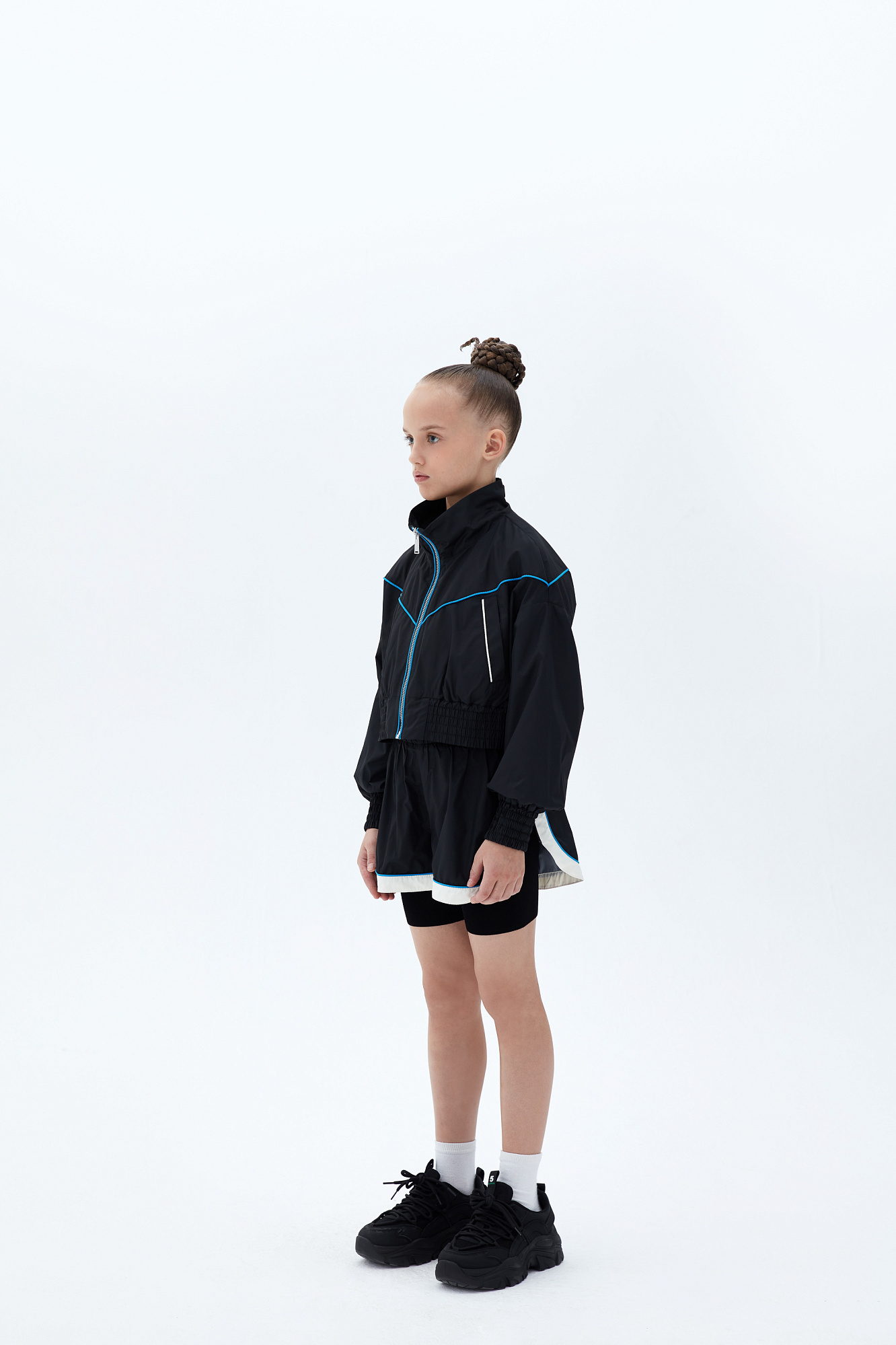 Укороченный детский бомбер в спортивном стиле с карманами по бокам и голубым кантом. Манжеты и низ изделия на эластичной ленте. Подклад с элементами из сетчатой ткани по бокам. Дополнить образ можно шортами в том же стиле.