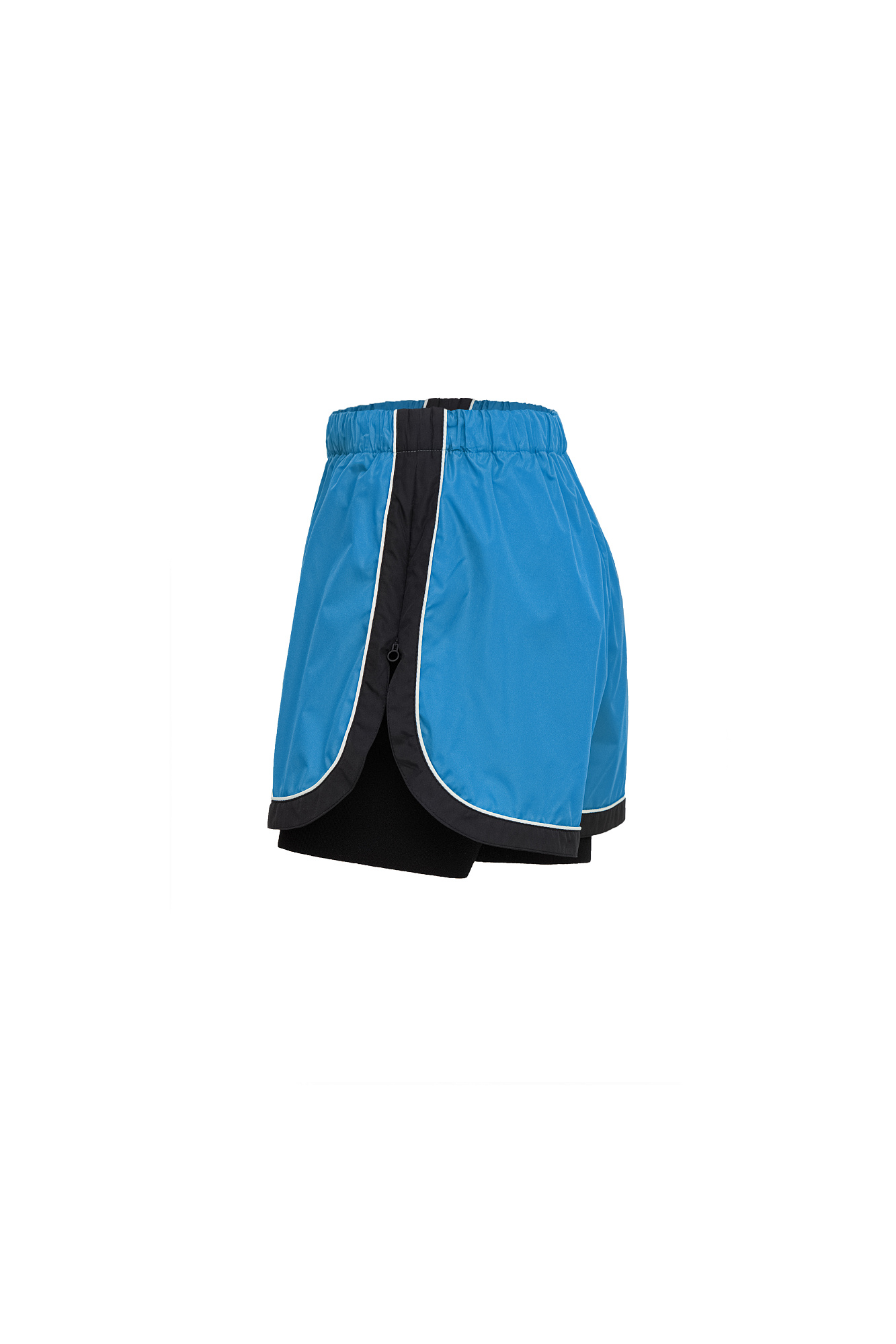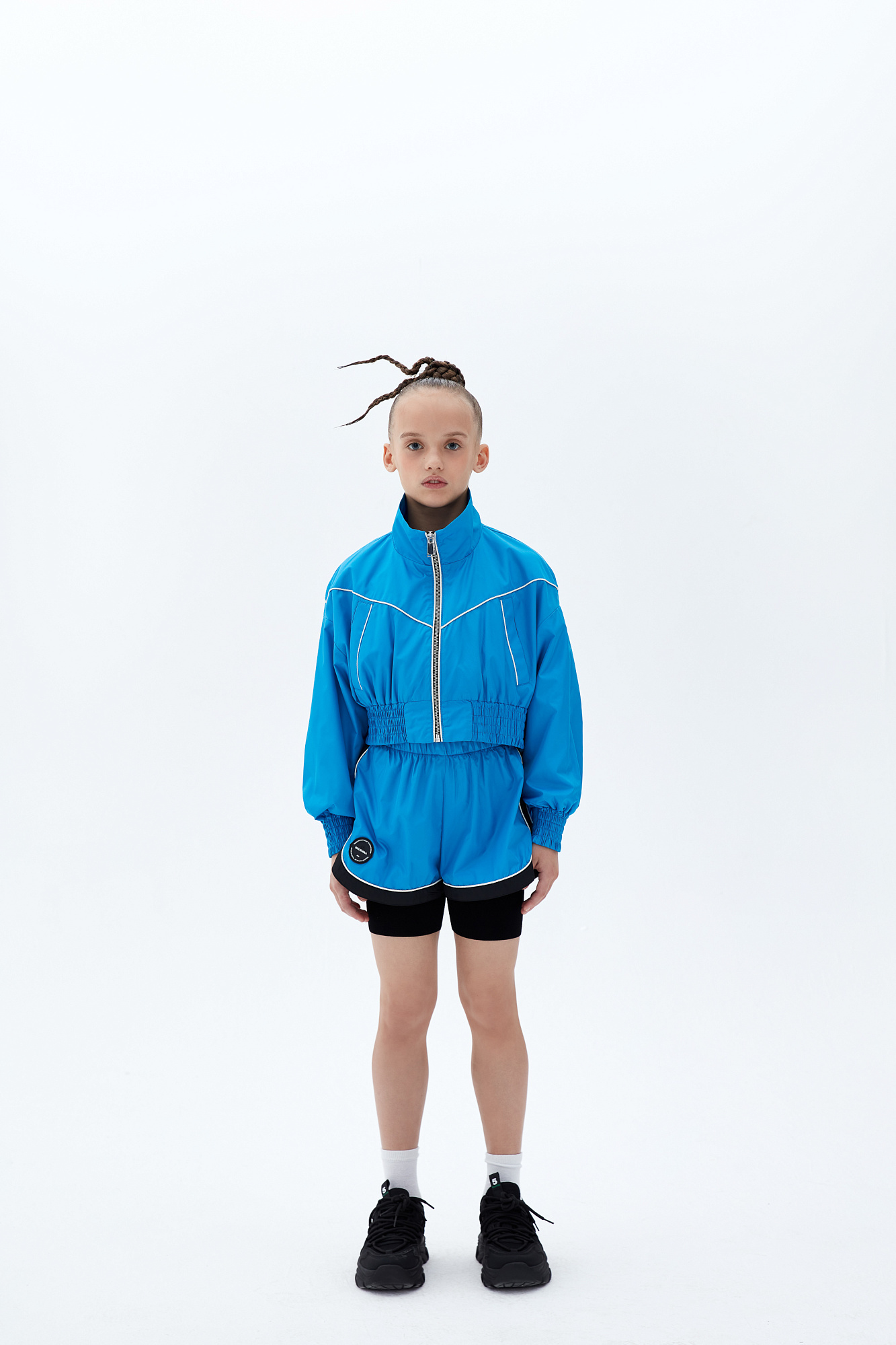 Детские короткие шорты в спортивном стиле с карманами по бокам, белым кантом, широким лампасом и внутренними трикотажными шортами. Пояс с кулиской на эластичной ленте. Дополнить образ можно бомбером в том же стиле.