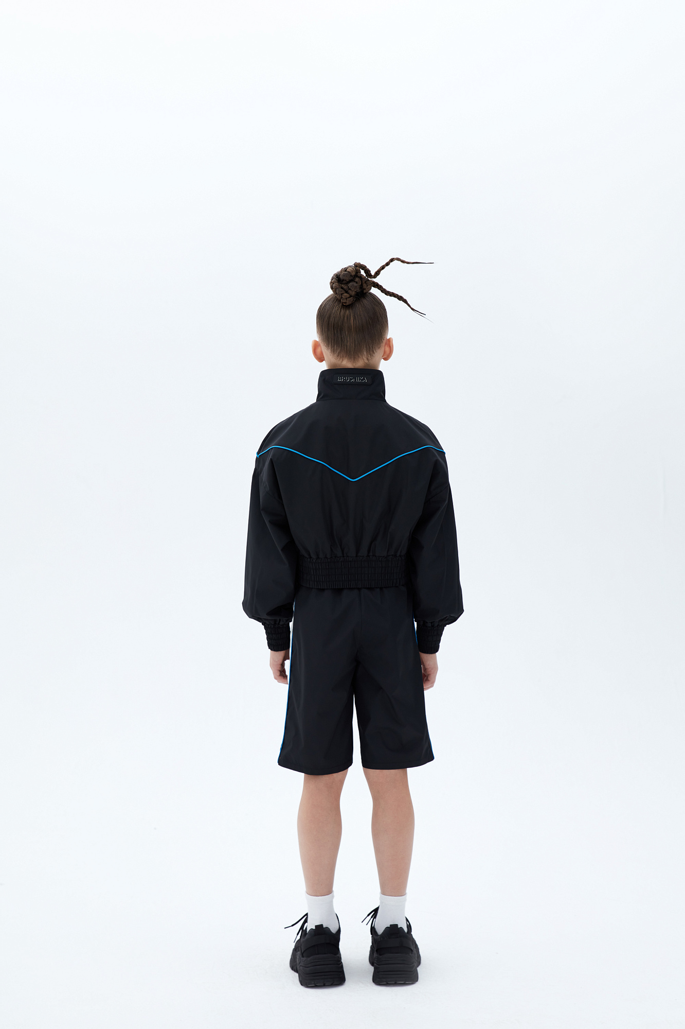 Детские шорты в спортивном стиле с карманами по бокам, белым кантом и широким лампасом. Пояс на эластичной ленте с брендированным ярлыком. Дополнить образ можно бомбером или курткой в том же стиле.