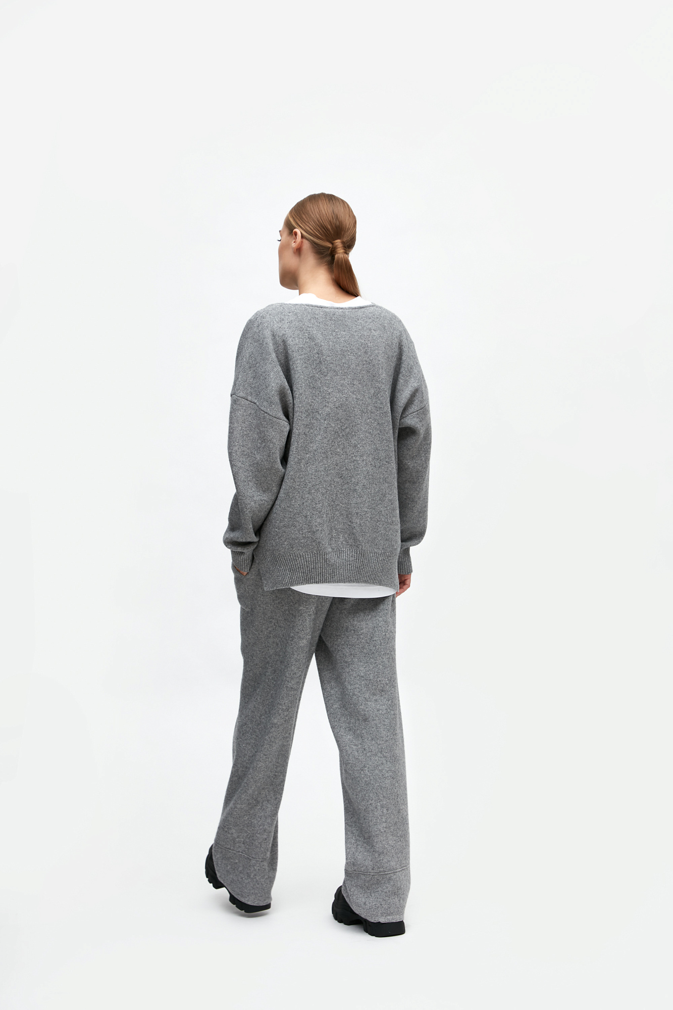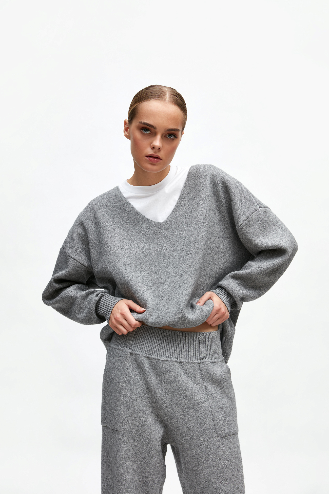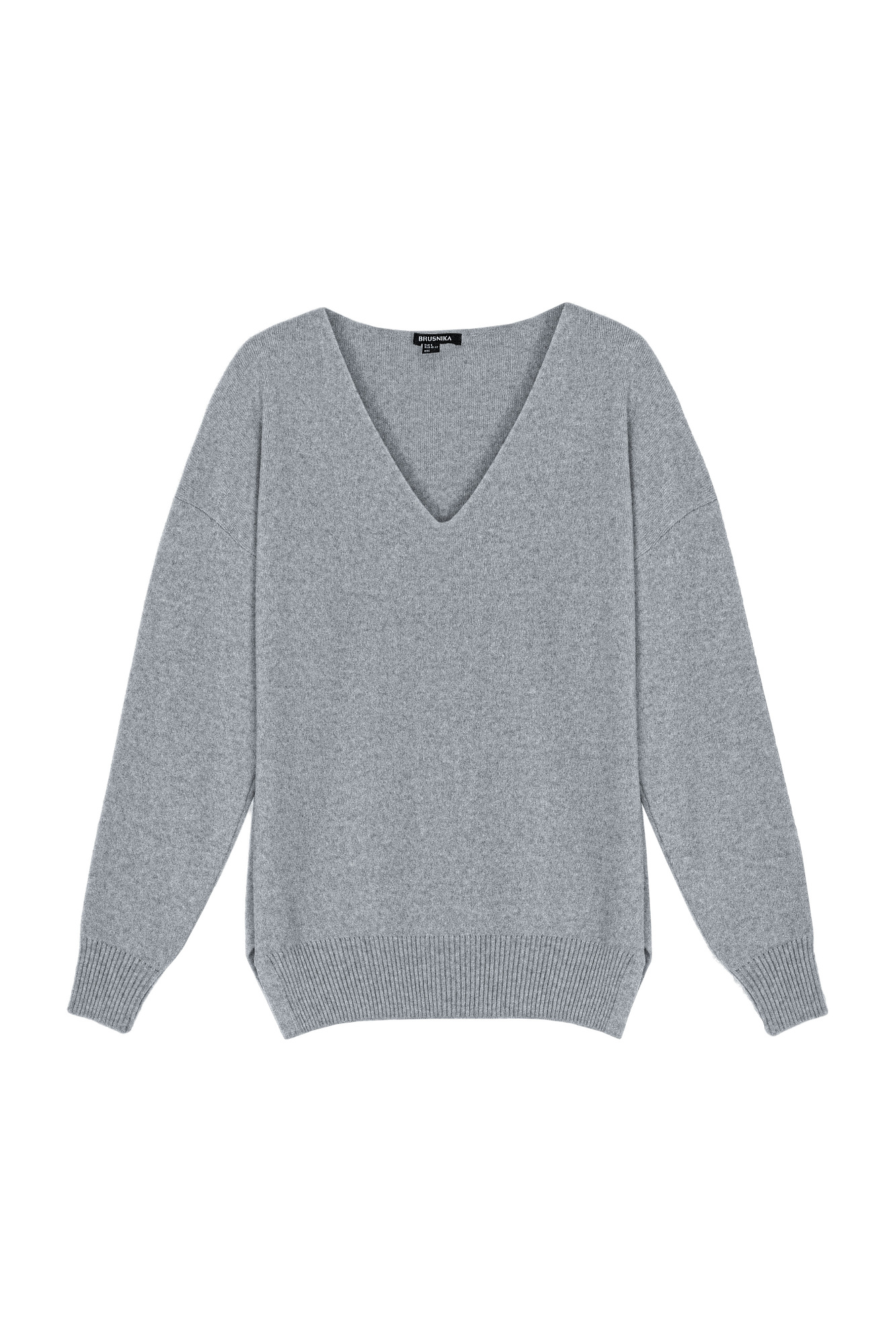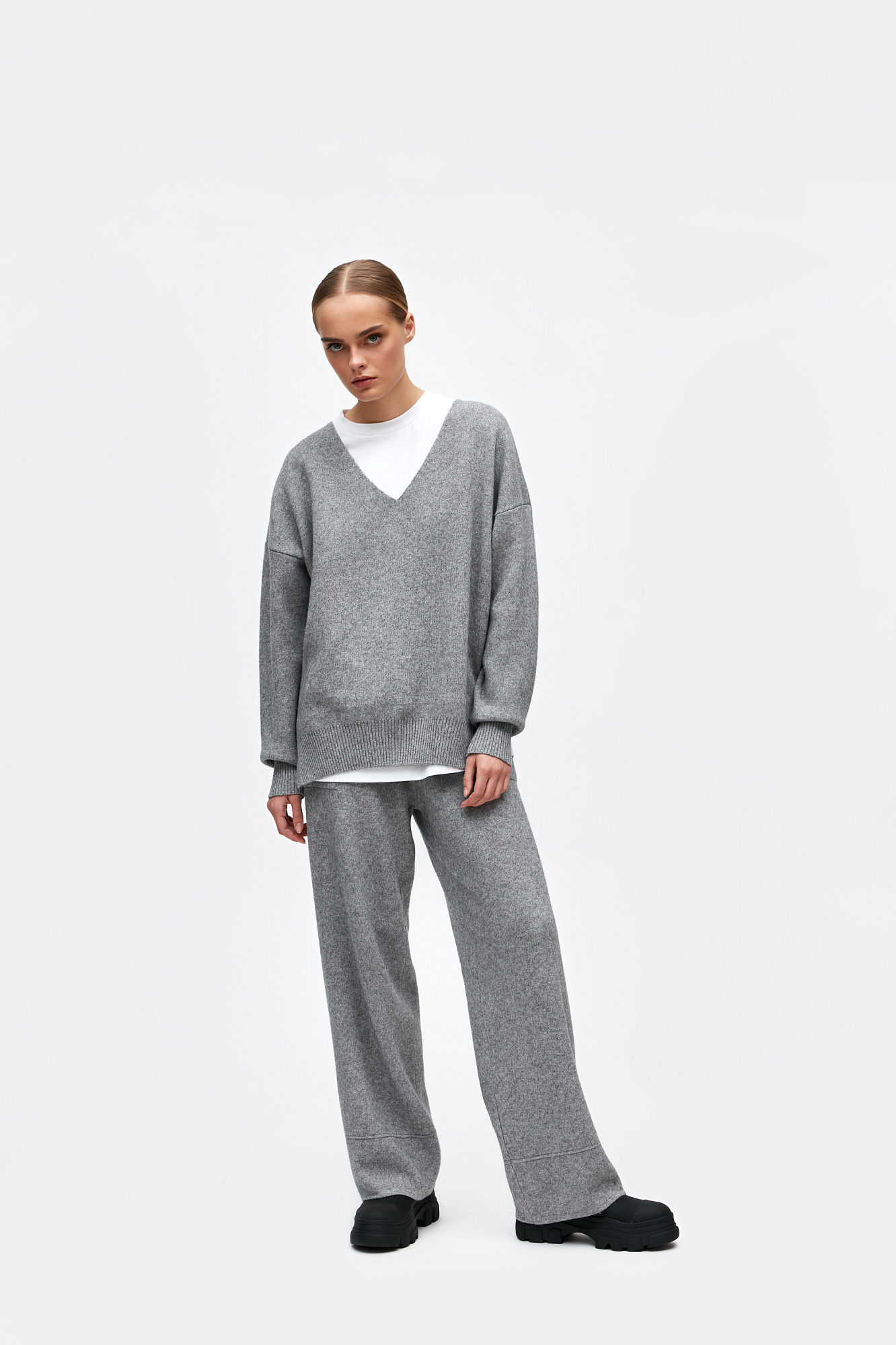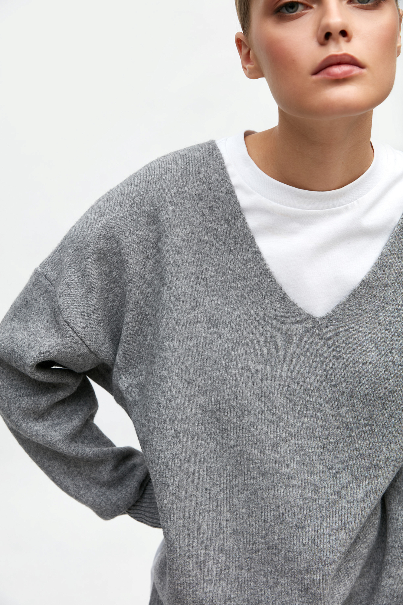 Кашемировый джемпер с V-образным вырезом и спущенным плечом.
