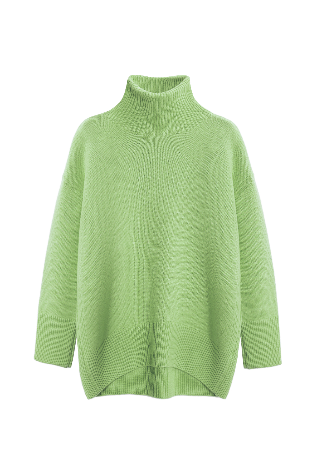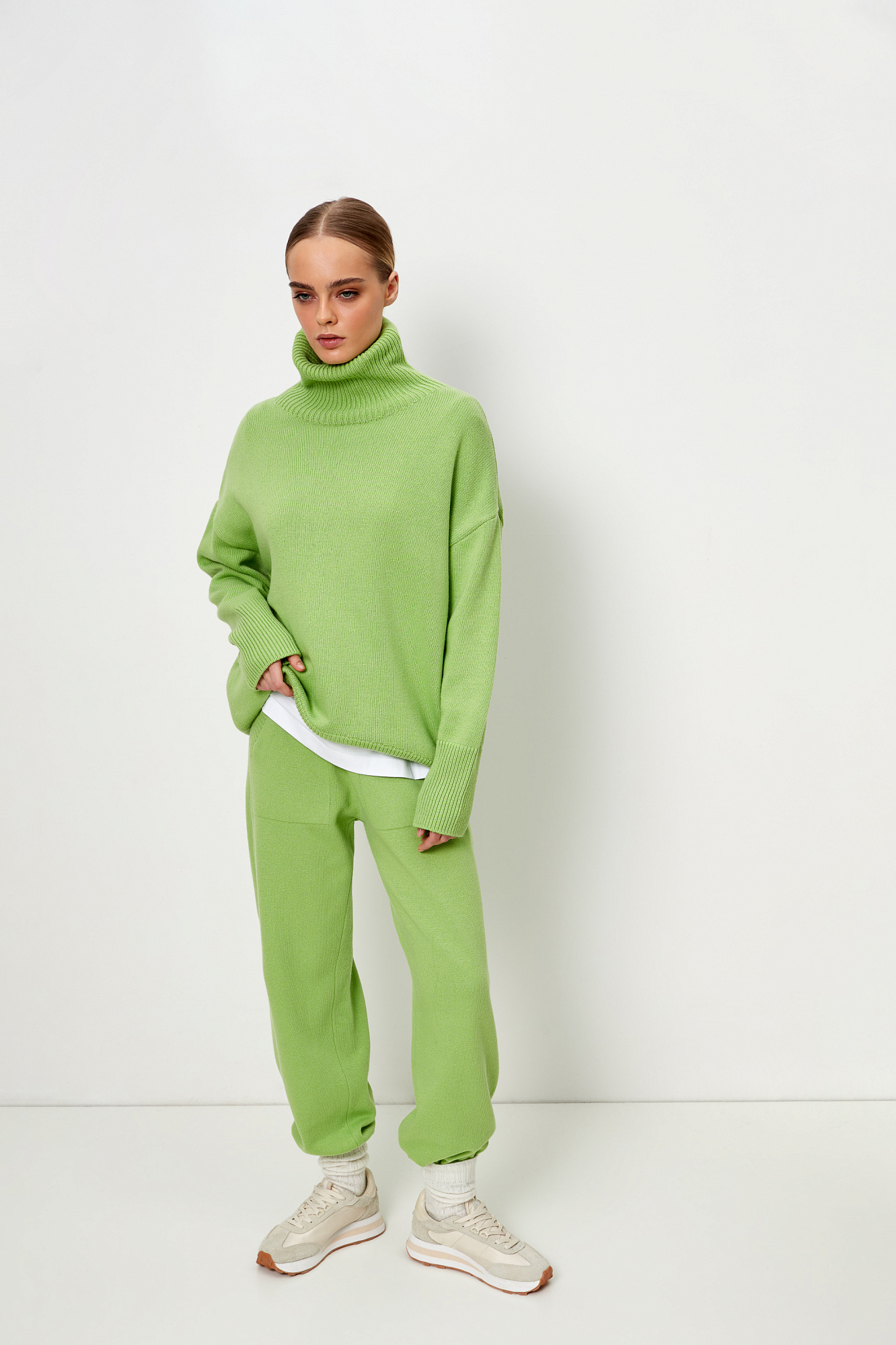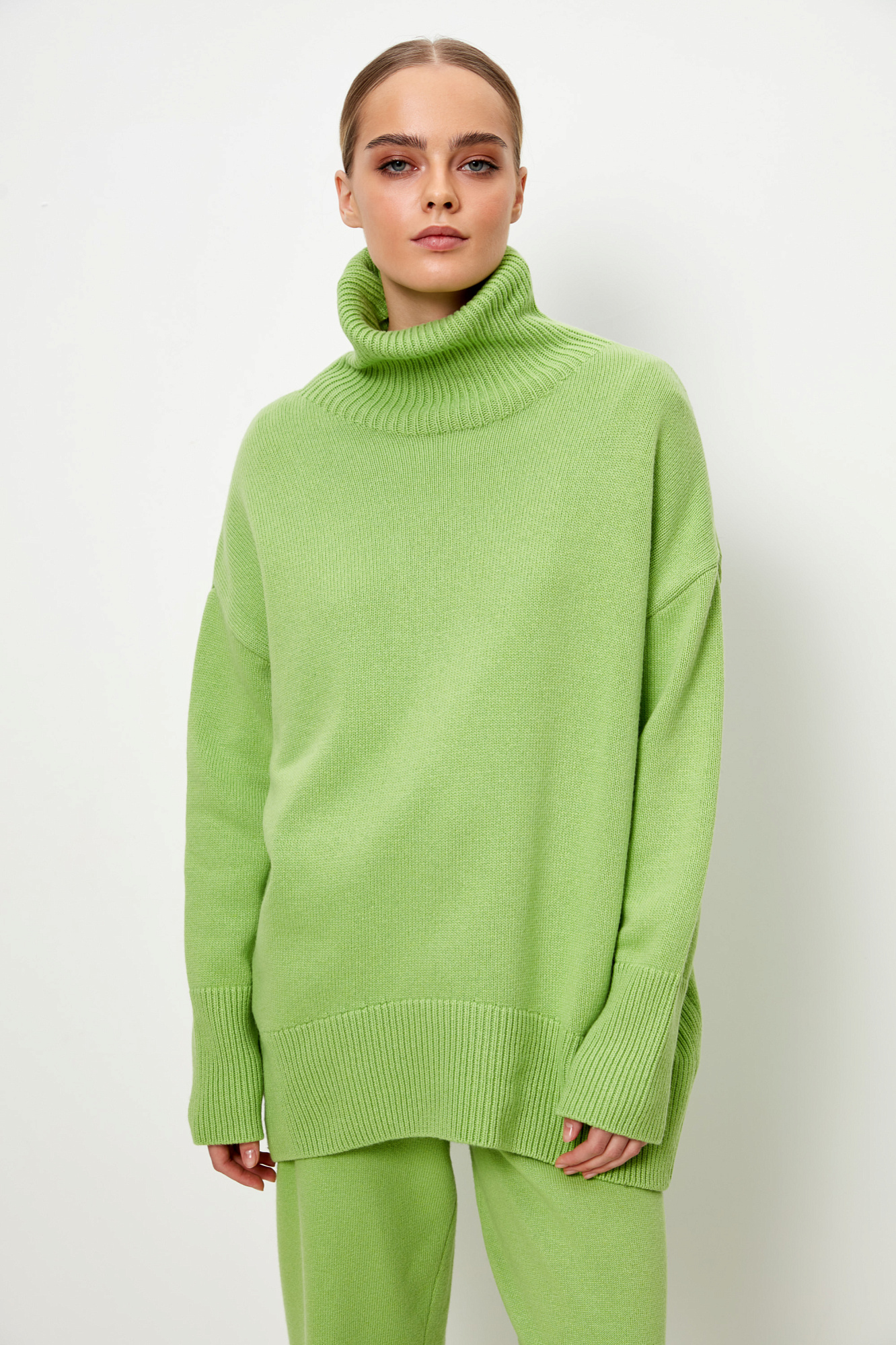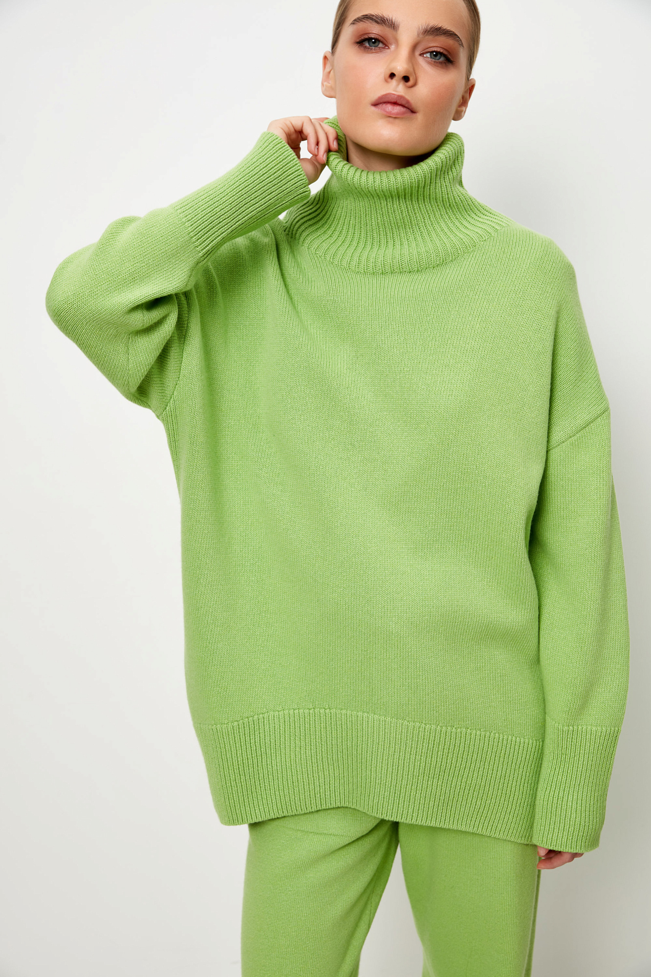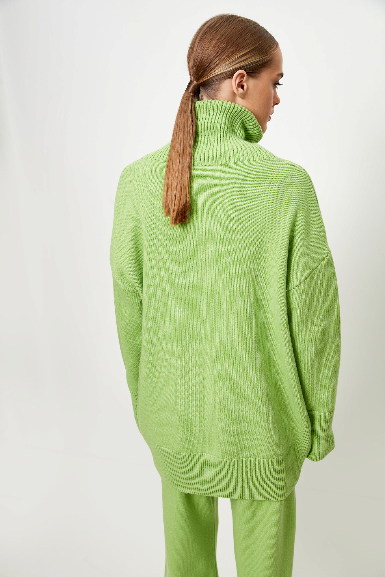 Трикотажный джемпер из мягкой шерсти с добавлением кашемира. Высокий ворот, заниженная линия плеч, удлиненная спинка. Края изделия сделаны в широкий рубчик. Можно дополнить комплектными брюками.
