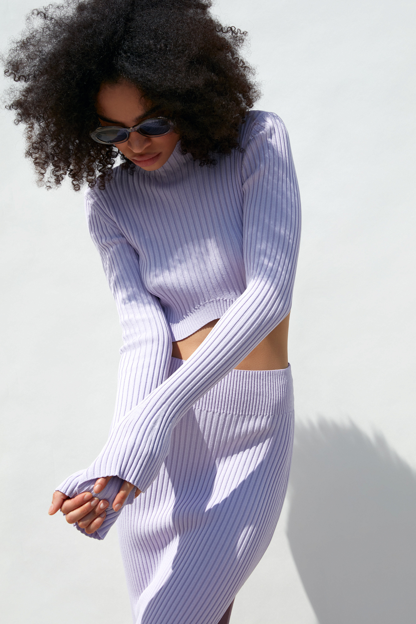 Трикотажный топ в рубчик с длинным рукавом и фигурным низом. Дополнить образ можно юбкой в таком же стиле.