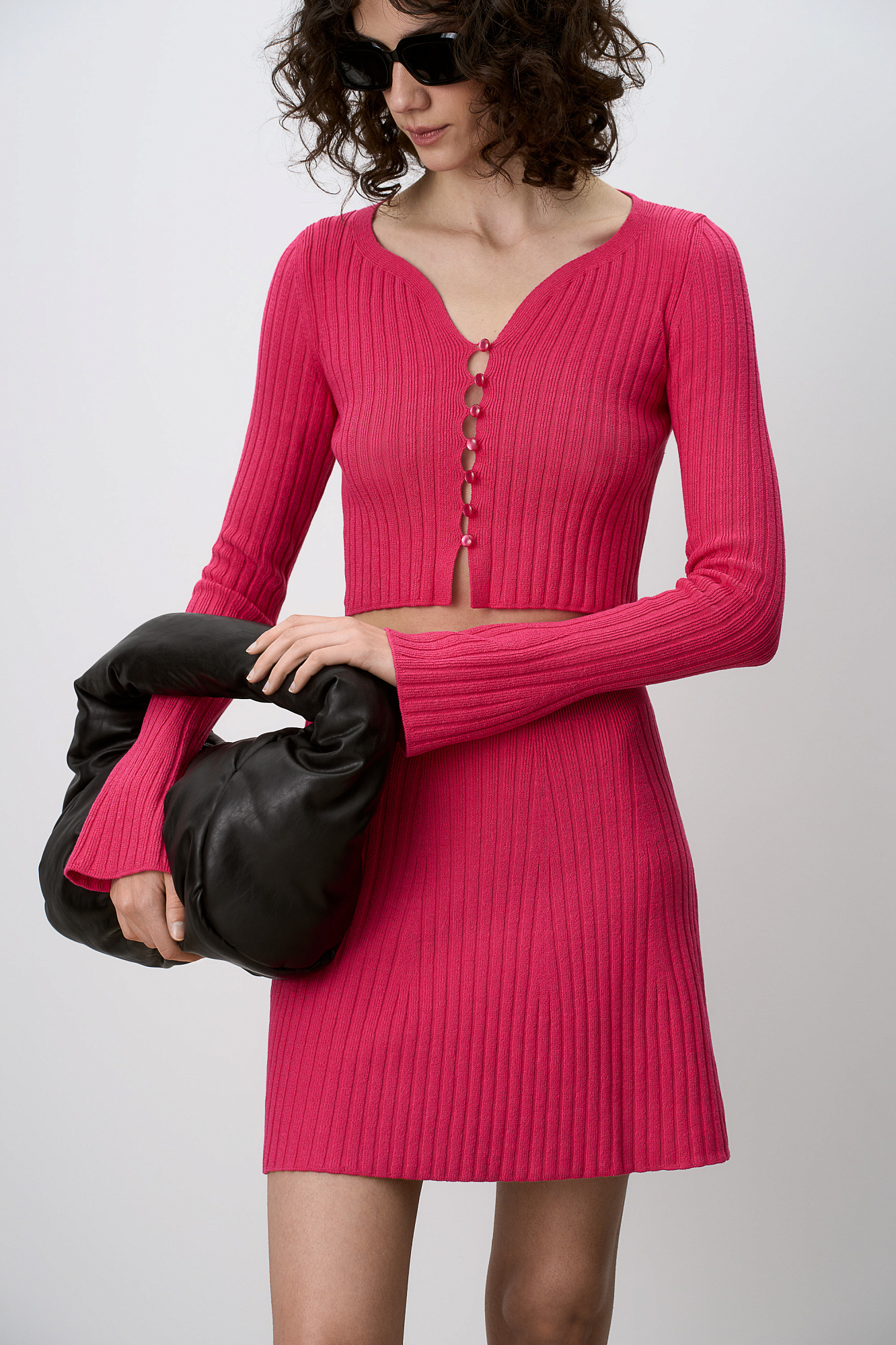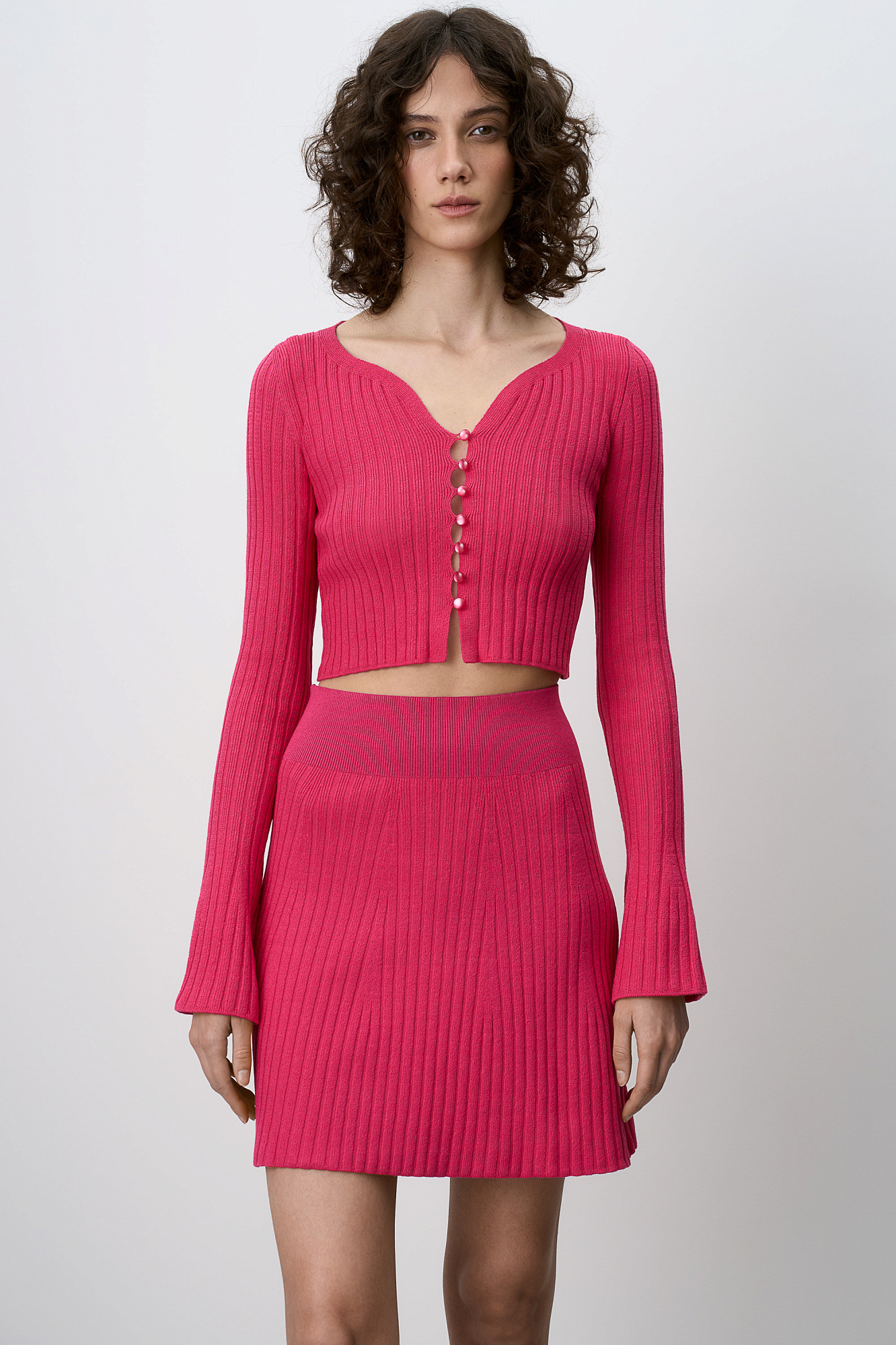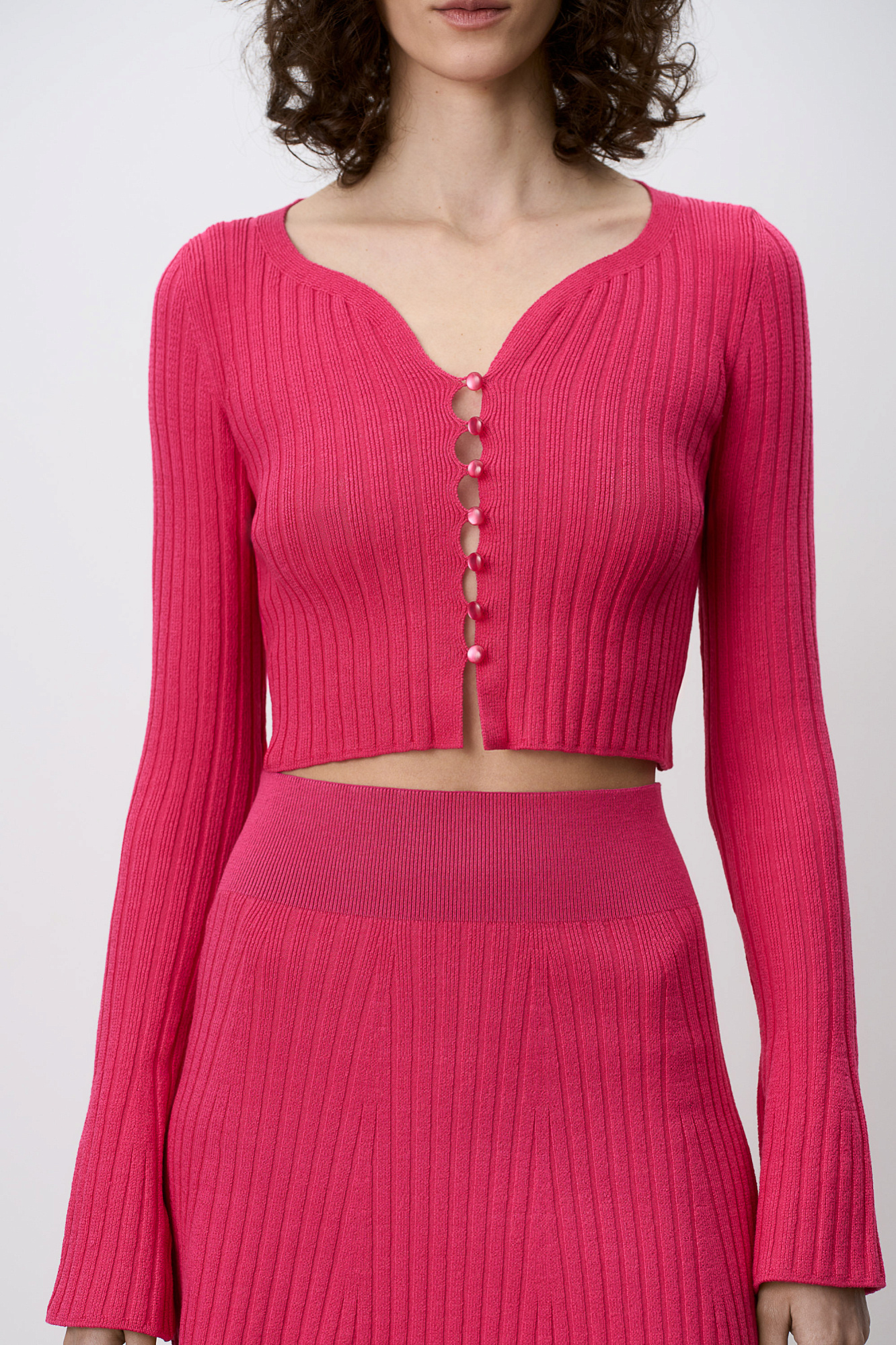 Трикотажный укороченный топ из хлопка с расклешёнными рукавами, застегивается на пуговицы.