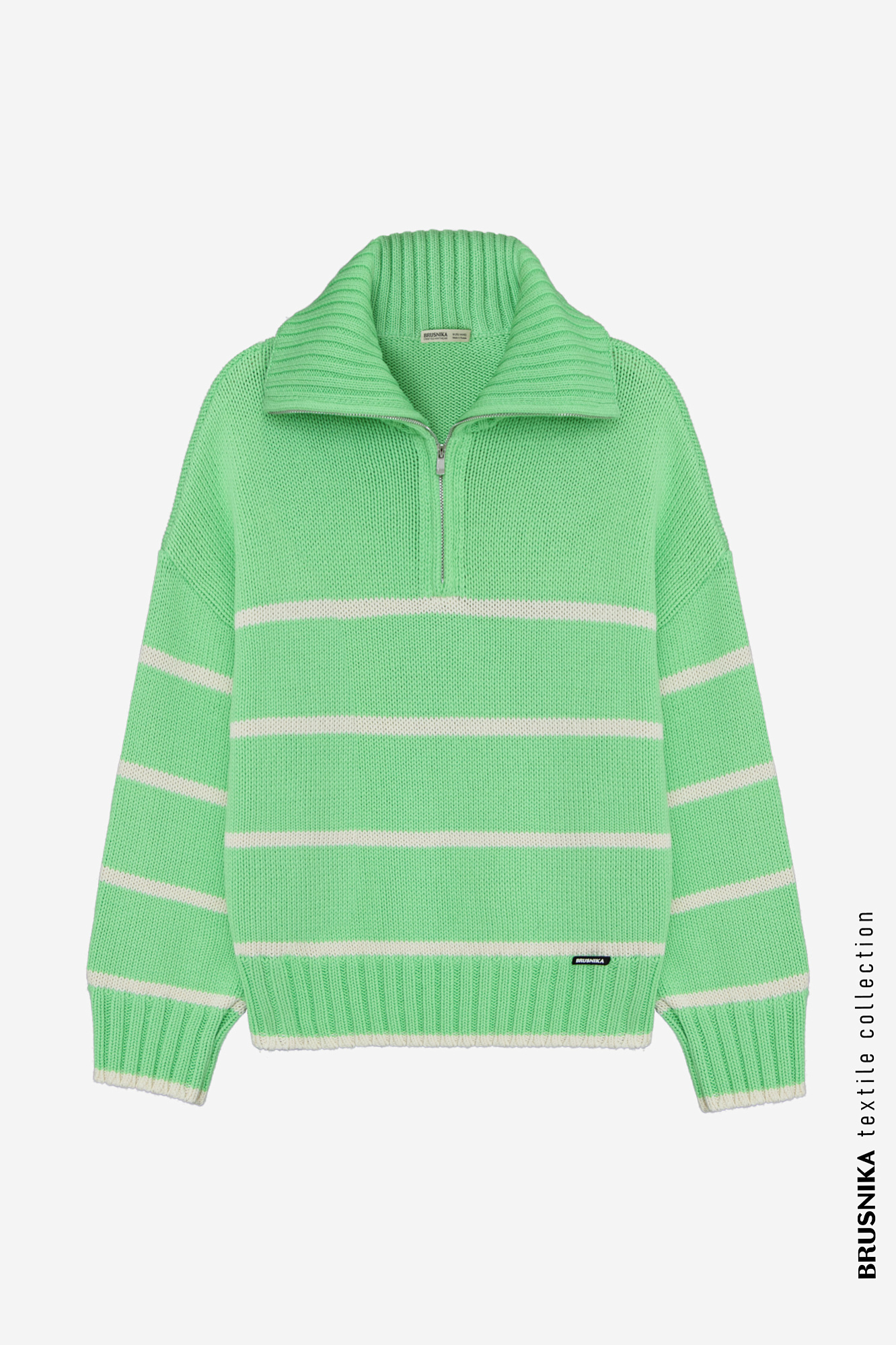 Трикотажный джемпер в полоску из 100% хлопка. Воротник-стойка на молнии. Низ изделия с брендированным ярлыком.