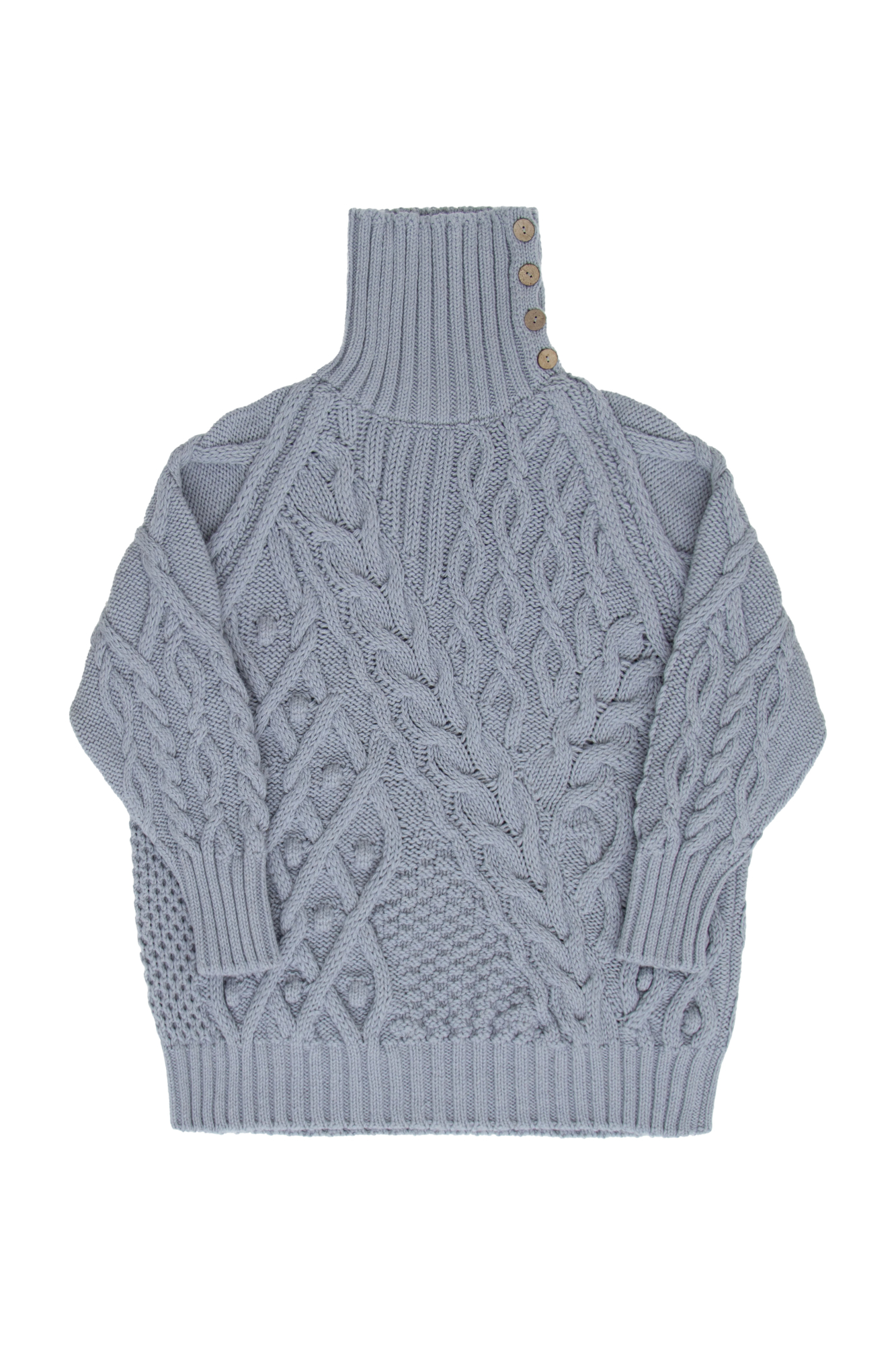 Объемный джемпер из шерсти альпака. Высокий ворот на деревянных пуговицах.