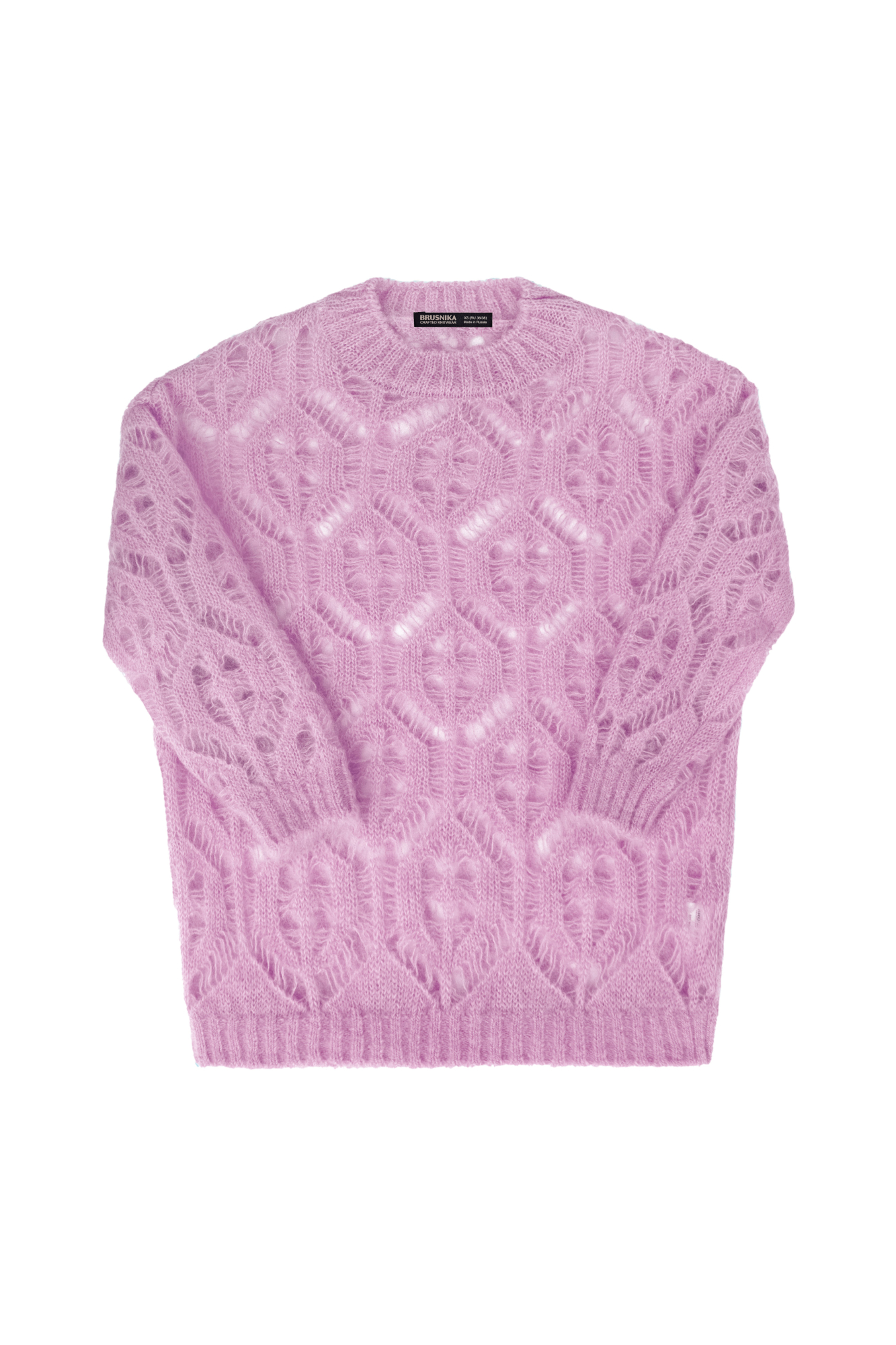 Трикотажный джемпер из мохера с добавлением шерсти. Модель свободного силуэта со спущенным плечом выполненная ажурным переплетением. Края изделия в рубчик.