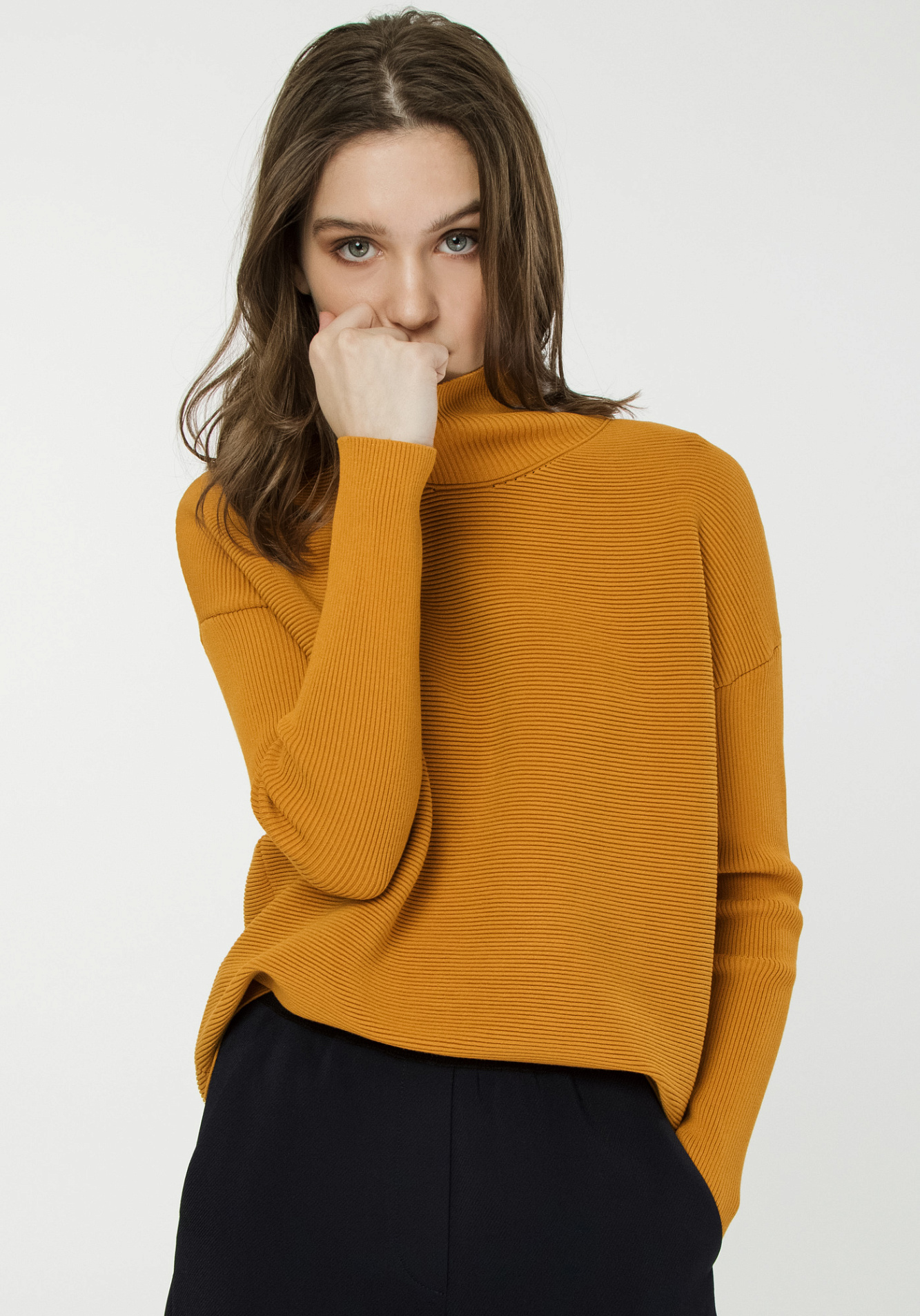 Трикотажный джемпер из вискозы в мелкий валик. Модель с длинным рукавом и воротником-стойкой.