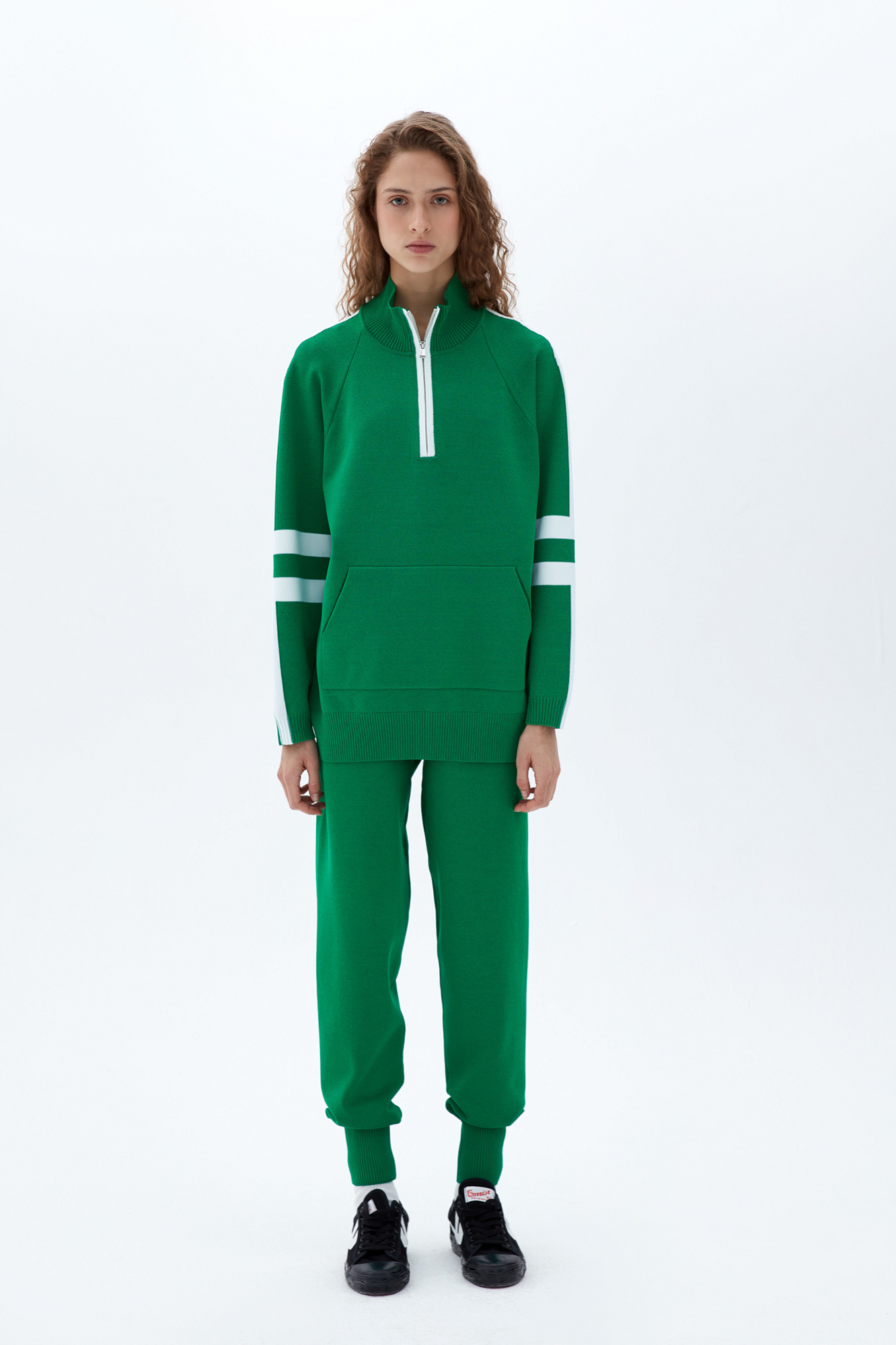 Джемпер из вискозы в спортивном стиле. Лампасы на рукавах. Высокий воротник. Застежка-молния.