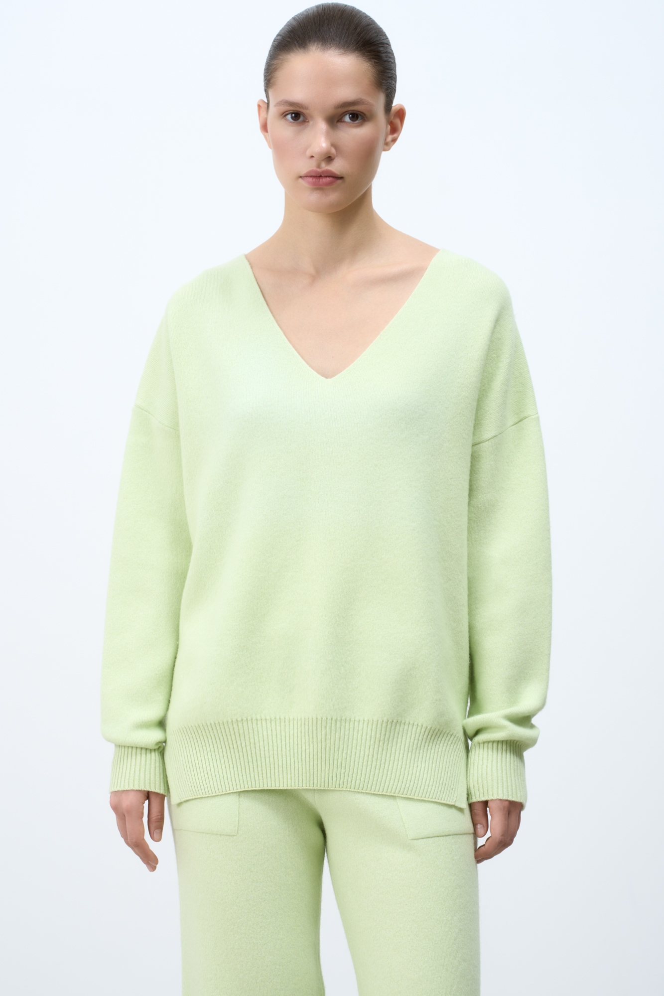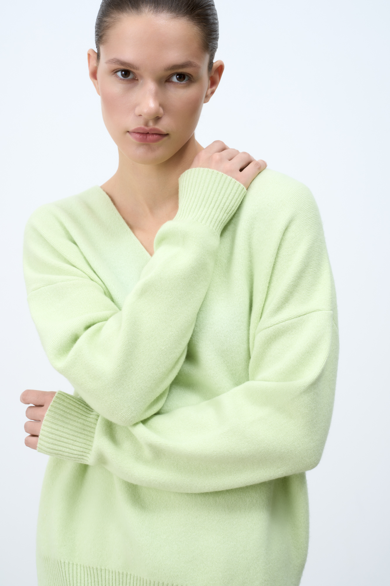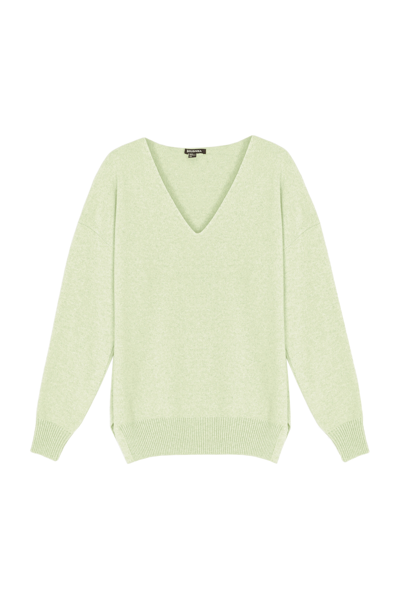 Кашемировый джемпер с V-образным вырезом и спущенным плечом.