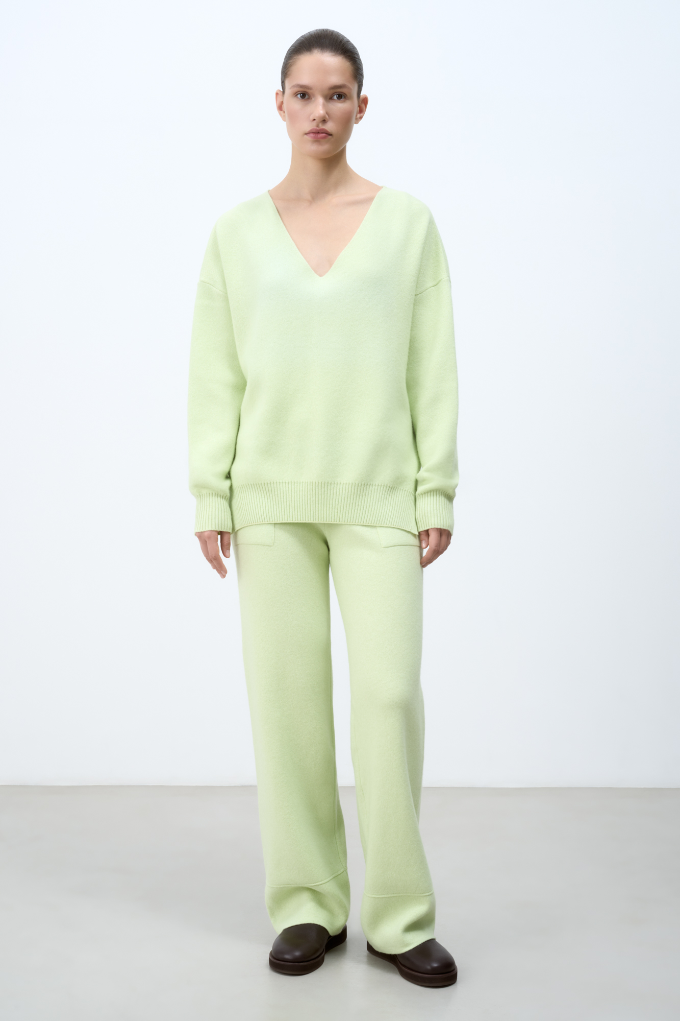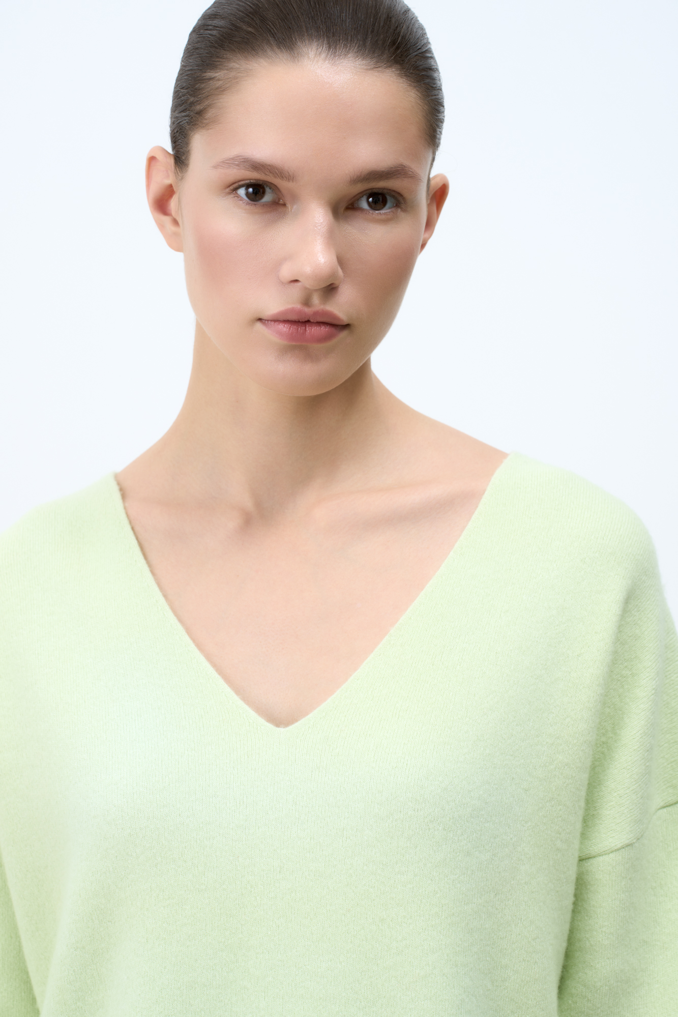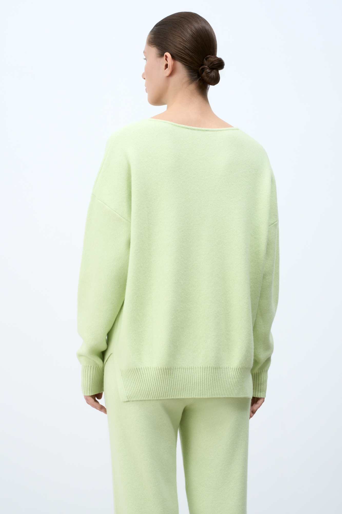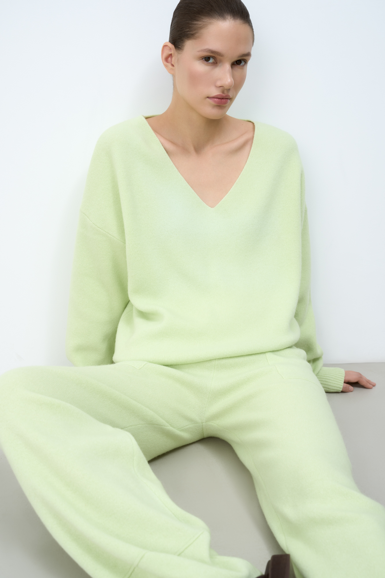 Кашемировый джемпер с V-образным вырезом и спущенным плечом.