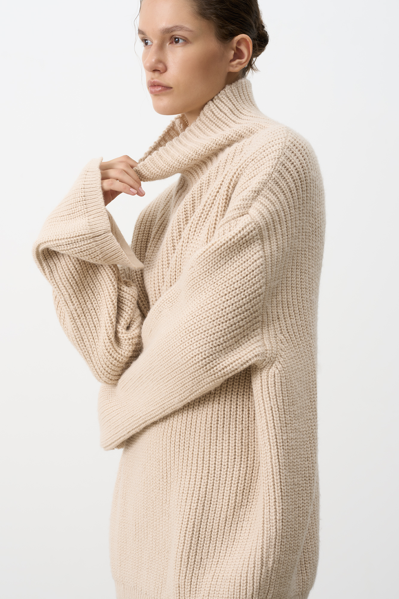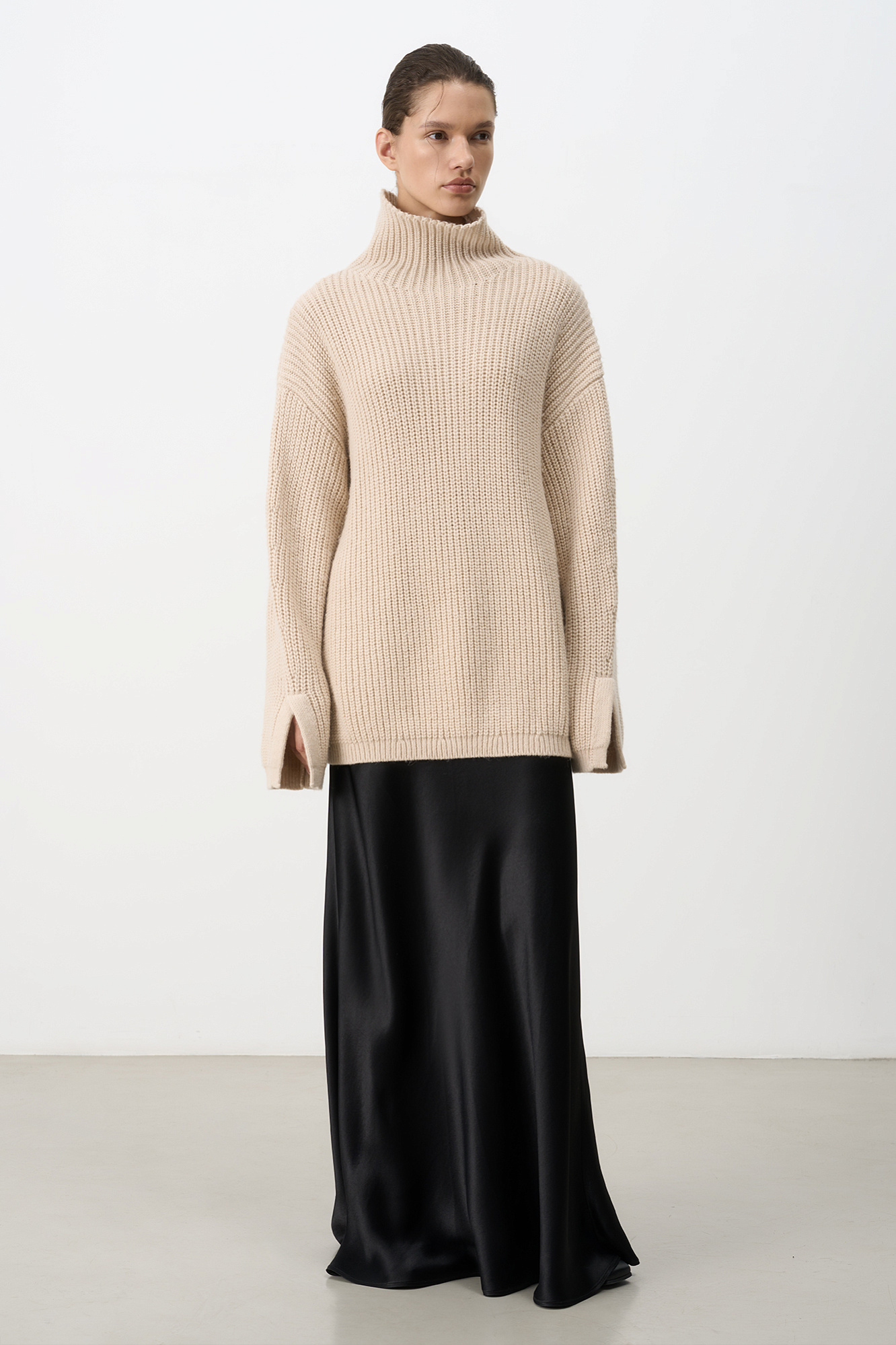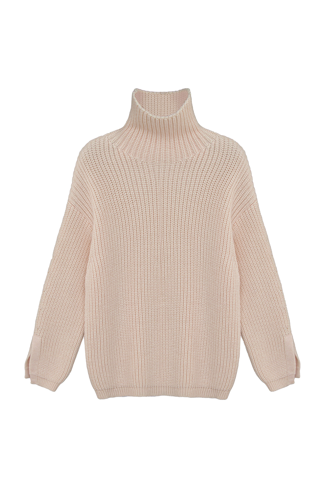 Трикотажный джемпер с шерстью альпака. Модель свободного силуэта со спущенным плечом, высоким воротом и разрезами на манжетах.