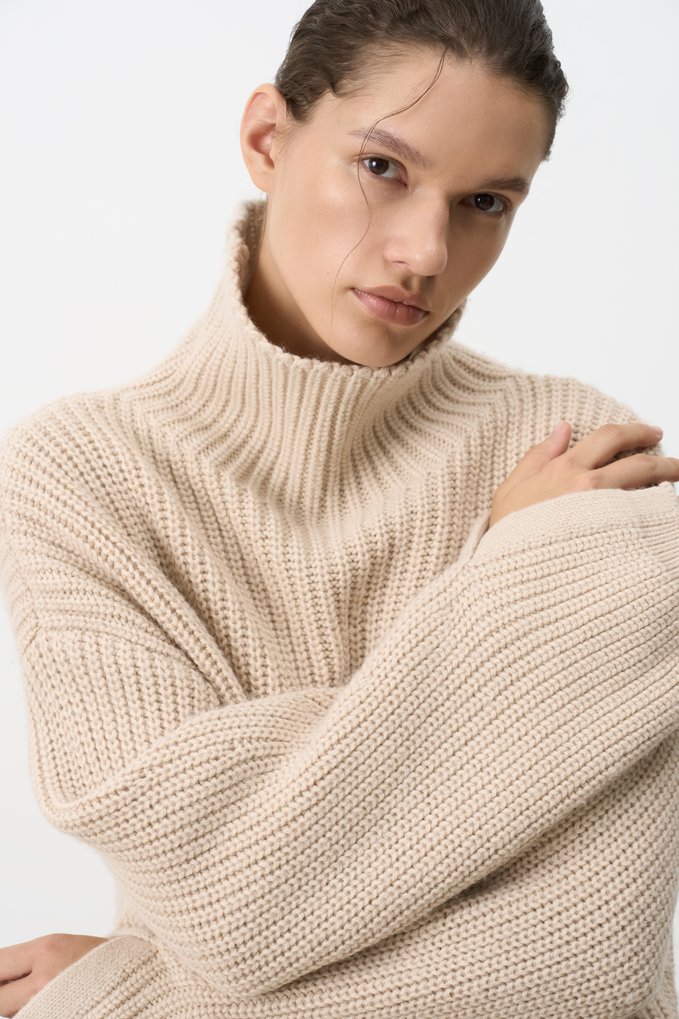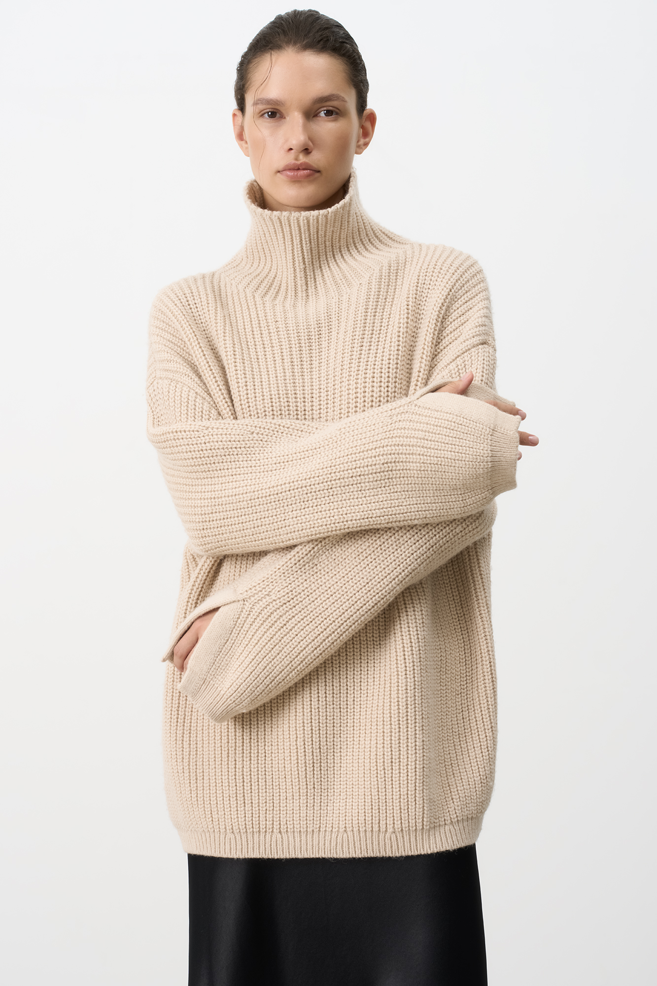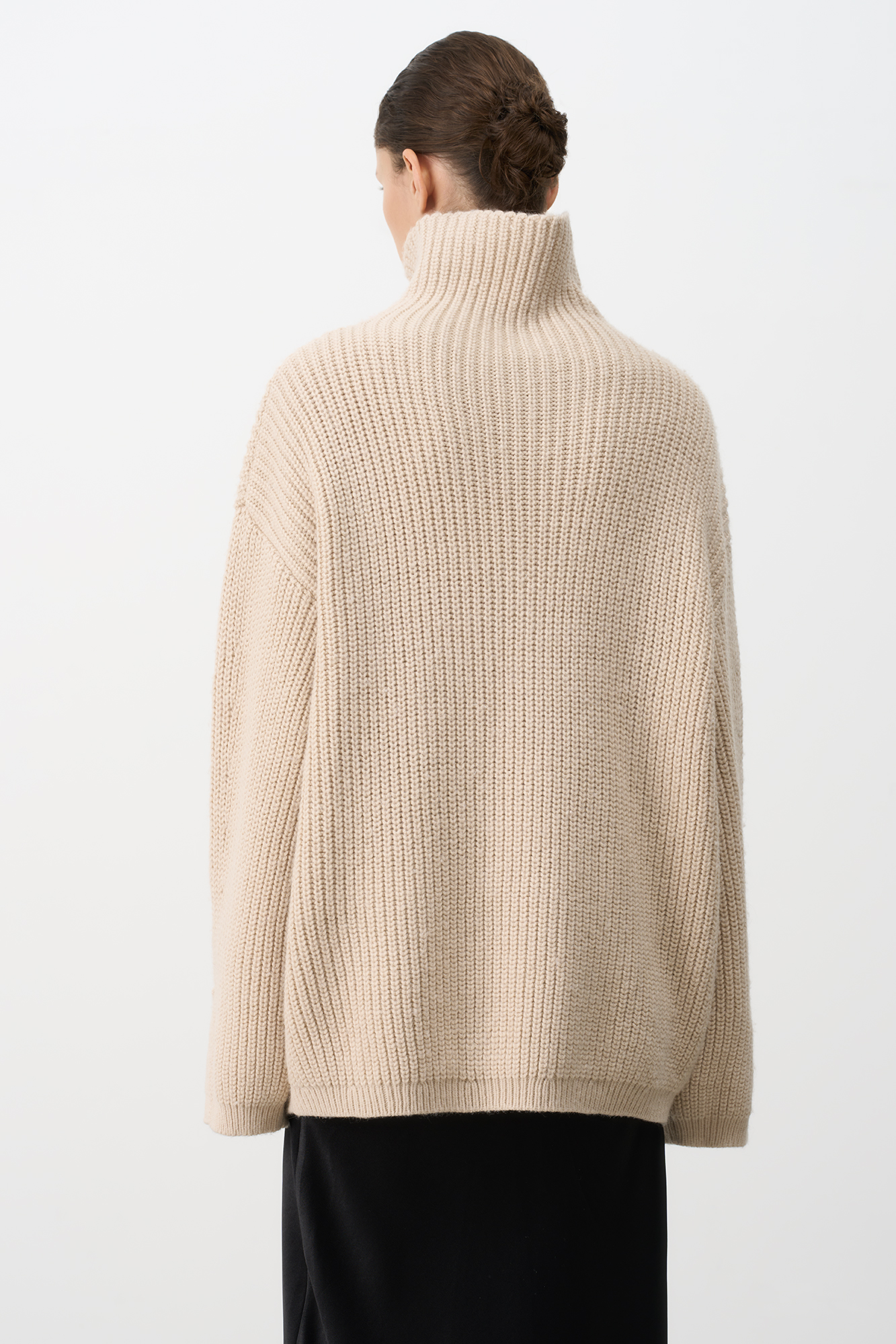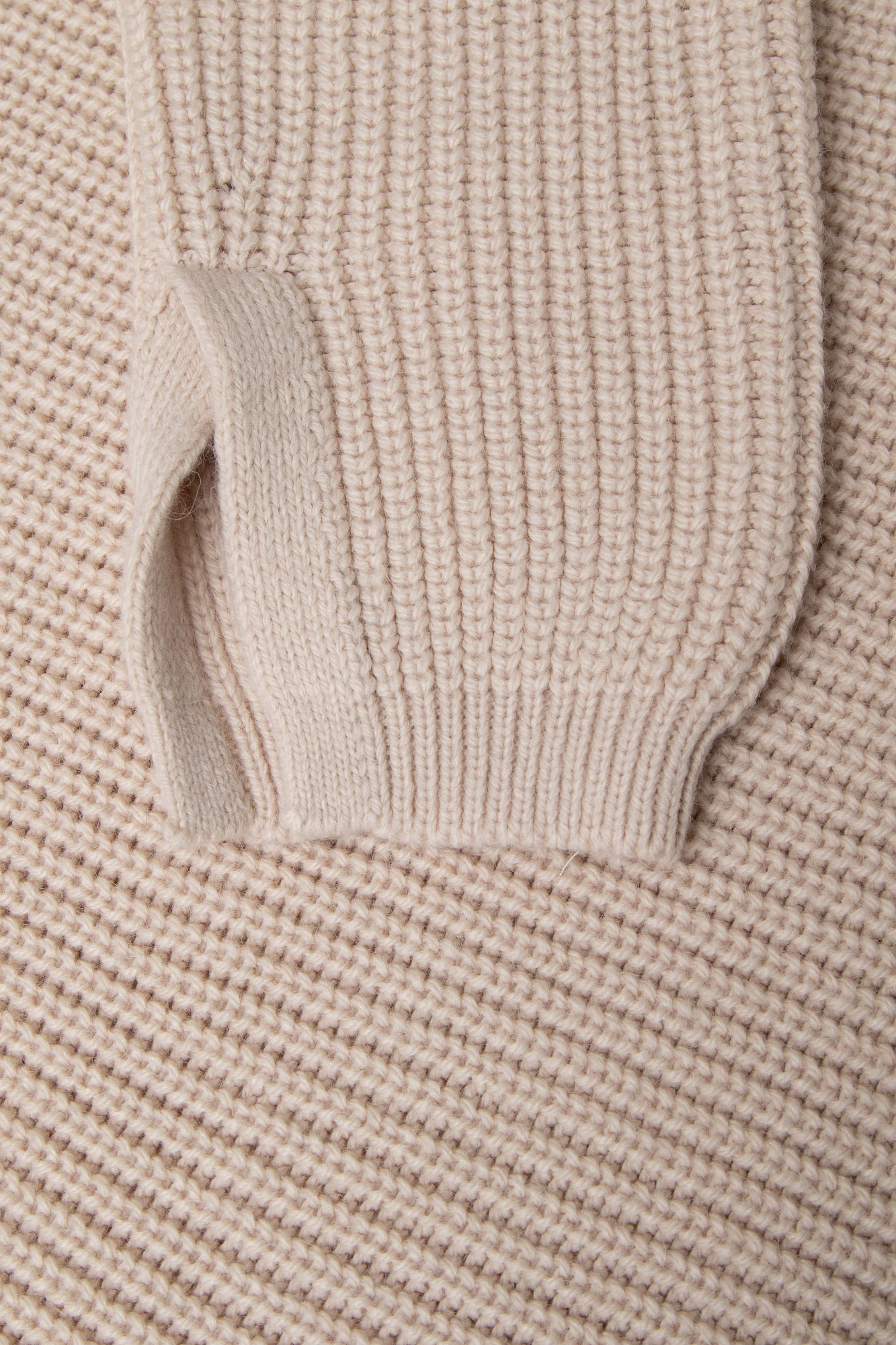 Трикотажный джемпер с шерстью альпака. Модель свободного силуэта со спущенным плечом, высоким воротом и разрезами на манжетах.