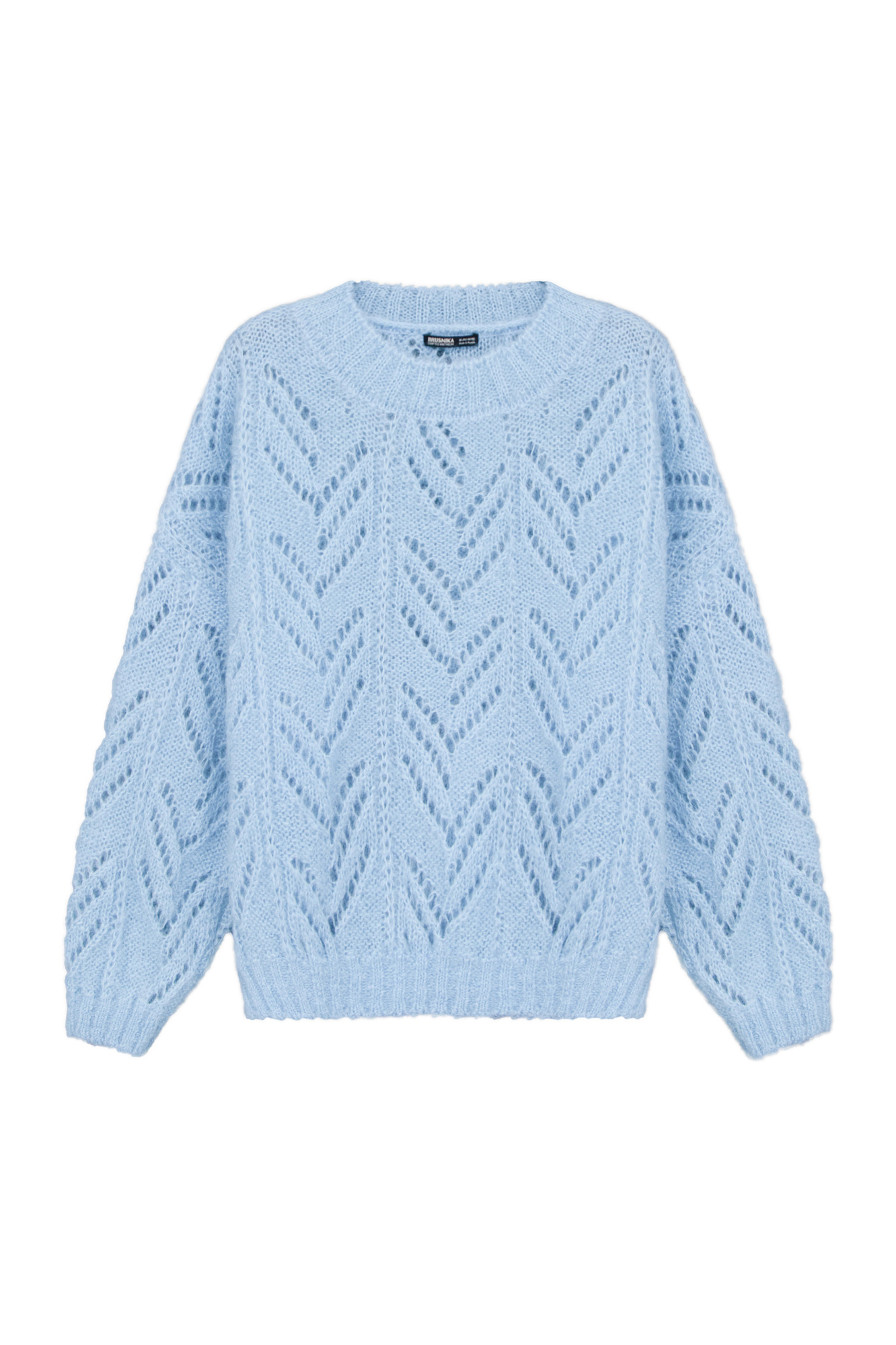 Трикотажный джемпер из мохера. Модель свободного силуэта со спущенным плечом, выполнена ажурным переплетением. Края изделия в рубчик.