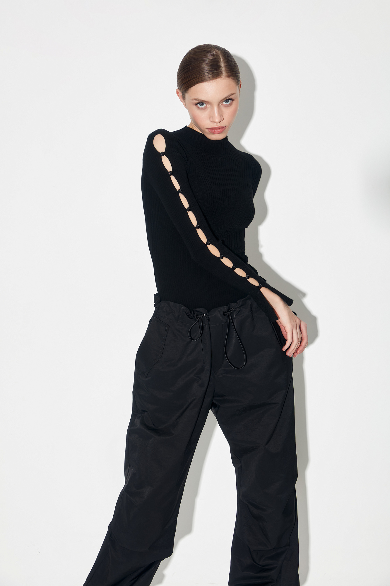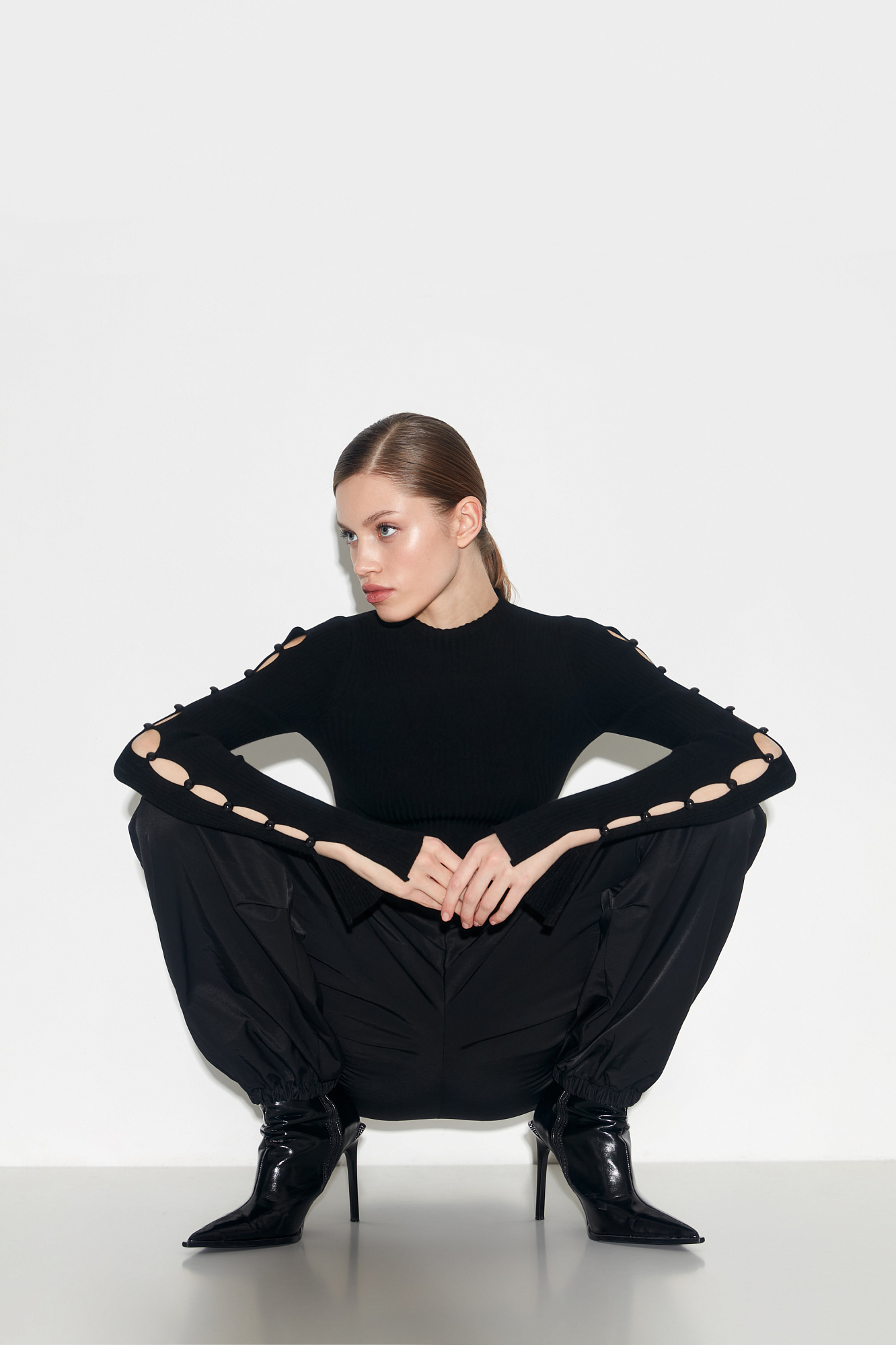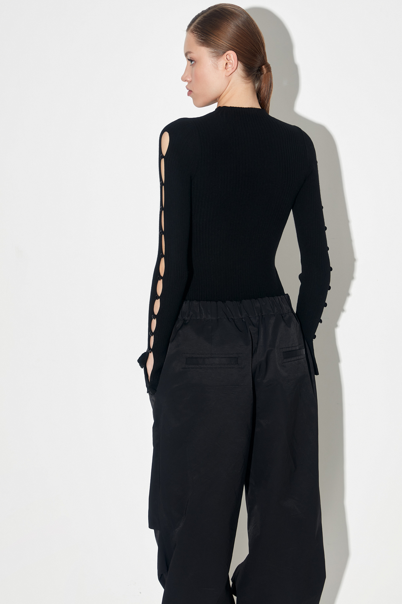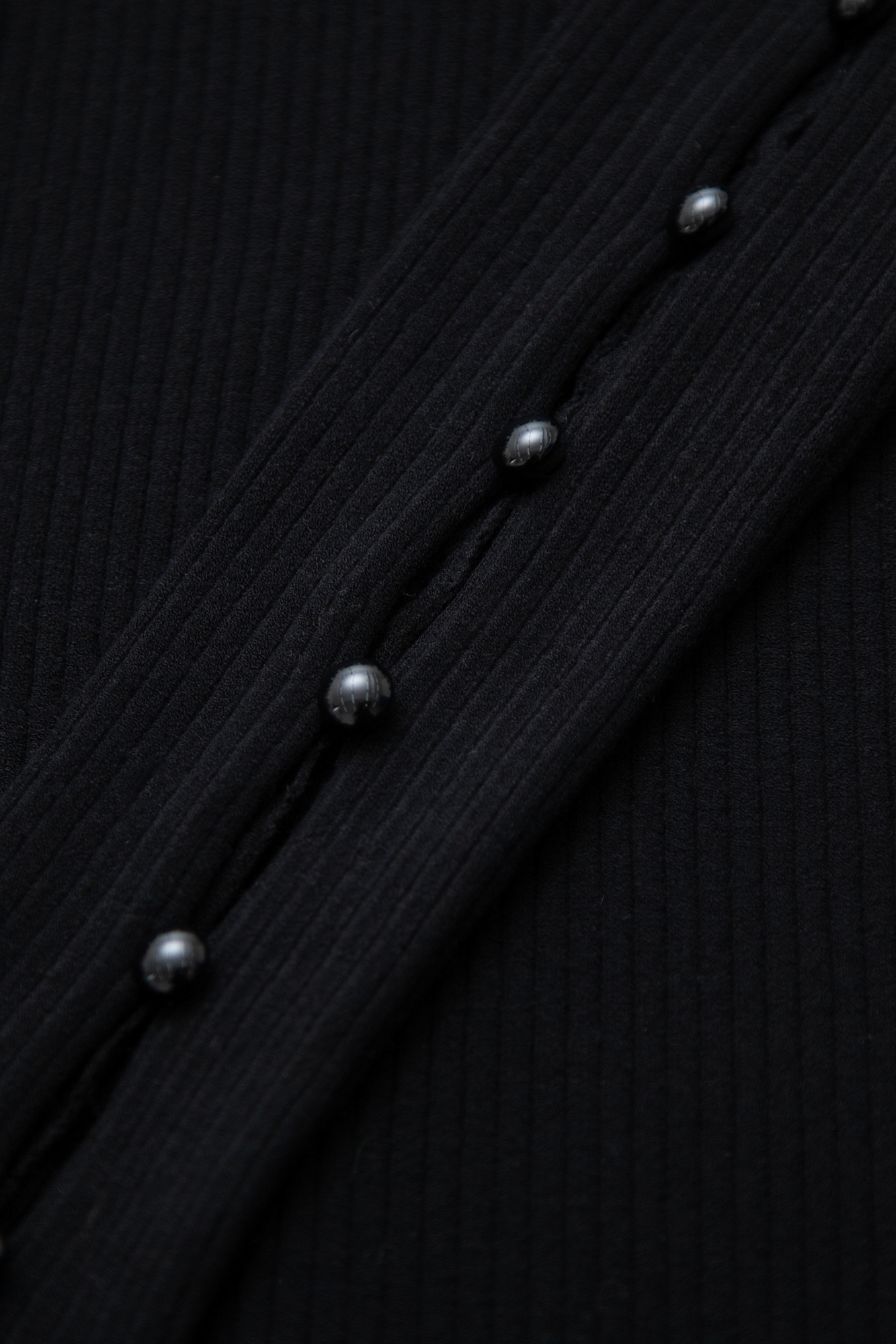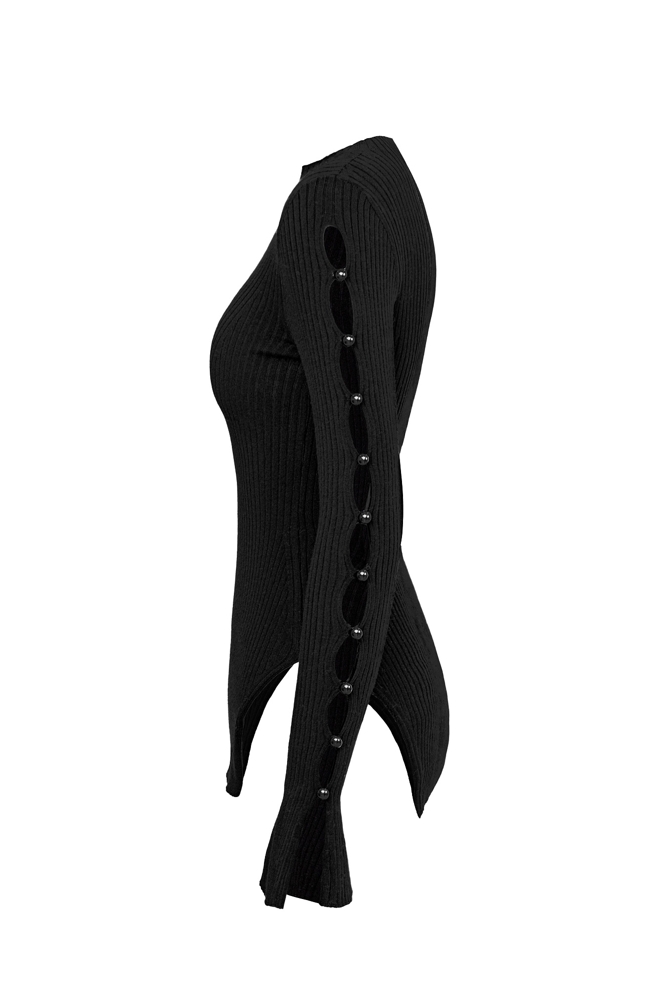 Трикотажный топ из вискозы. Модель приталенного силуэта, разрезами по бокам, с длинными рукавами на пуговицах, невысоким воротником-стойкой и декоративными сбавками на груди.
