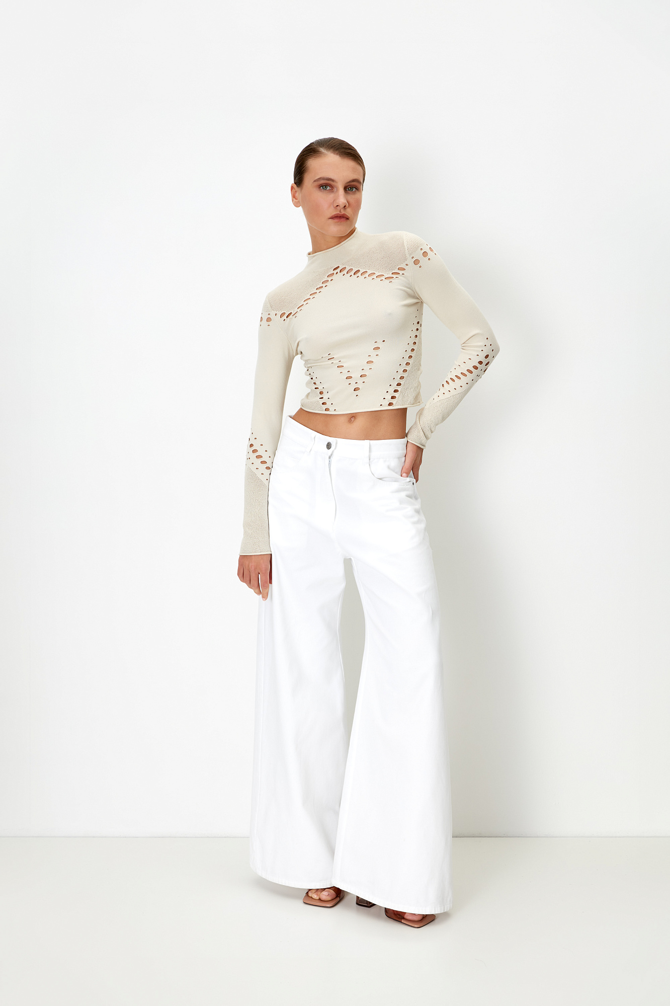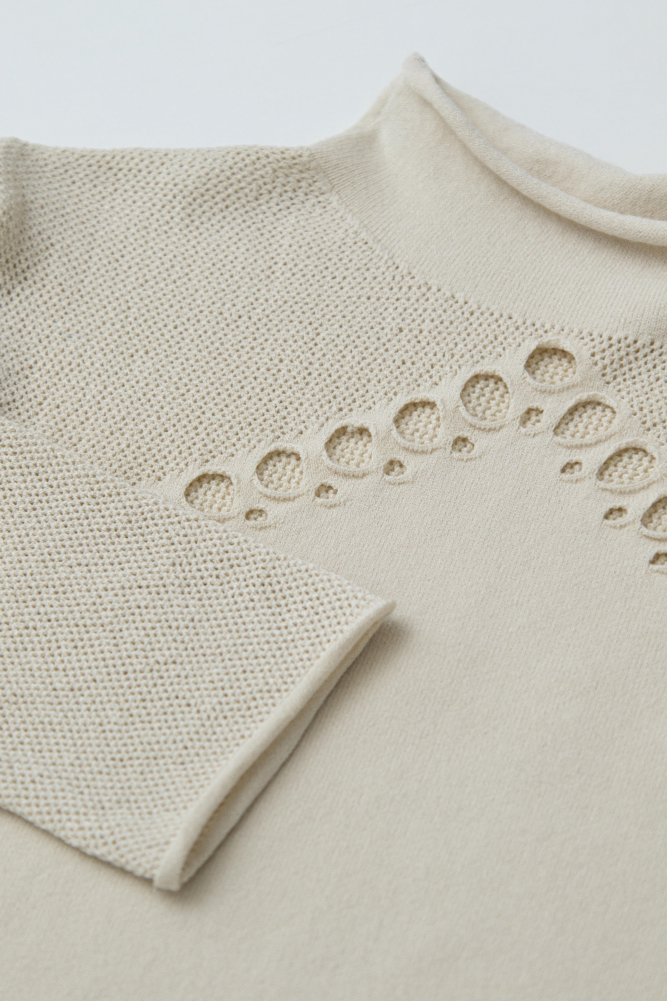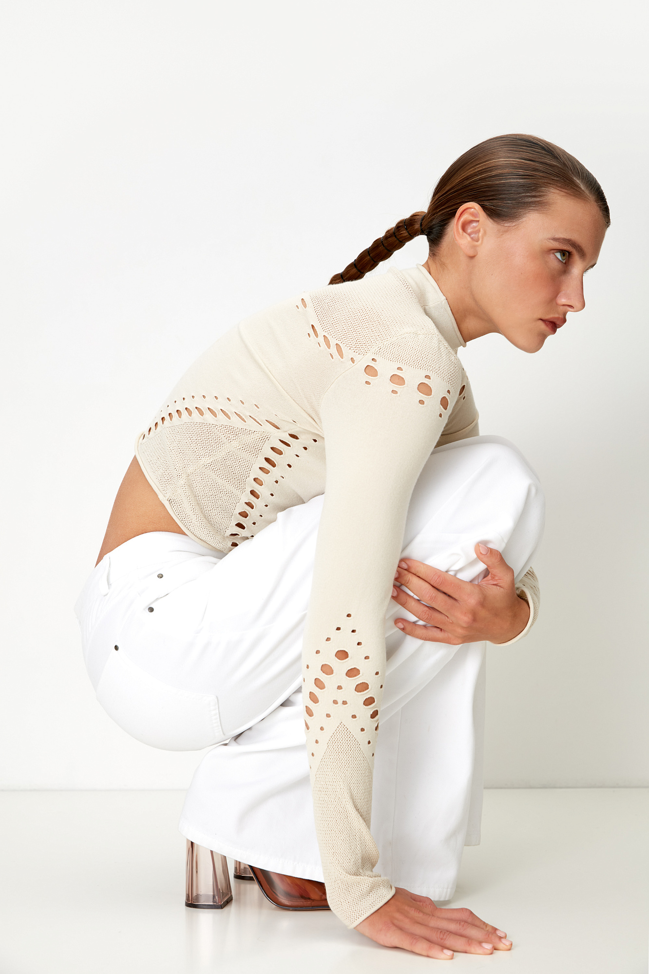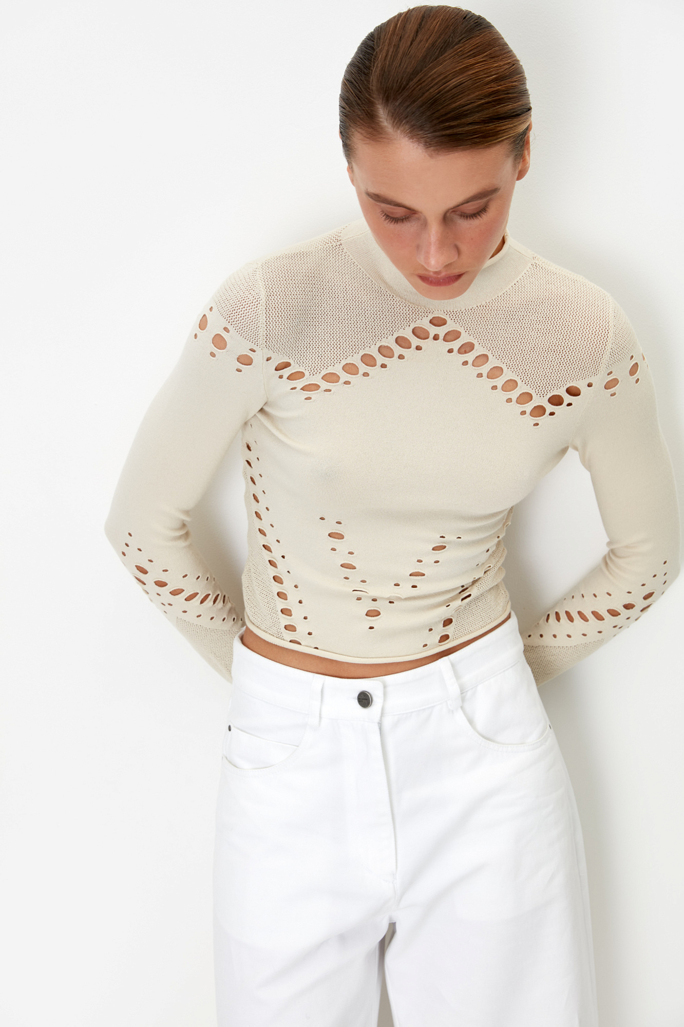 Трикотажная укороченная водолазка из тонкой эластичной вискозы. Модель облегающего силуэта, с длинными рукавами и невысоким воротником-стойкой. Изделие выполнено в комбинированной технике вязки, сочетающей гладь и сетку. Водолазка декорирована вырезами, создающими геометрический узор.