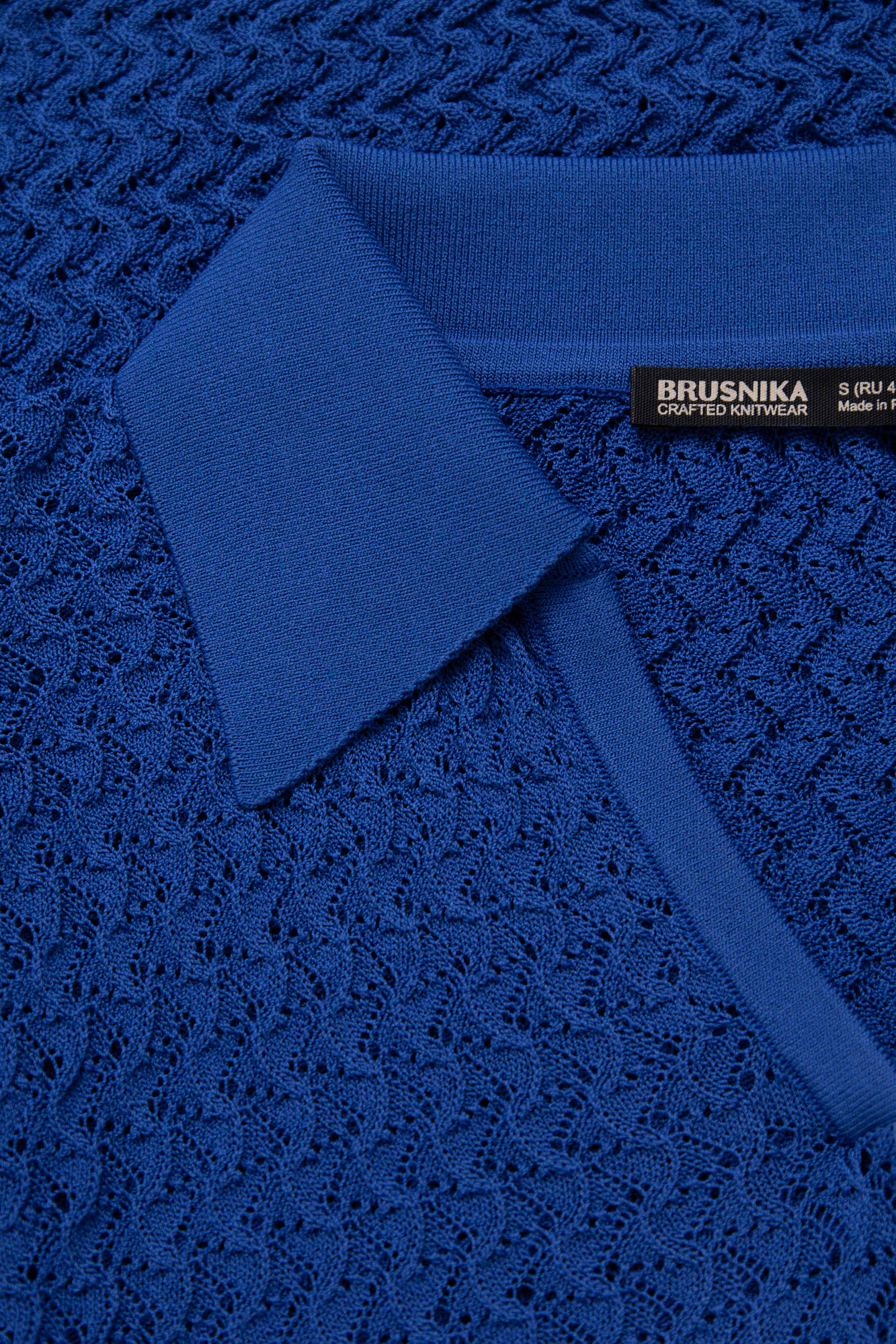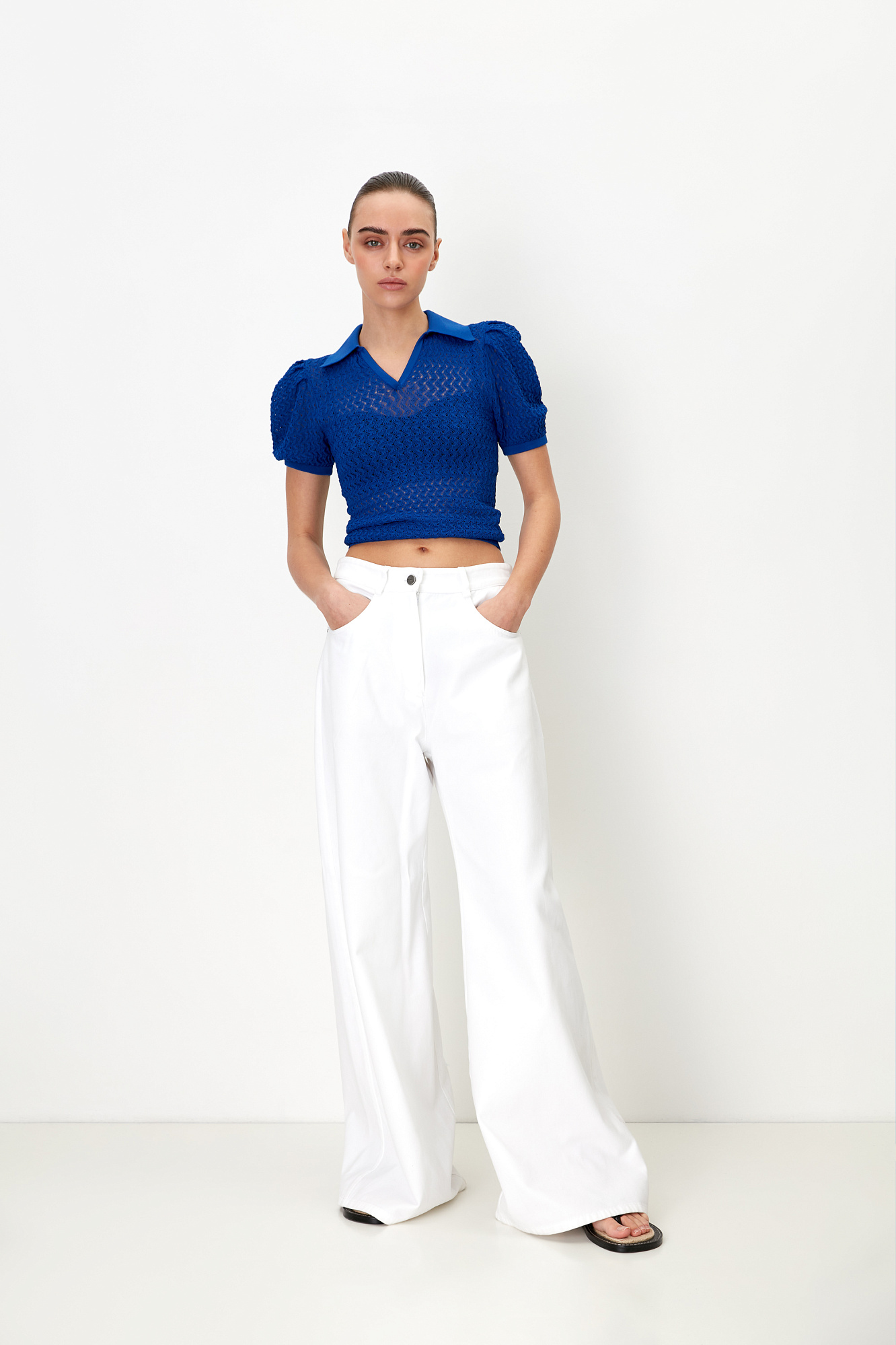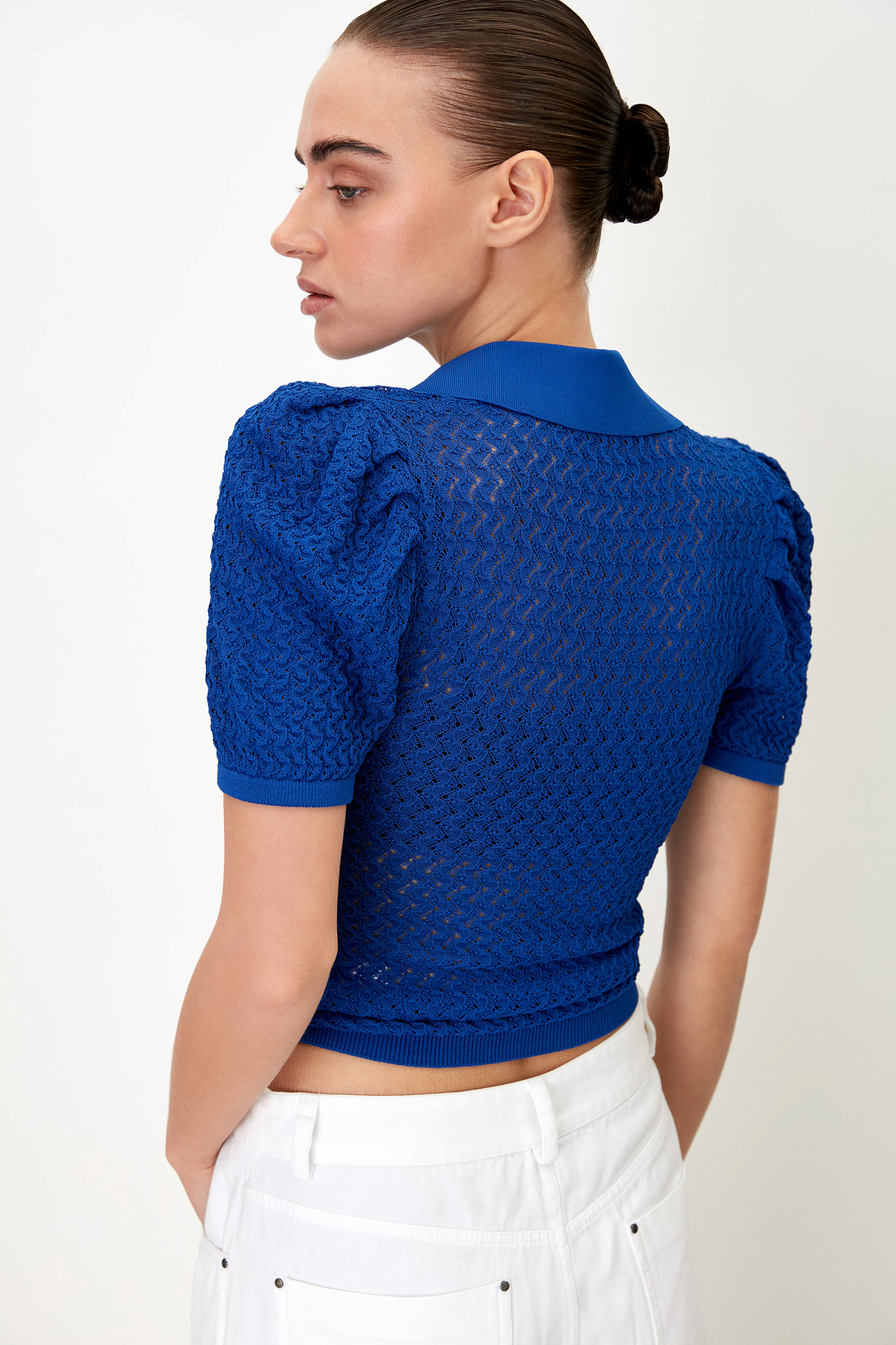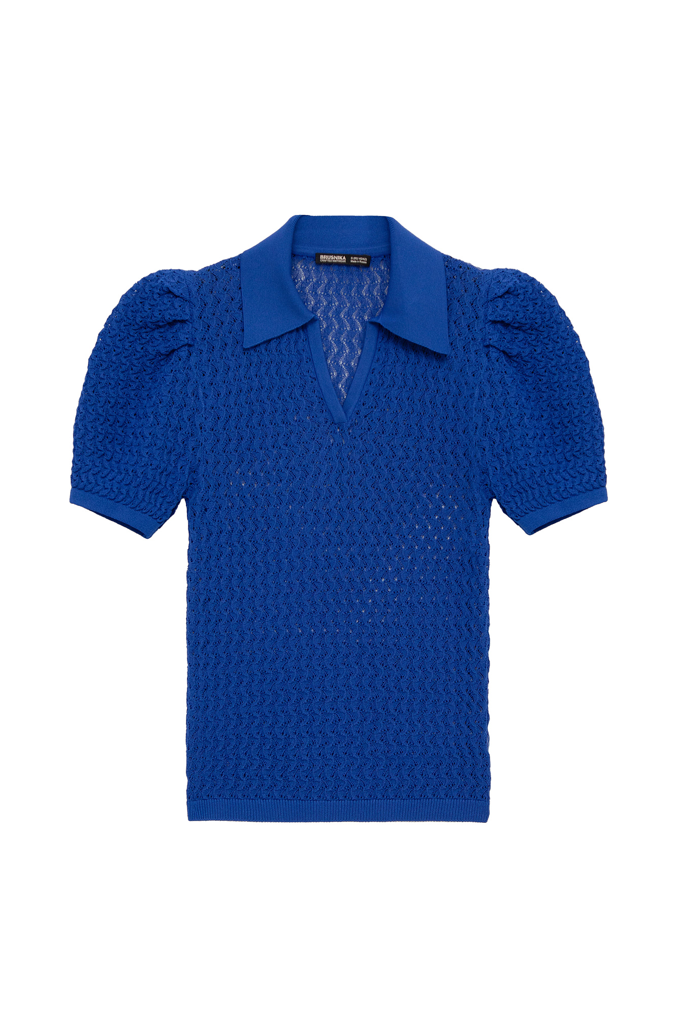 Трикотажная ажурная футболка из вискозы. Модель приталенного силуэта с воротником-поло и коротким рукавом-фонариком.