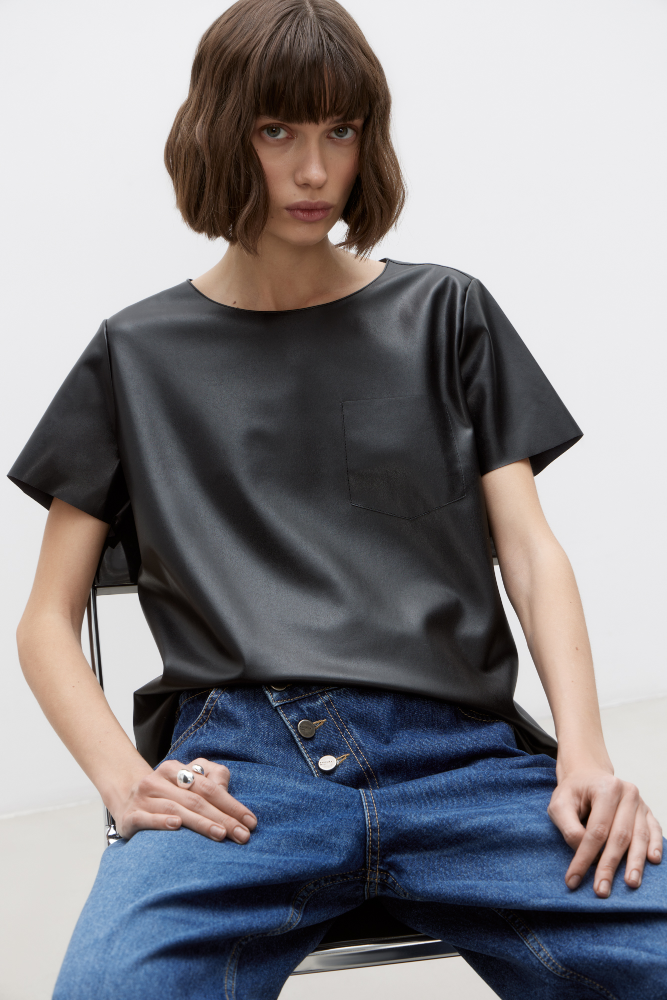Футболка из экокожи с карманом. Прямой крой, круглый вырез и короткие рукава.