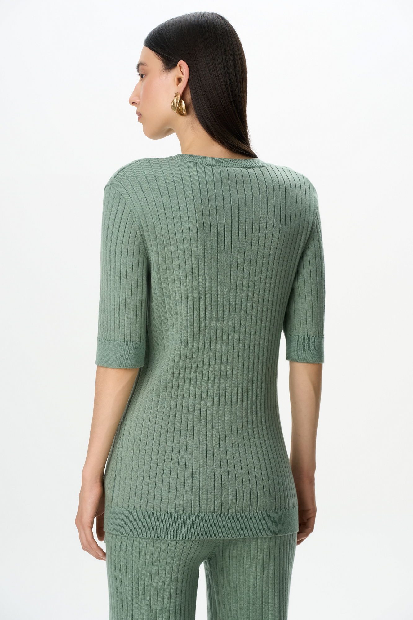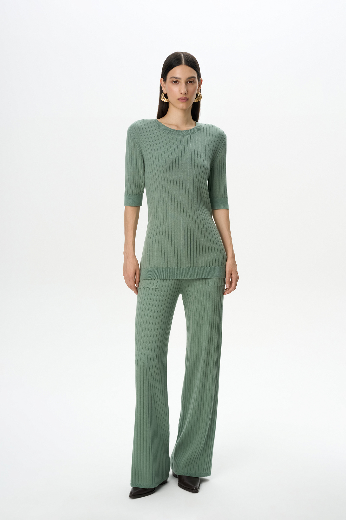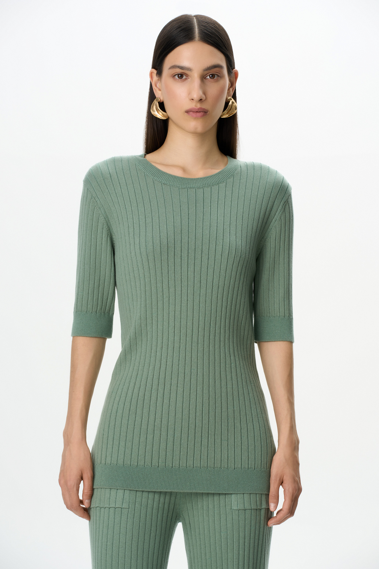 Удлиненная трикотажная футболка из хлопка с добавлением вискозы. Модель свободного силуэта. со спущенной линией плеча и круглым вырезом горловины. Дополнить образ можно брюками.