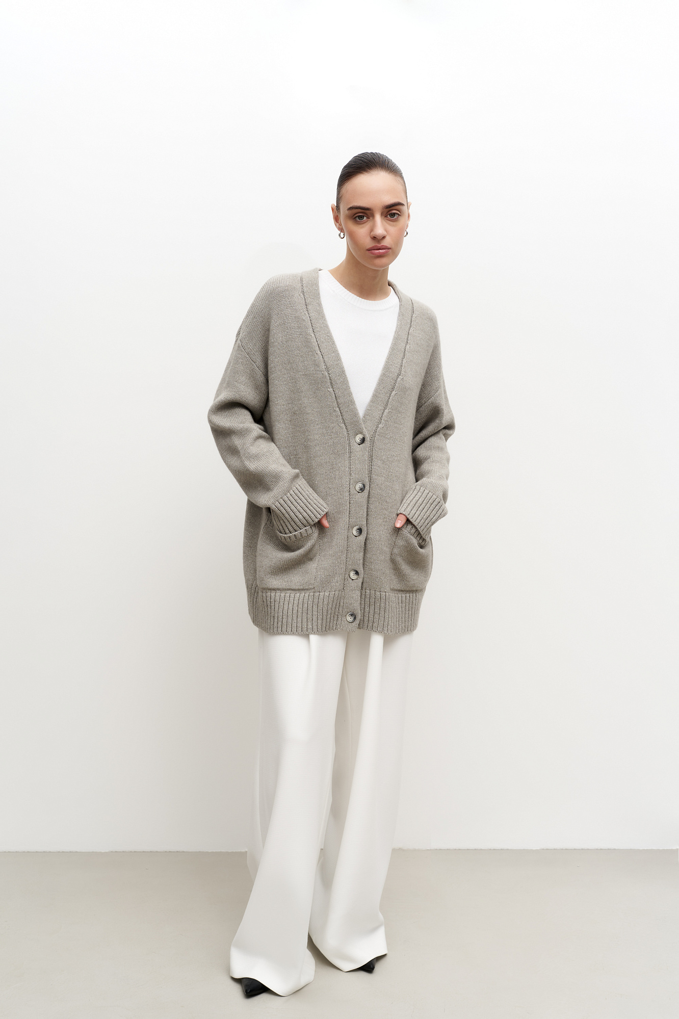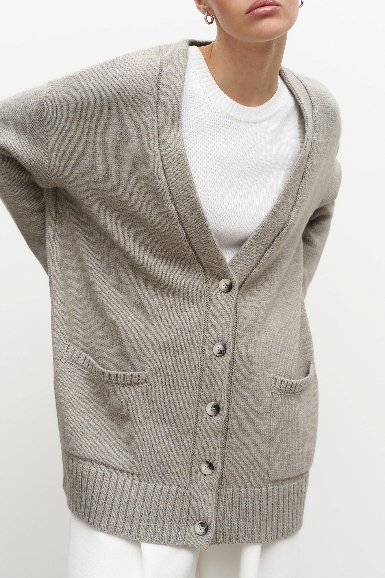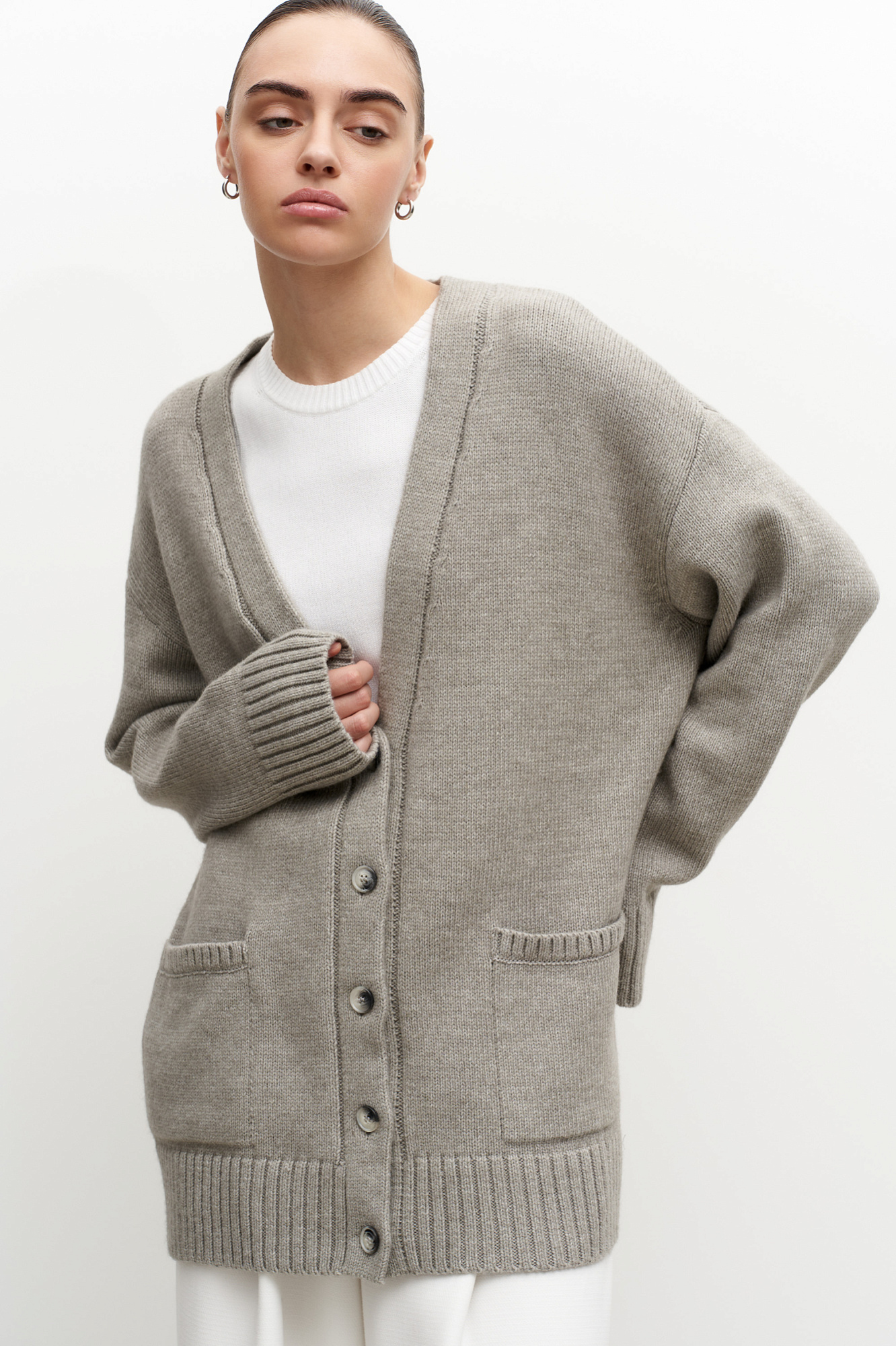 Трикотажный кардиган из шерсти альпака. Модель свободного силуэта с V-образным вырезом и накладными карманами. Края изделия в рубчик.