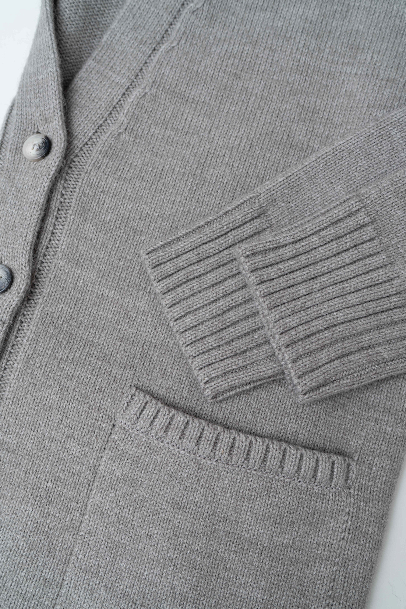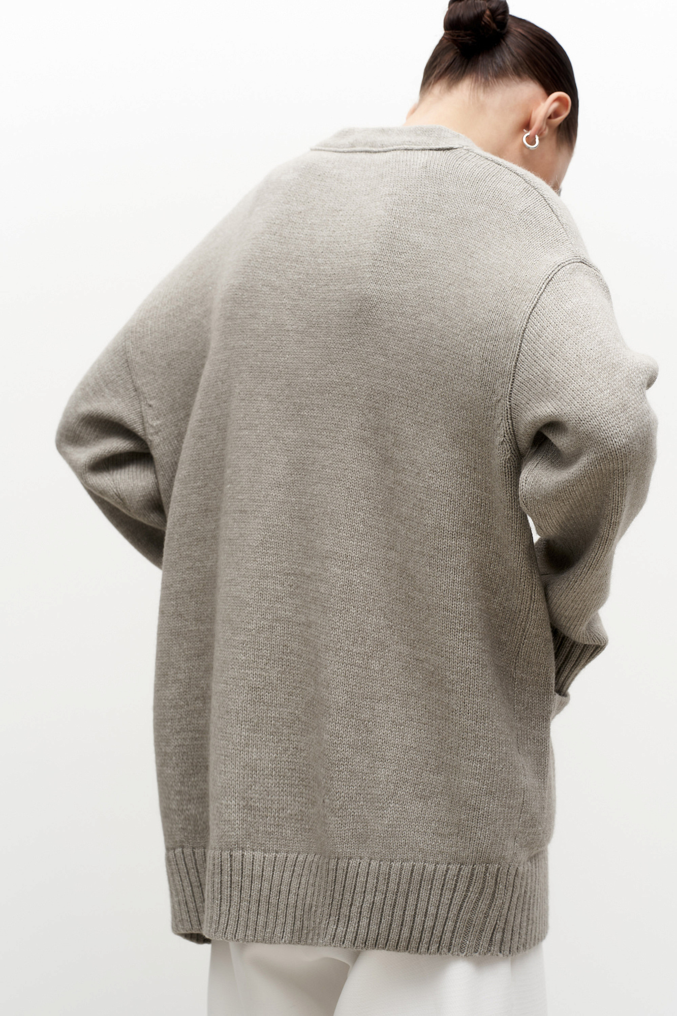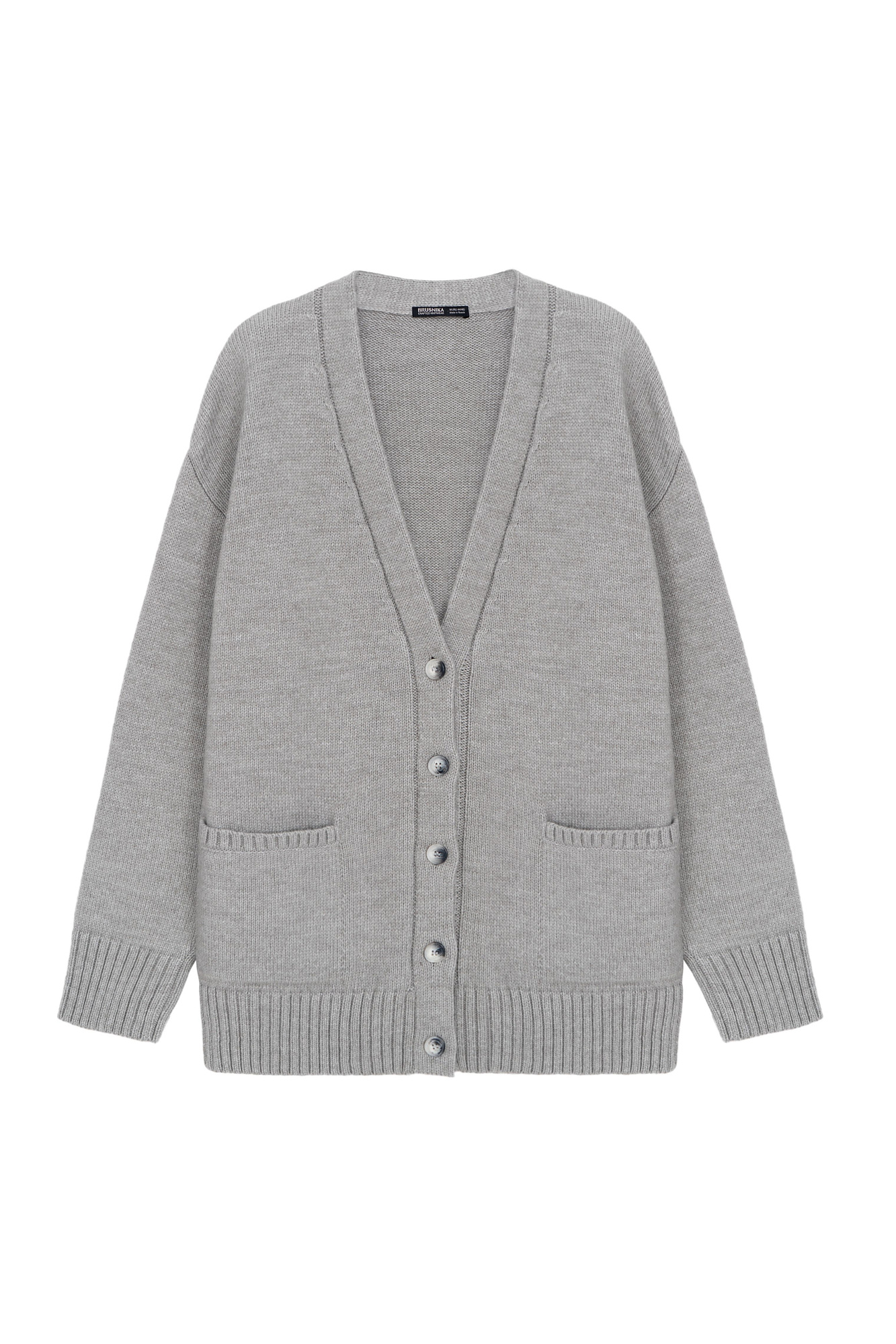 Трикотажный кардиган из шерсти альпака. Модель свободного силуэта с V-образным вырезом и накладными карманами. Края изделия в рубчик.