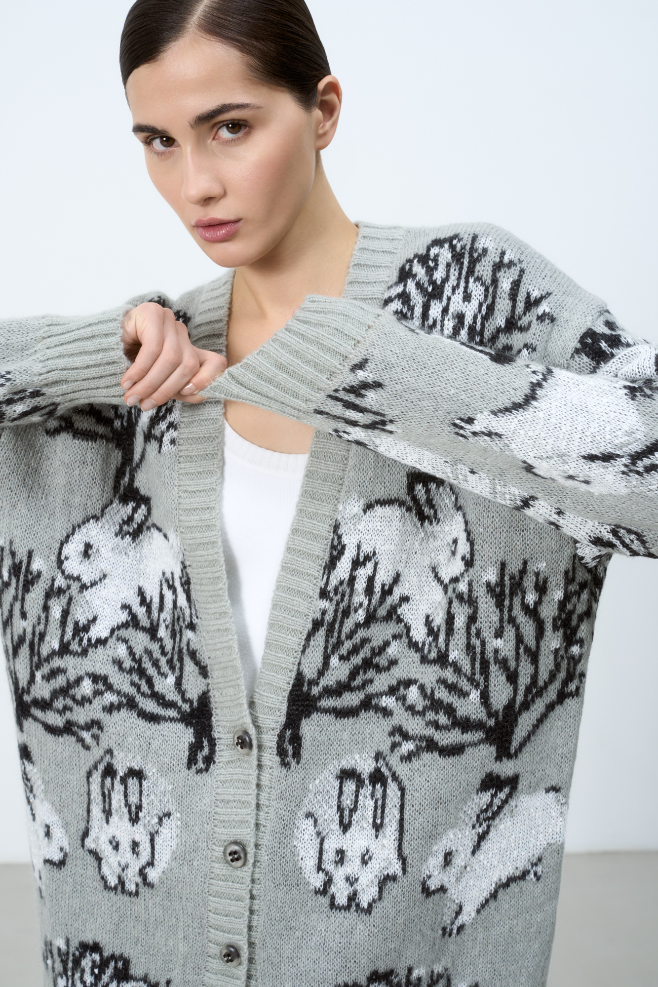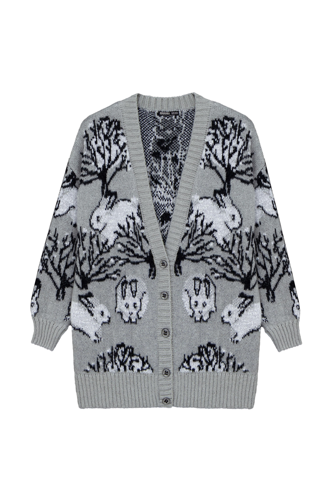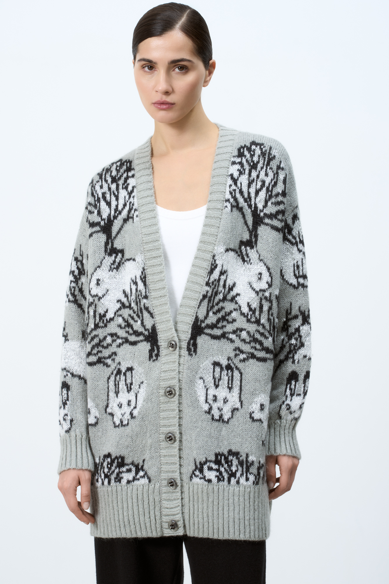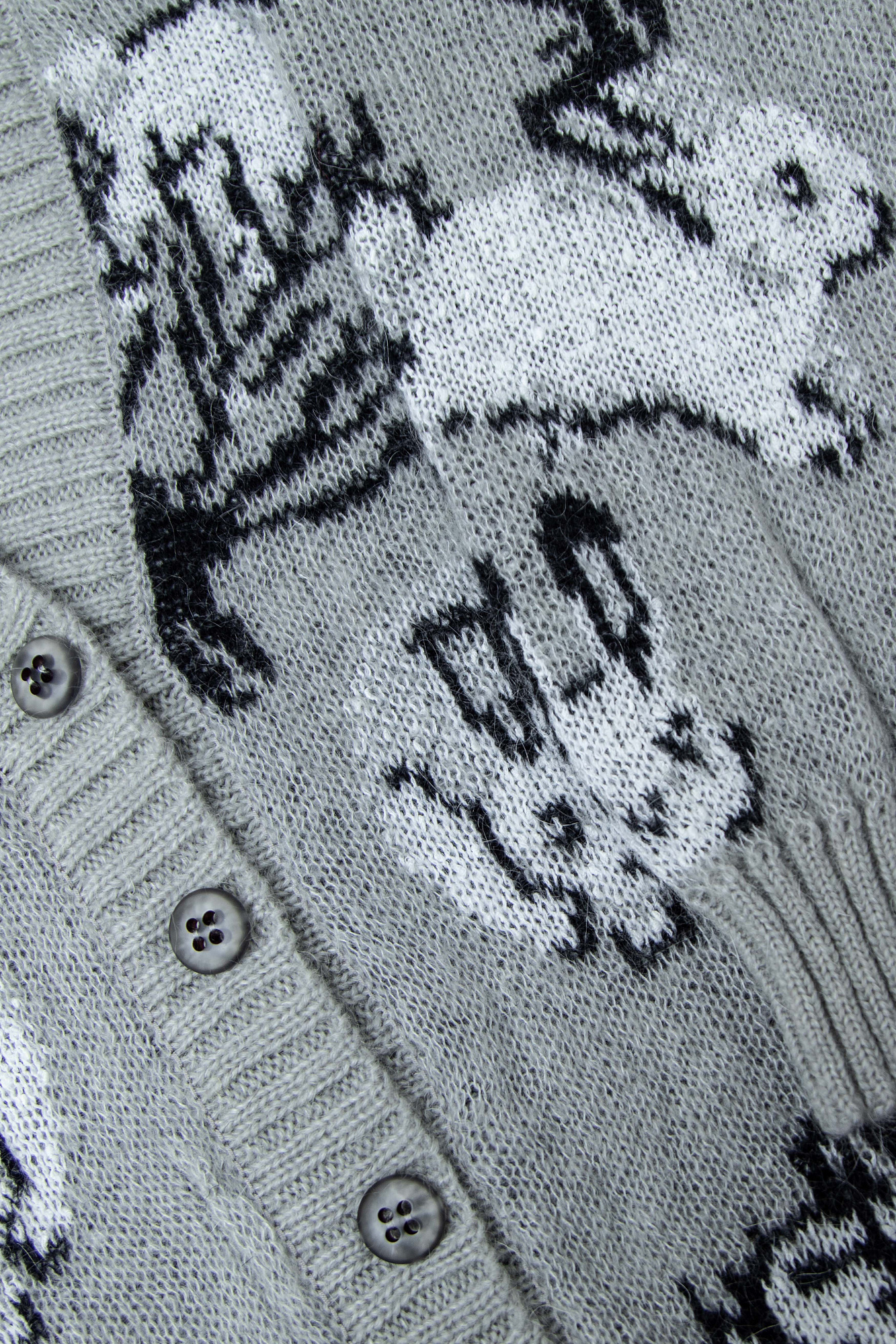 Трикотажный кардиган из смесовой шерсти с добавлением мохера. Модель с жаккардовым узором в виде зайцев. Застежка на пуговицы.