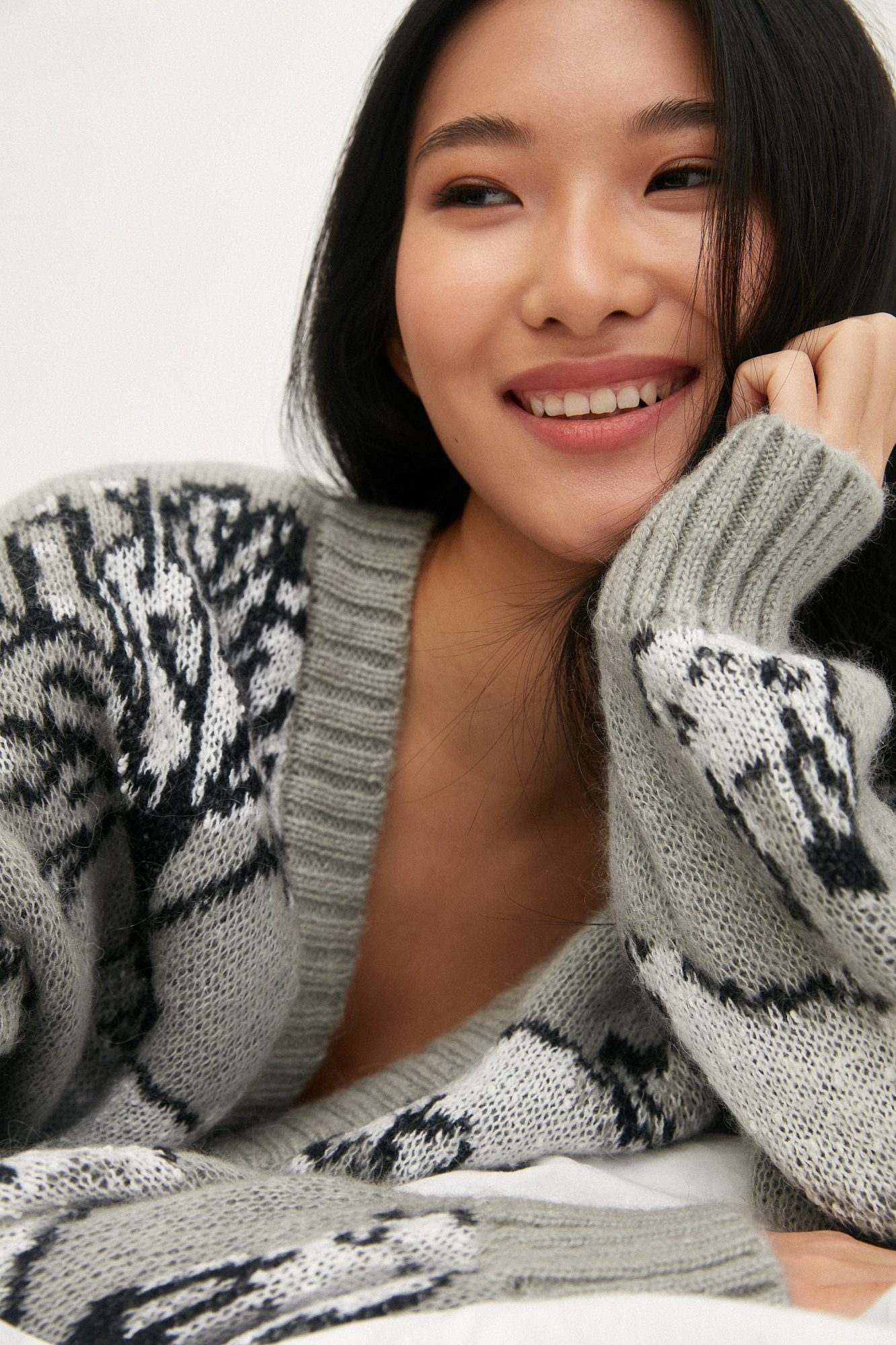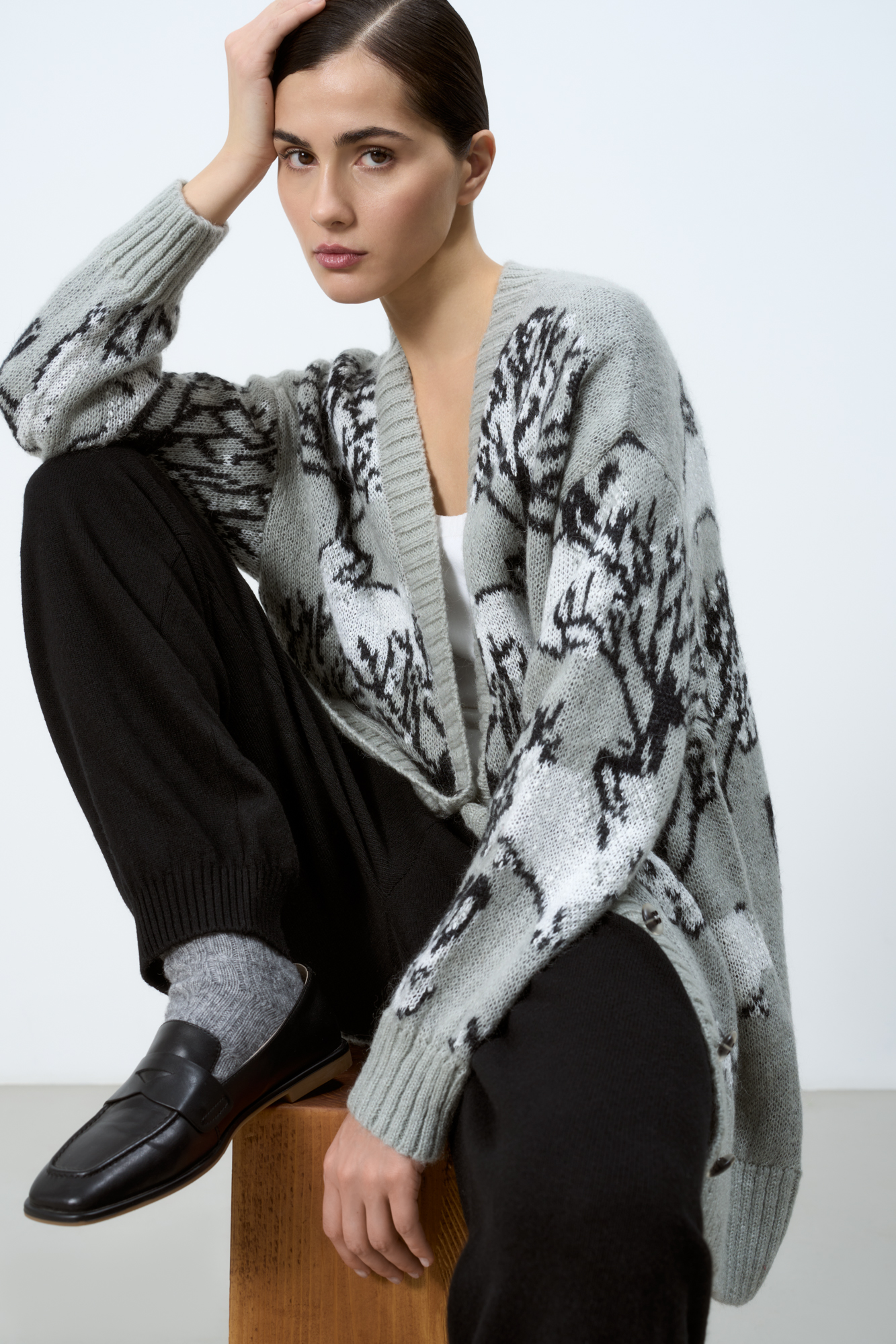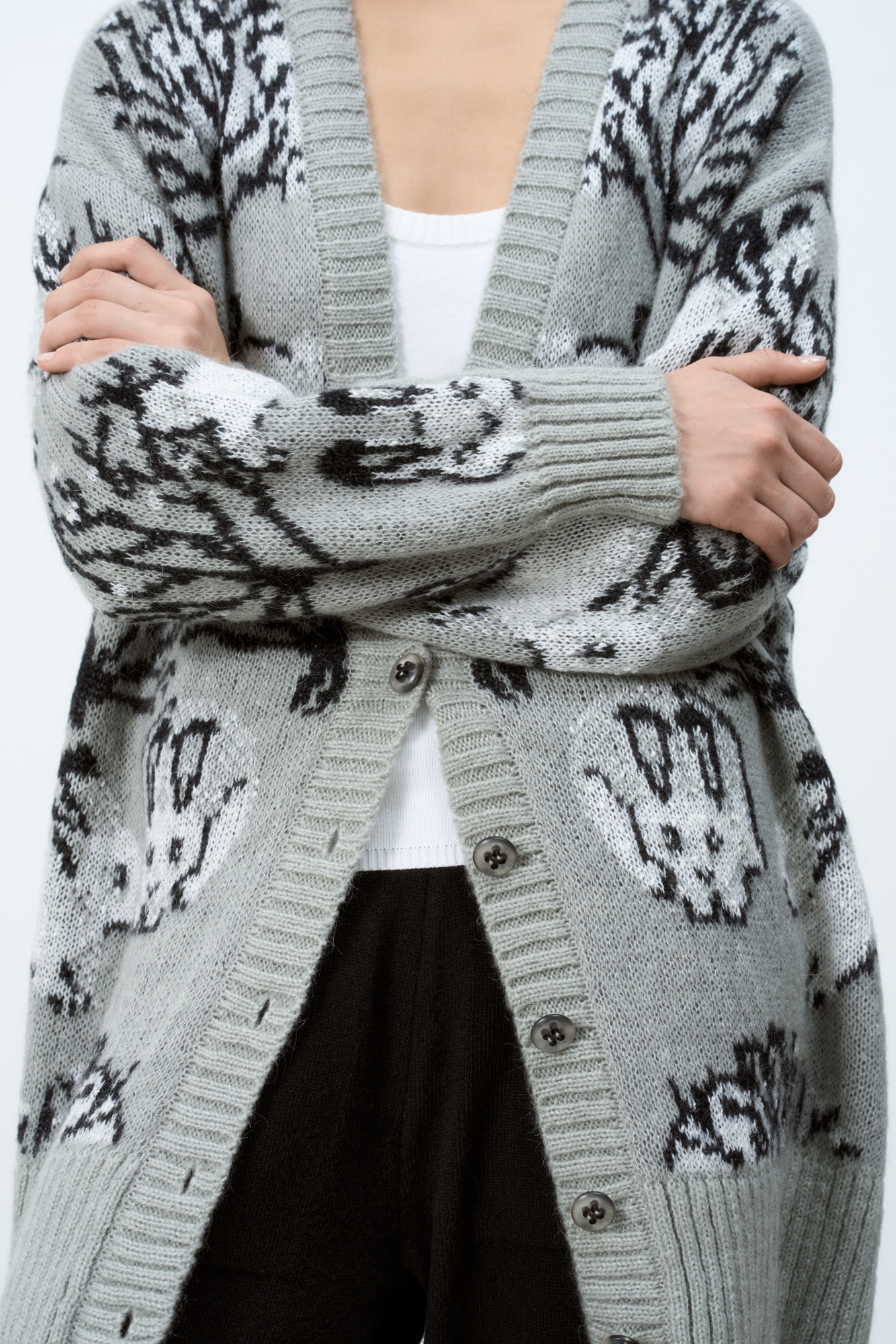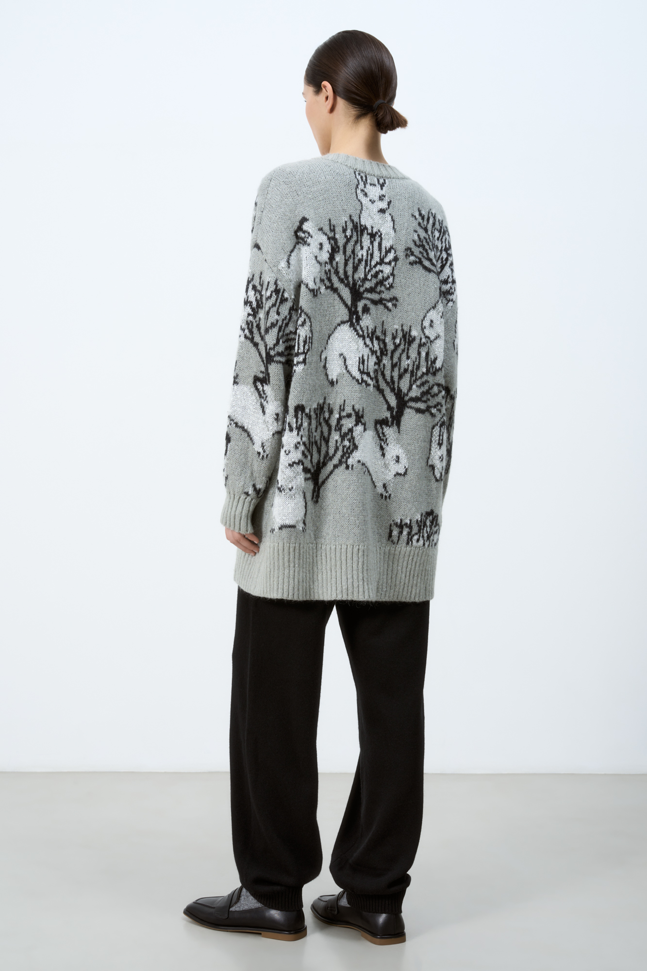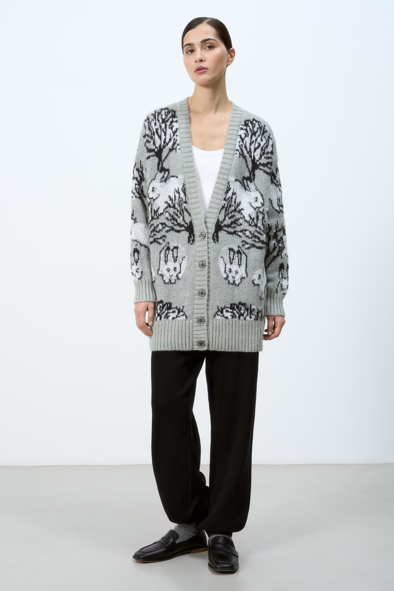 Трикотажный кардиган из смесовой шерсти с добавлением мохера. Модель с жаккардовым узором в виде зайцев. Застежка на пуговицы.