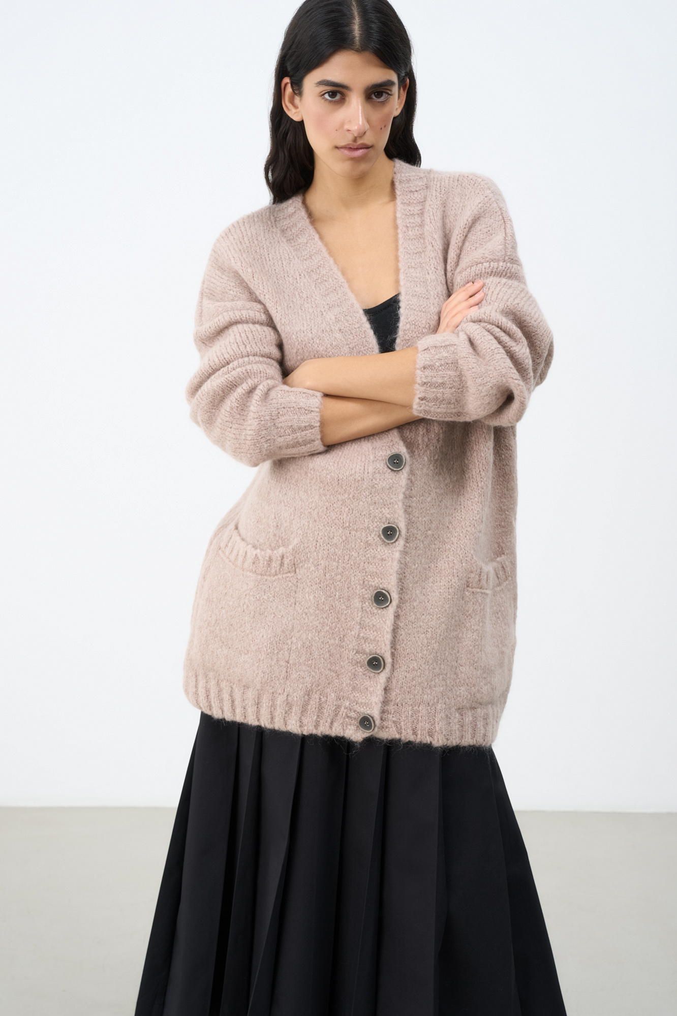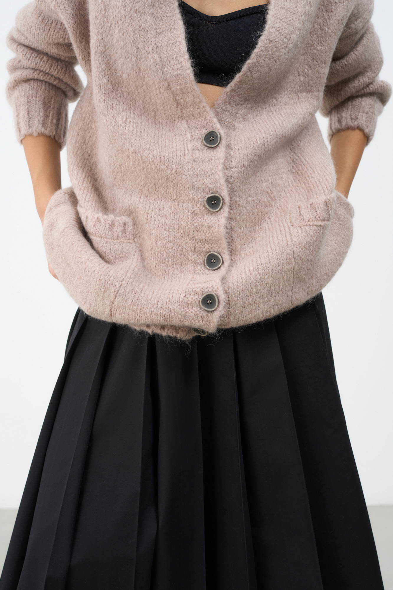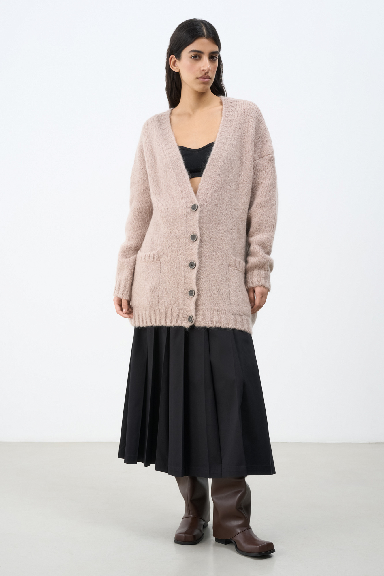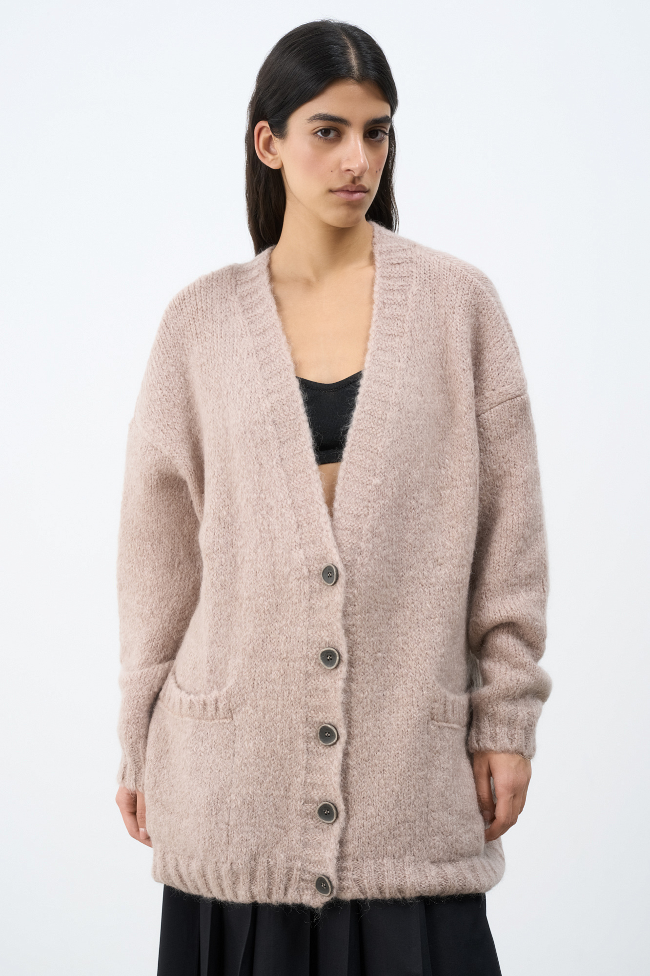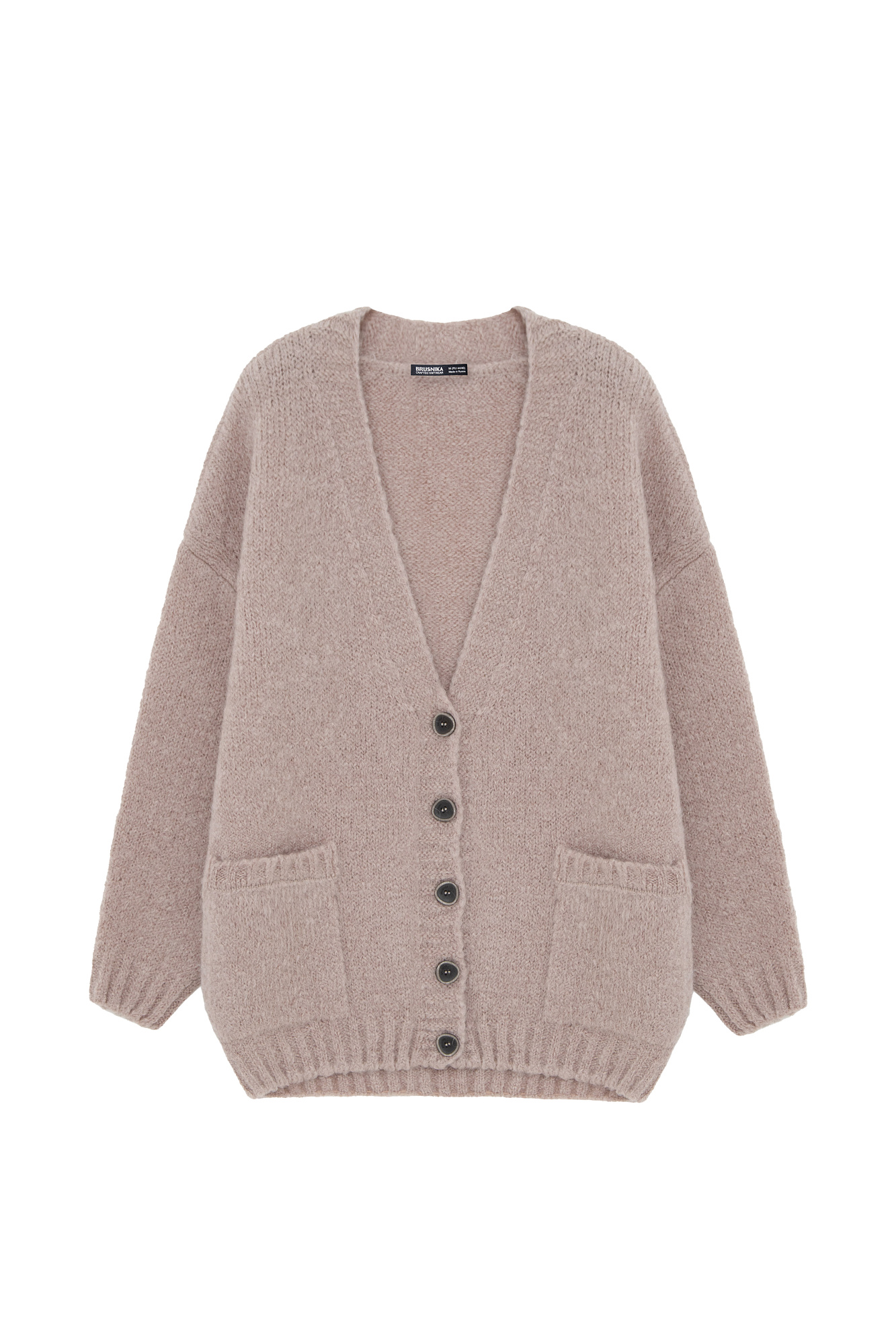 Трикотажный кардиган из мохера с накладными карманами.