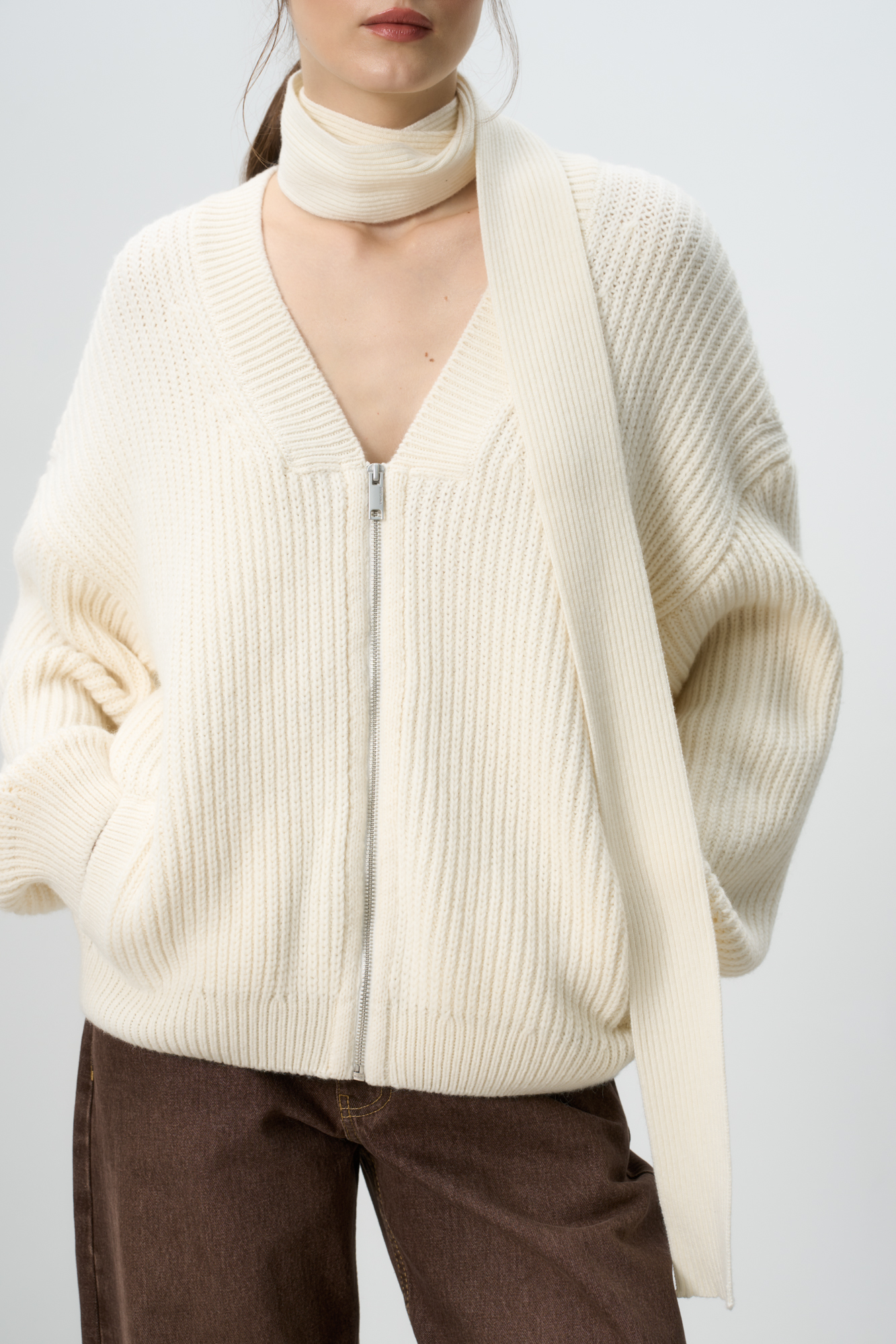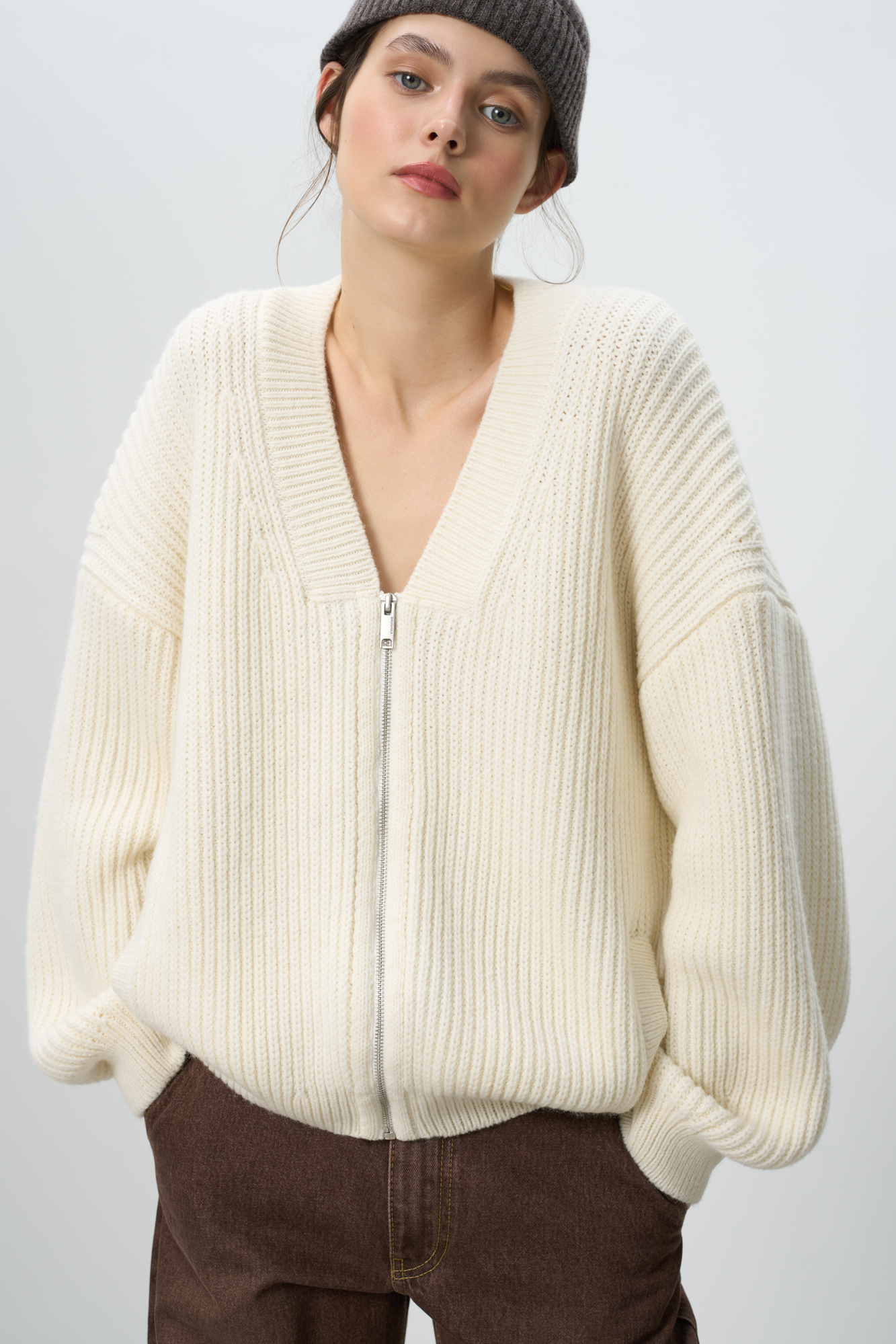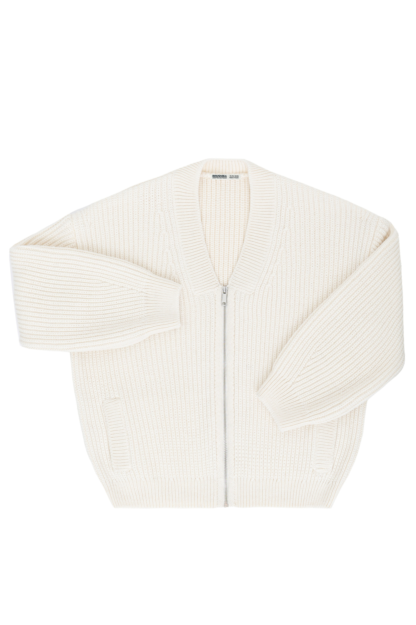 Трикотажный бомбер с боковыми карманами. Модель свободного силуэта со спущенной линией плеча и застежкой на молнию.