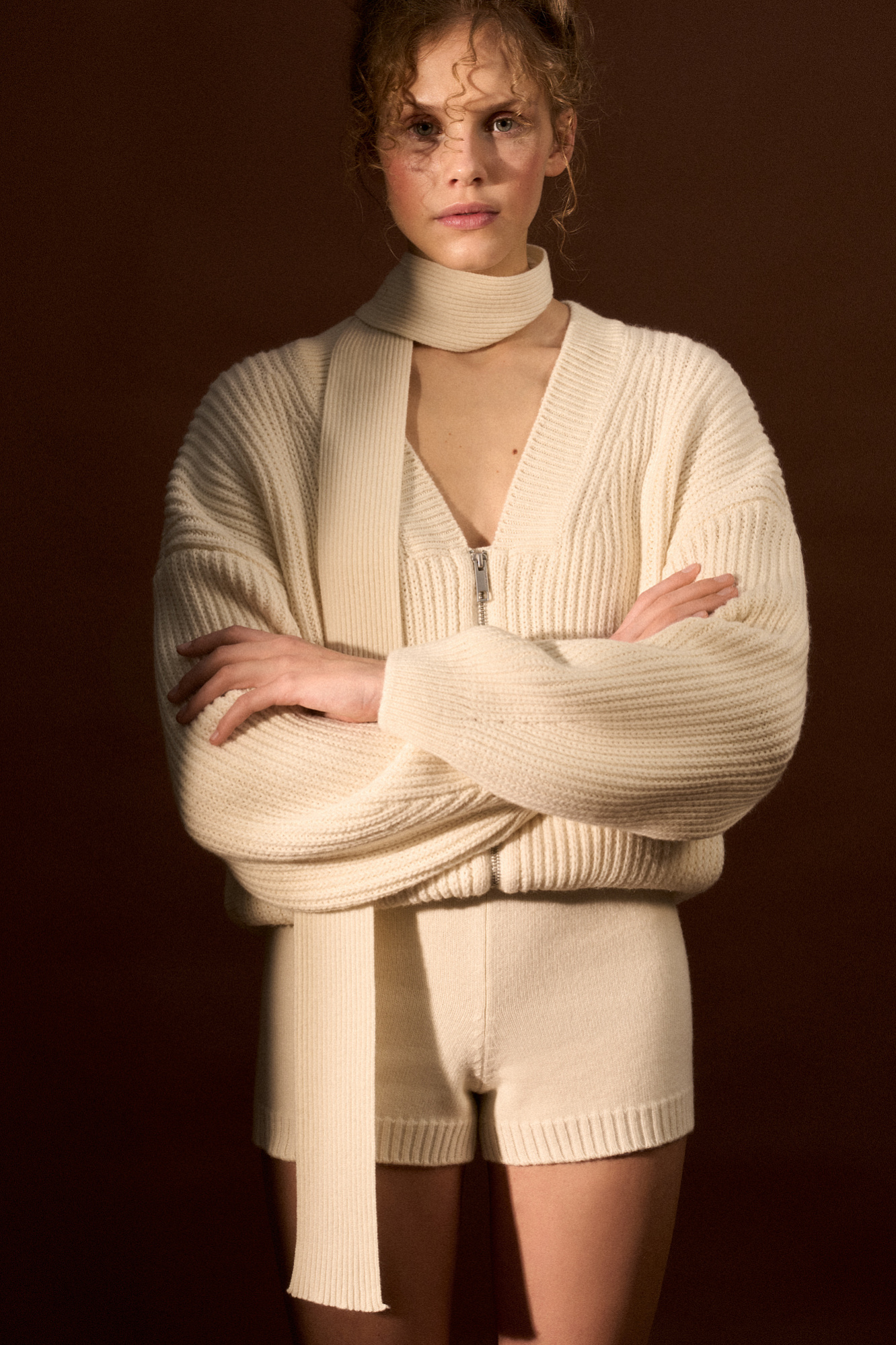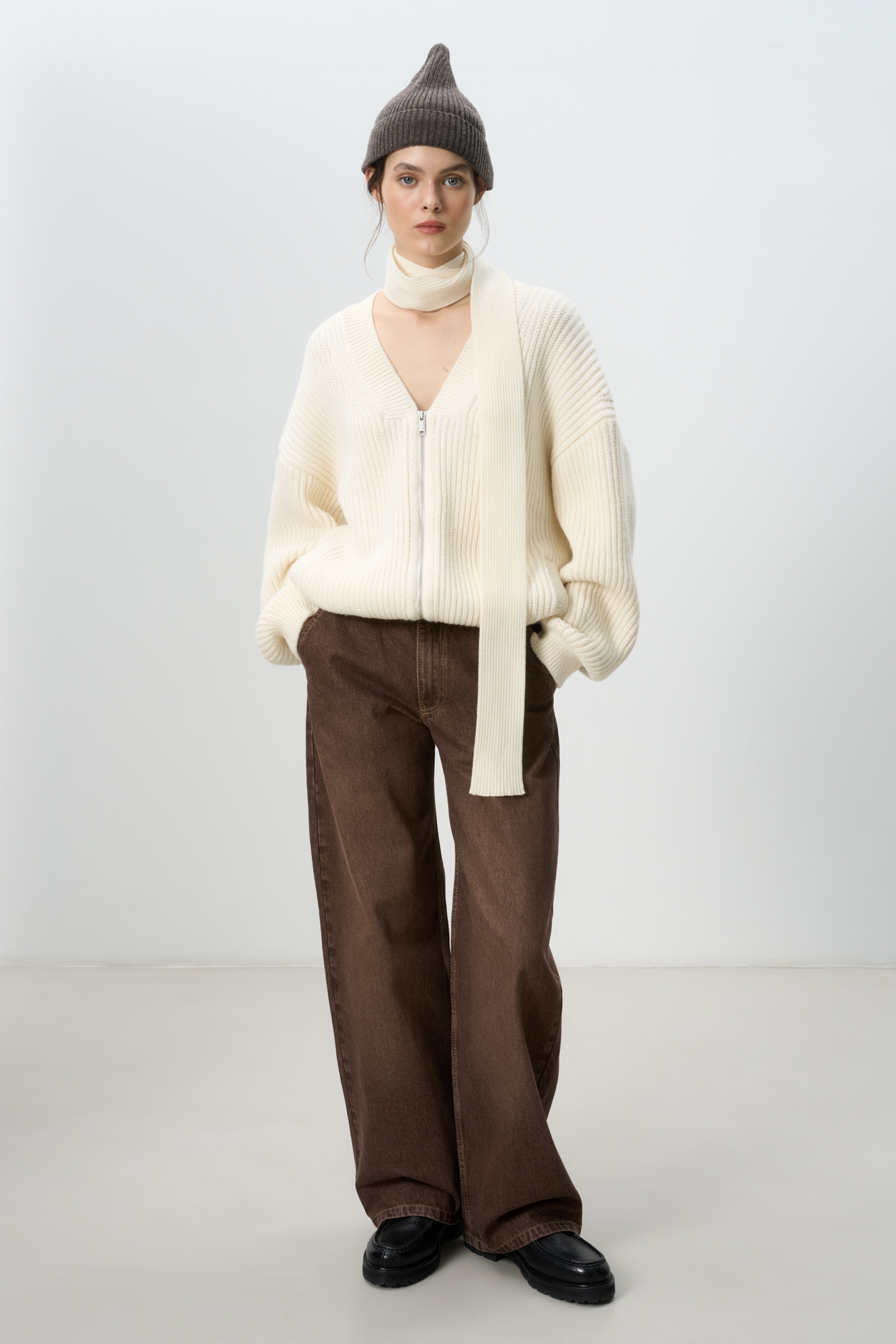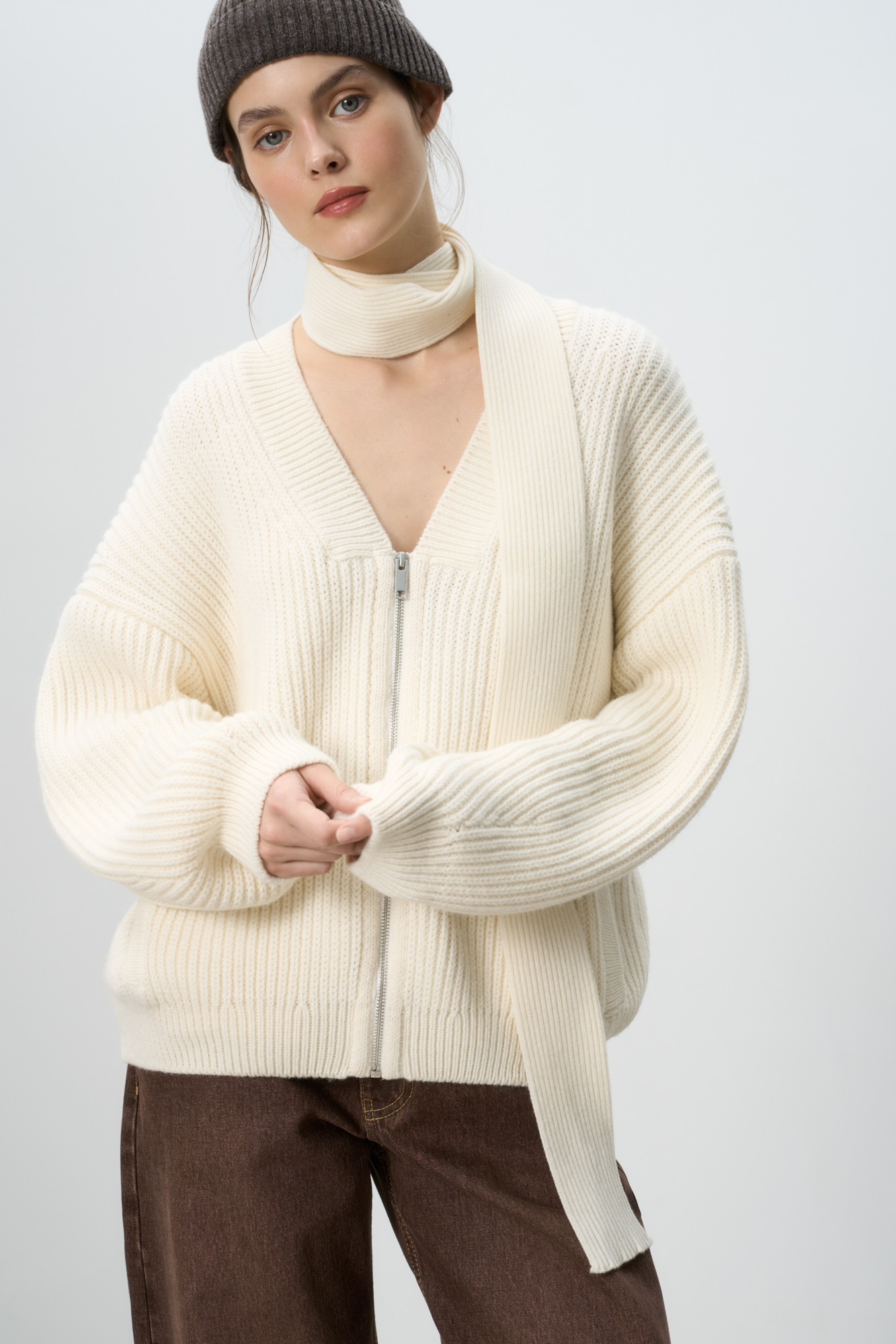 Трикотажный бомбер с боковыми карманами. Модель свободного силуэта со спущенной линией плеча и застежкой на молнию.