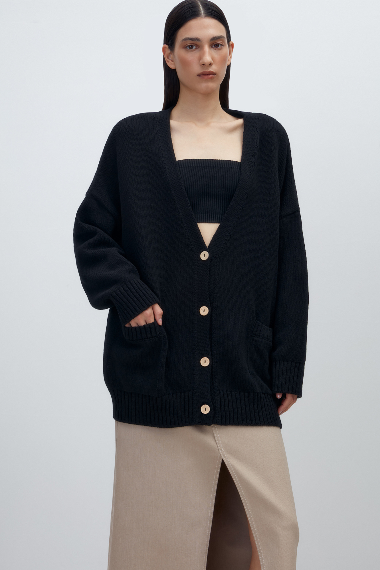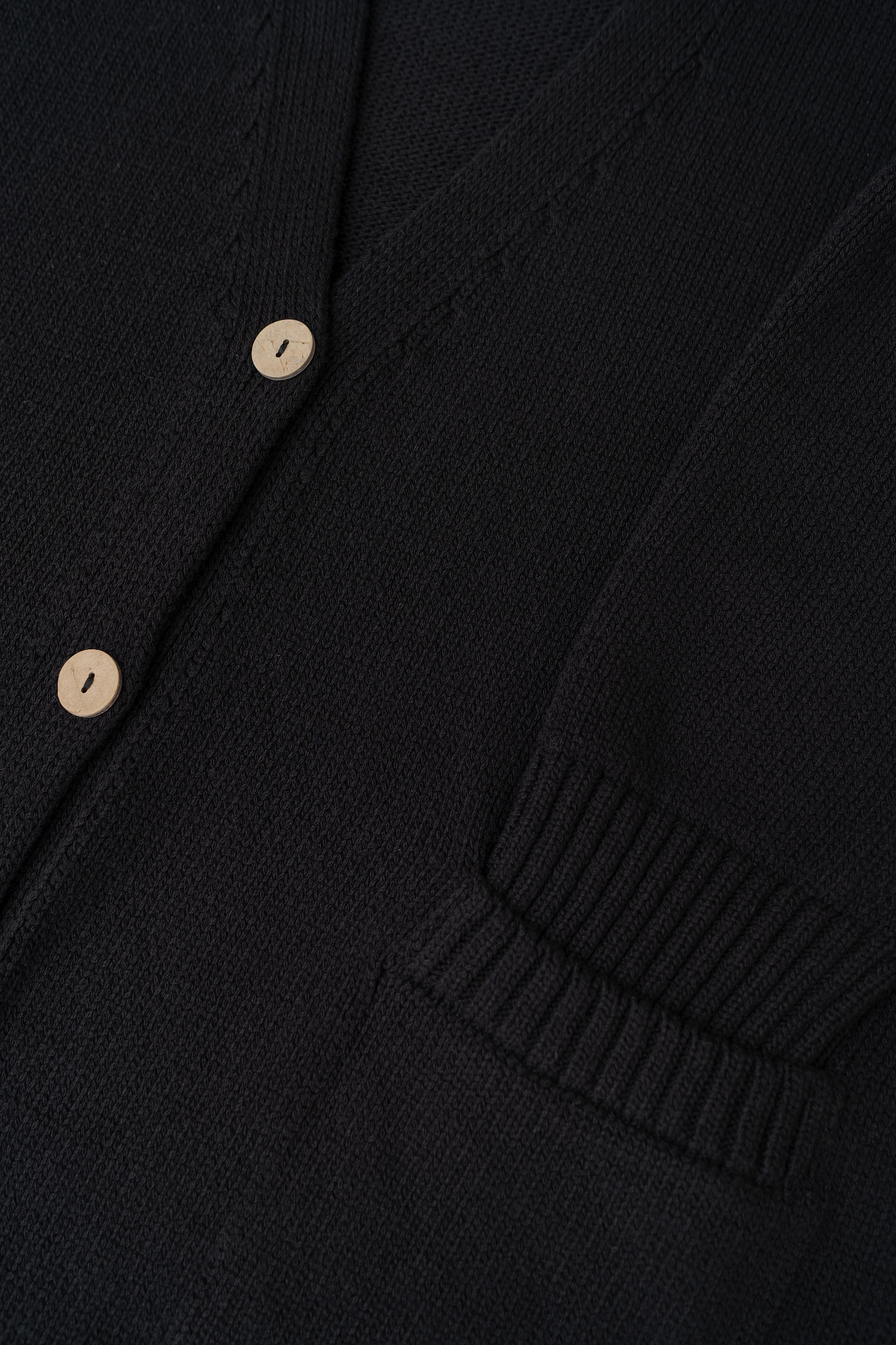Классический кардиган из 100% хлопка, со спущенным рукавом и V-образным вырезом. Манжеты и низ изделия в широкий рубчик.