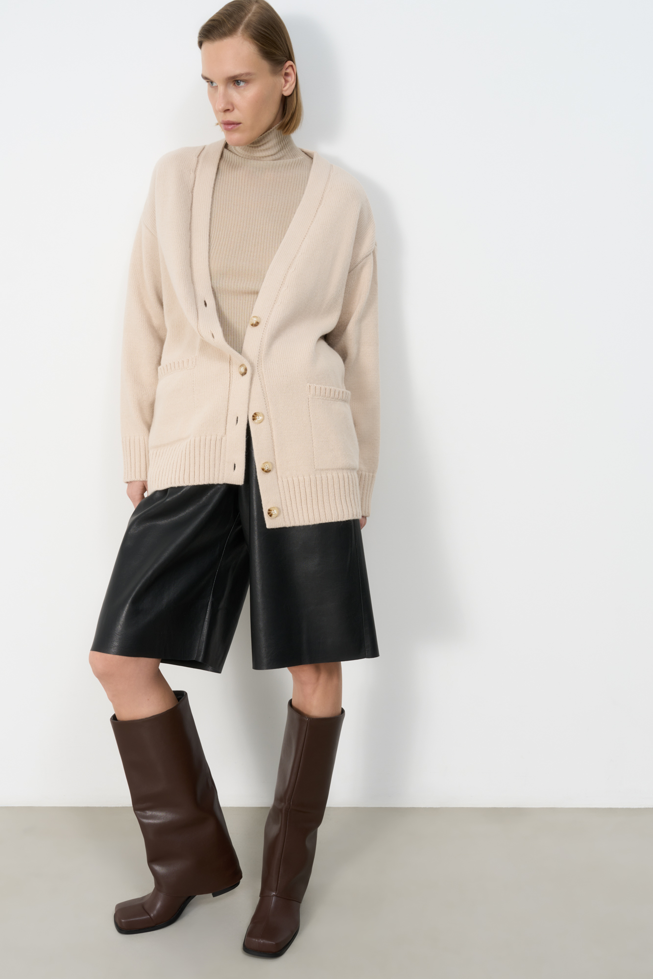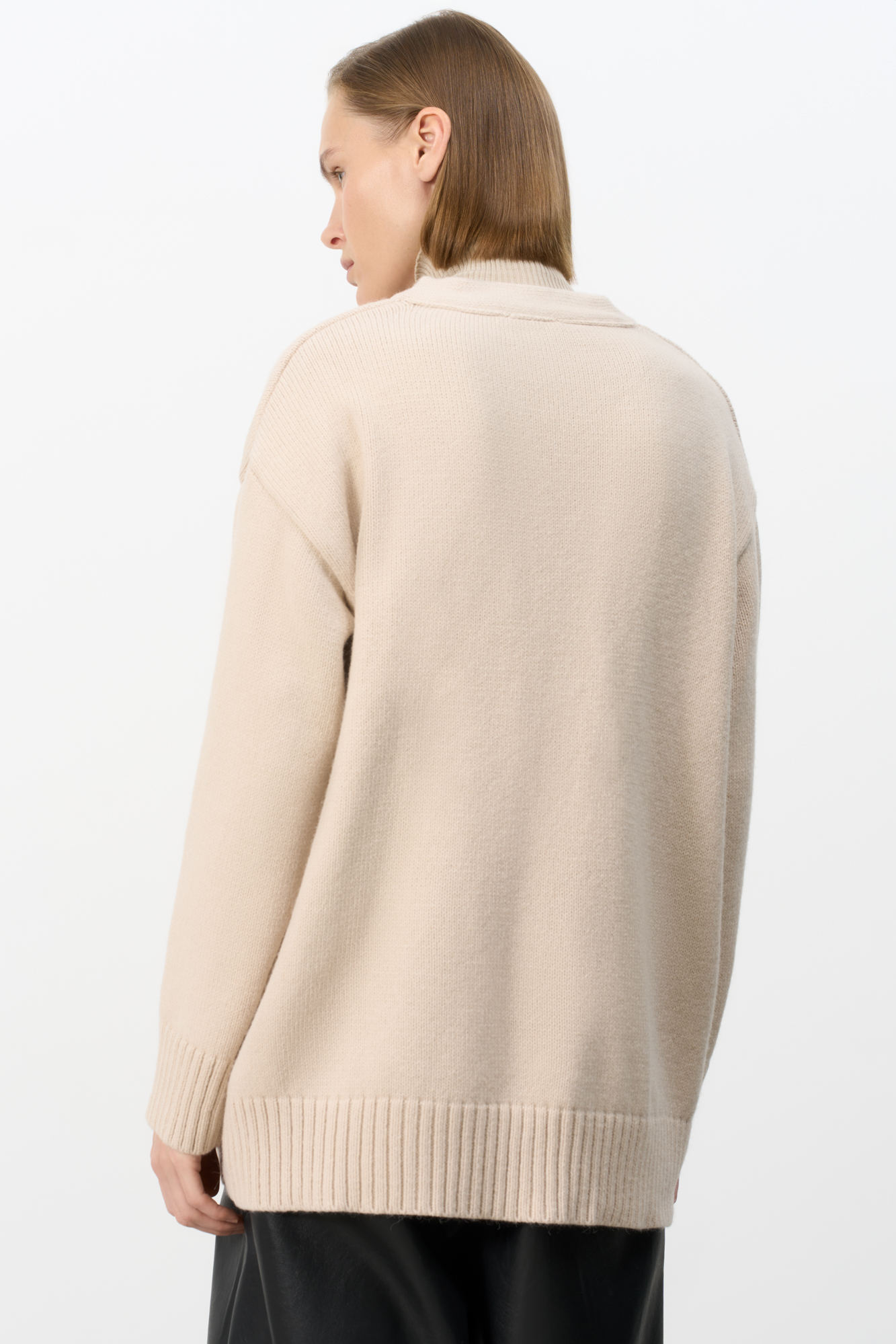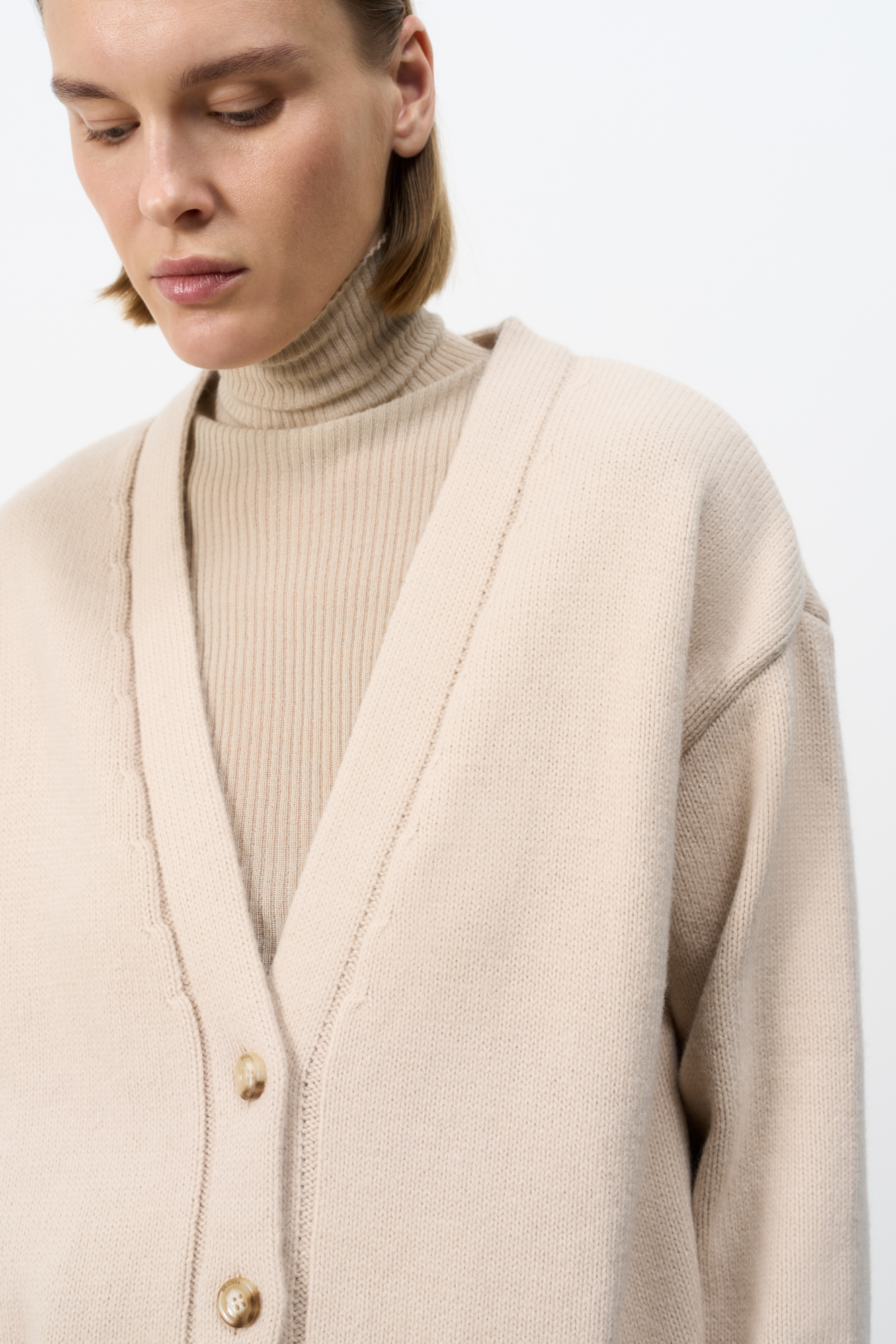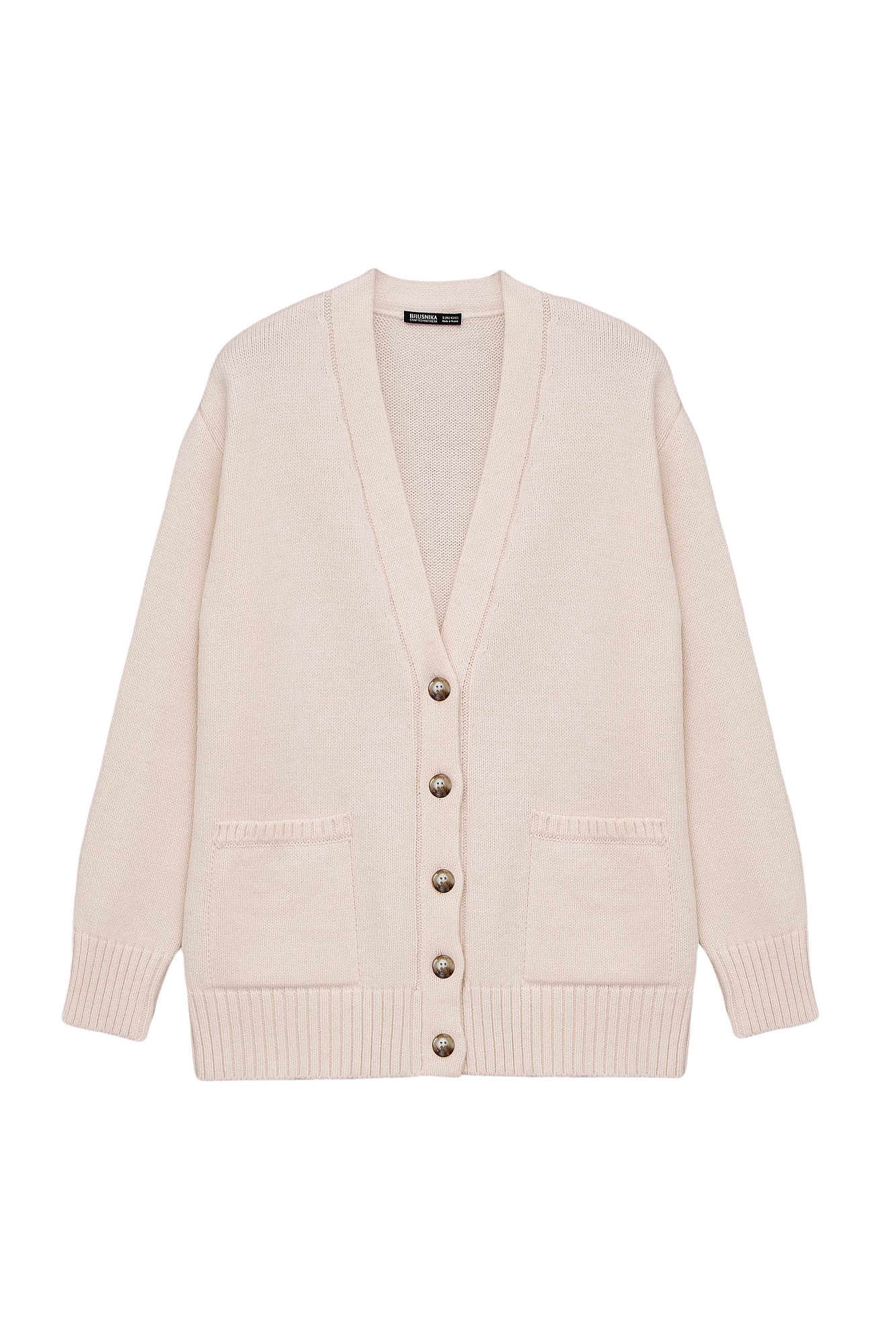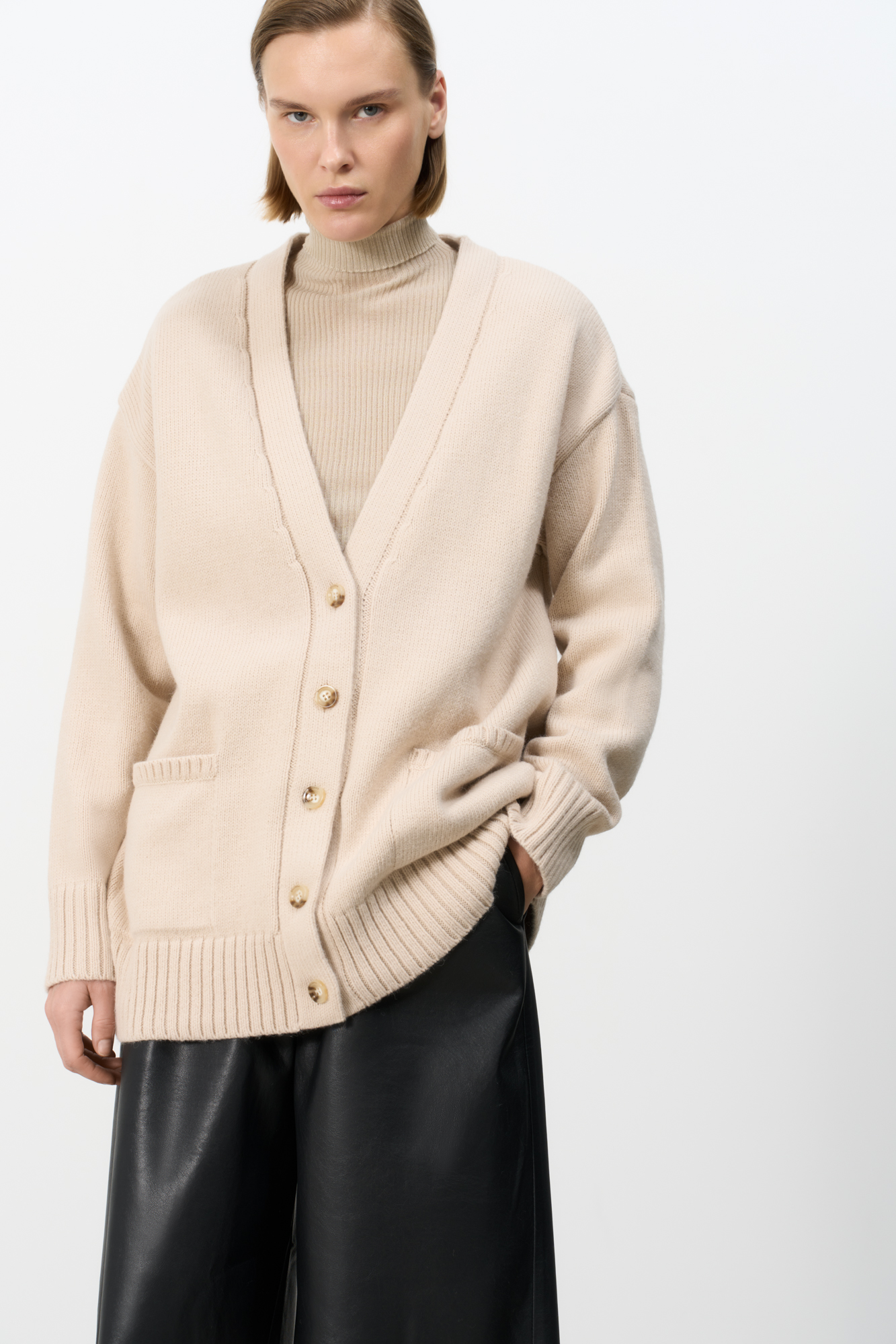 Трикотажный кардиган из шерсти альпака. Модель свободного силуэта с V-образным вырезом и накладными карманами. Края изделия в рубчик.