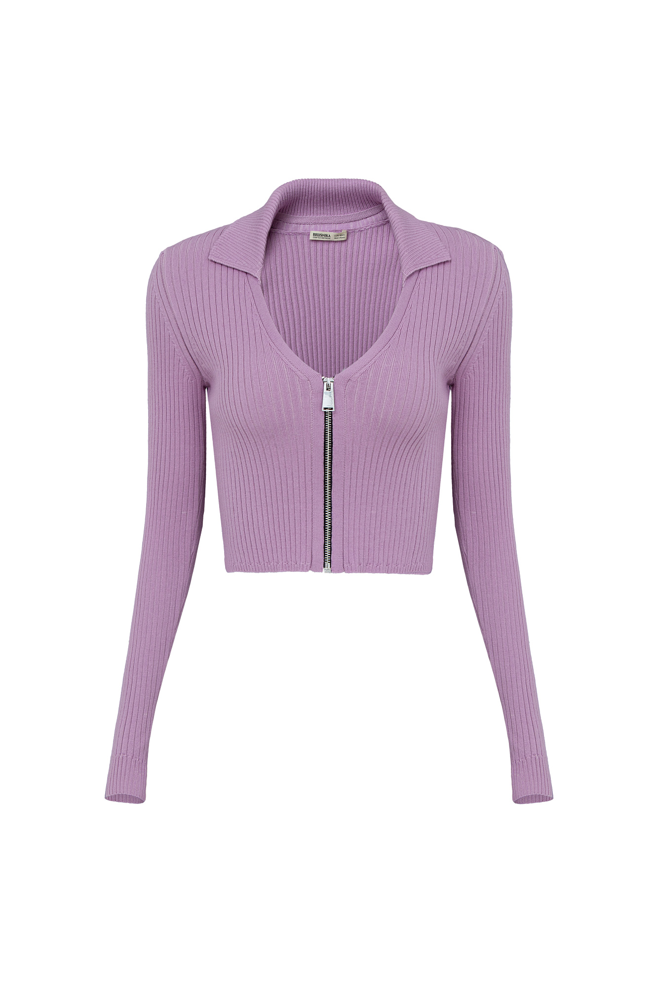 Укороченный кардиган на молнии. Модель приталенного силуэта с отложным воротником и застежкой на молнию.